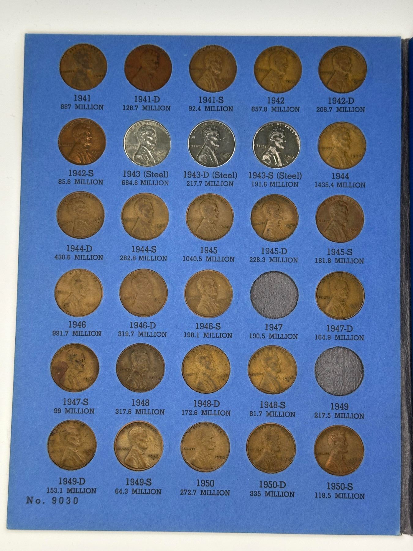 Vintage Lincoln Head cent album (starting 1941) with many wheat pennies and later issues present. Mixed dates with circulated condition coins; several empty slots. Album shows wear.