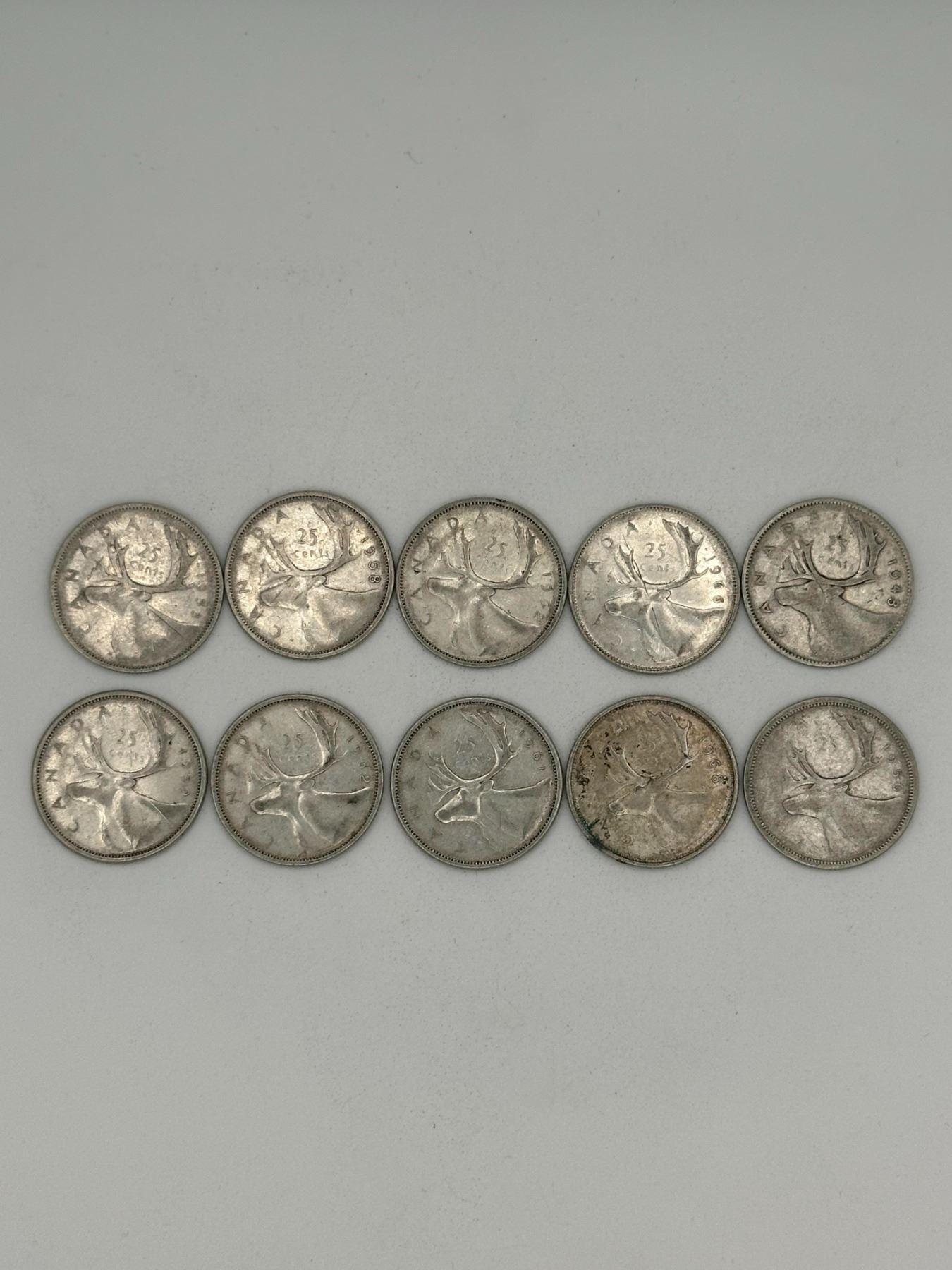 Group of Canadian 25-cent coins featuring the caribou design. Mixed dates, primarily mid-20th century. Coins show circulated condition with some toning and wear. Good silver content lot.