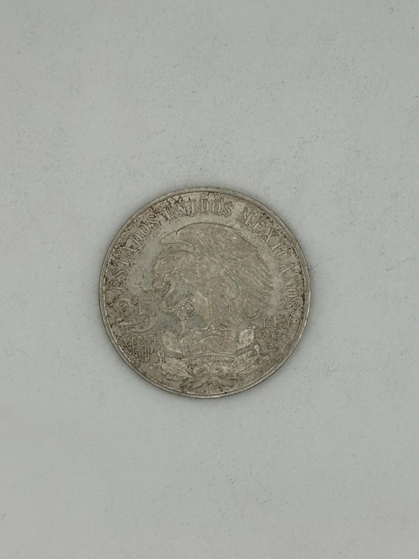 1968 Mexico 25 Pesos silver coin commemorating the Mexico City Olympics, featuring Aztec dancer design. Edge lettering visible. Circulated condition with wear and toning.
