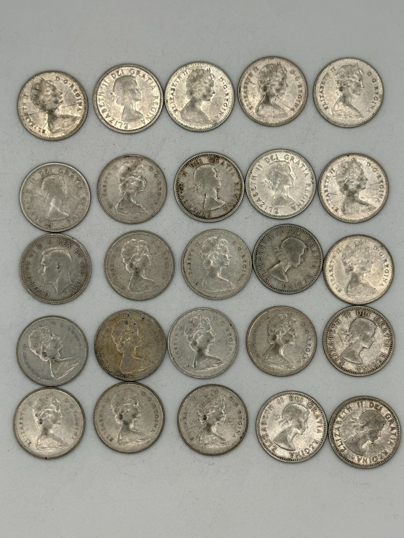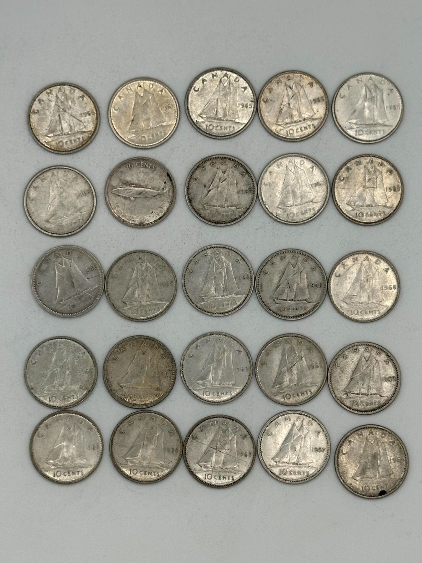 Lot of 25 dimes. Mixed group of Canadian 10 cent coins, primarily 1950s–1960s issues; Bluenose design, circulated condition.