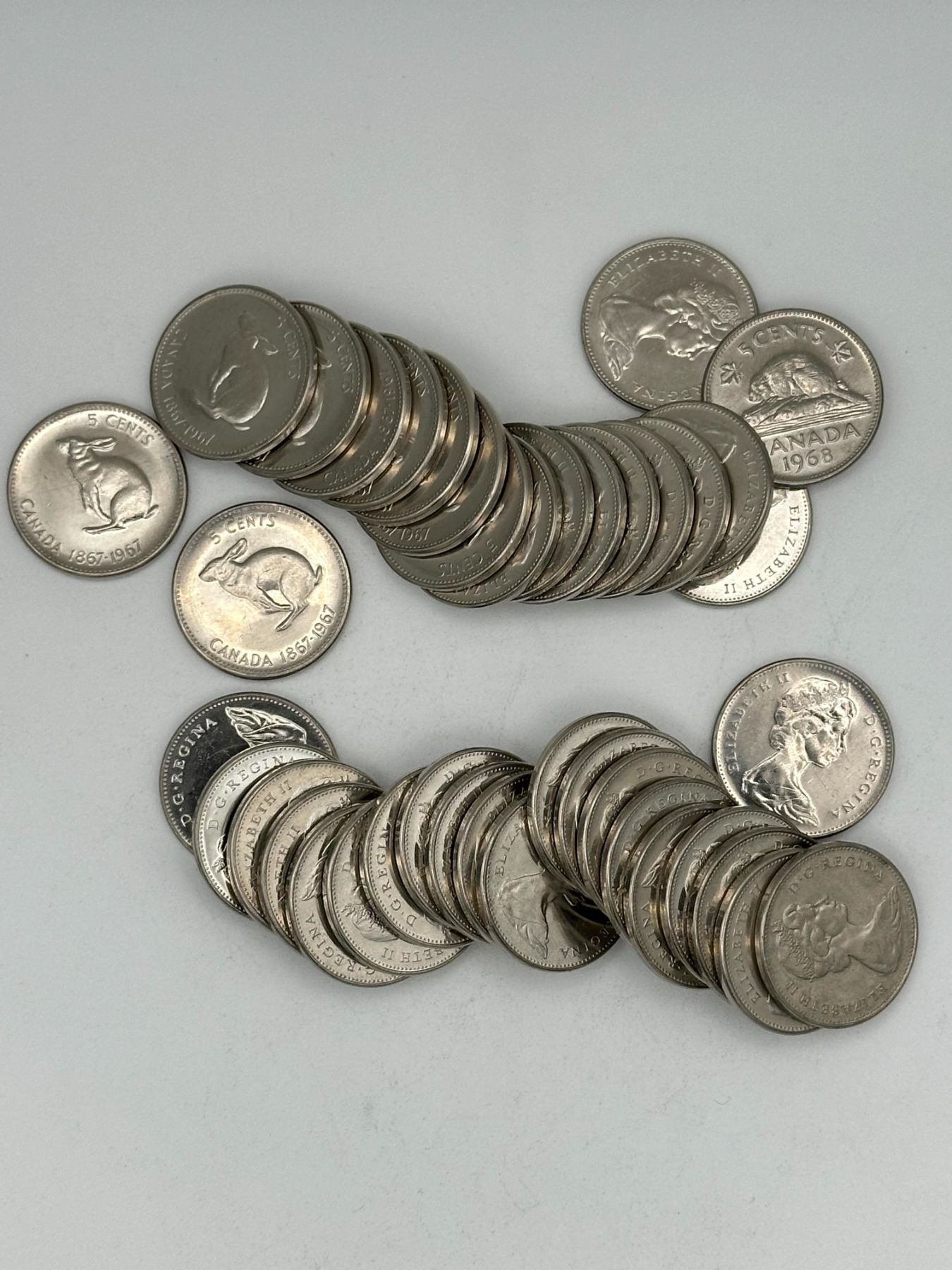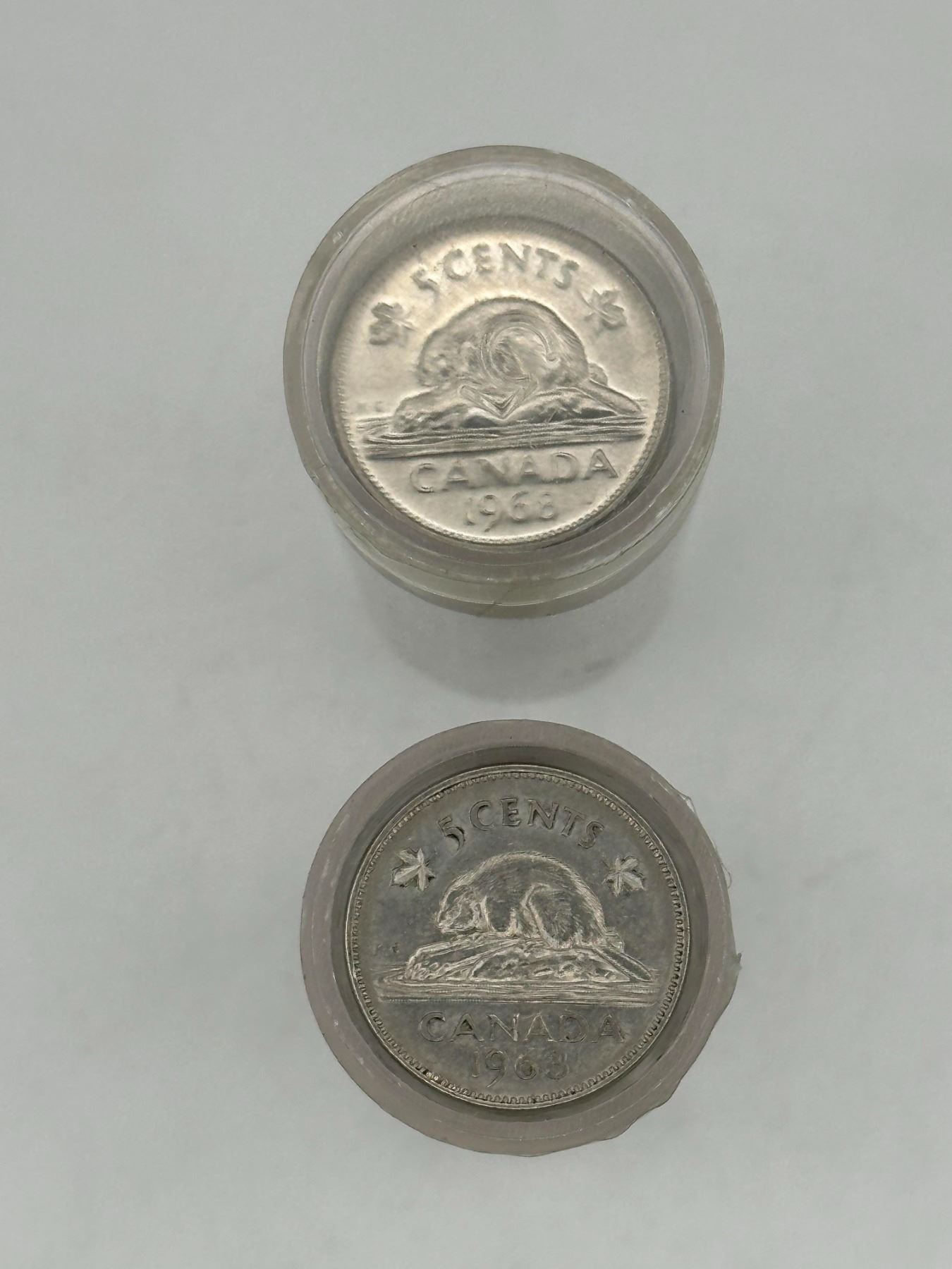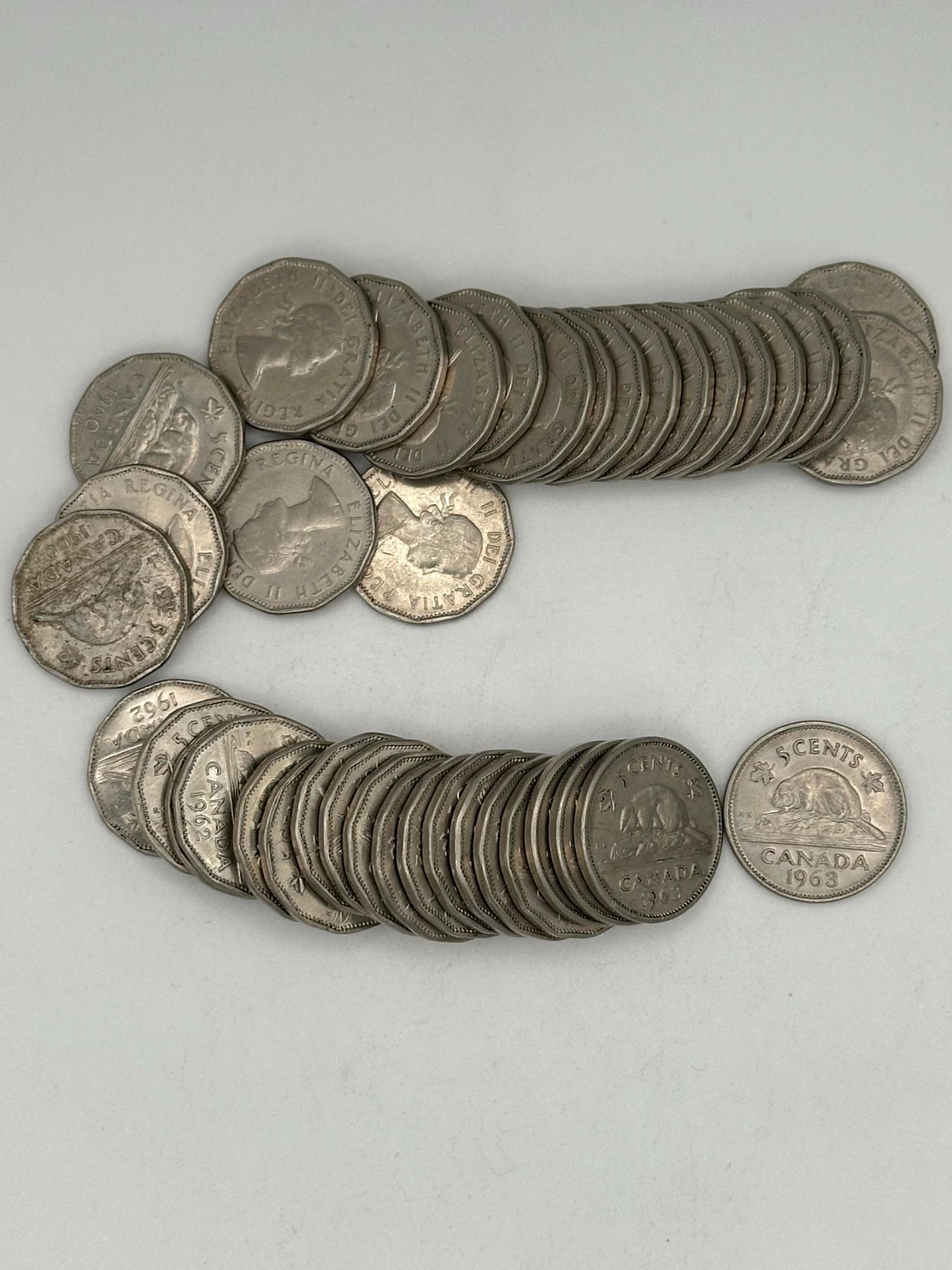 Two full rolls of Canadian 5 cent coins; mainly 1960s issues (including 1963–1968).