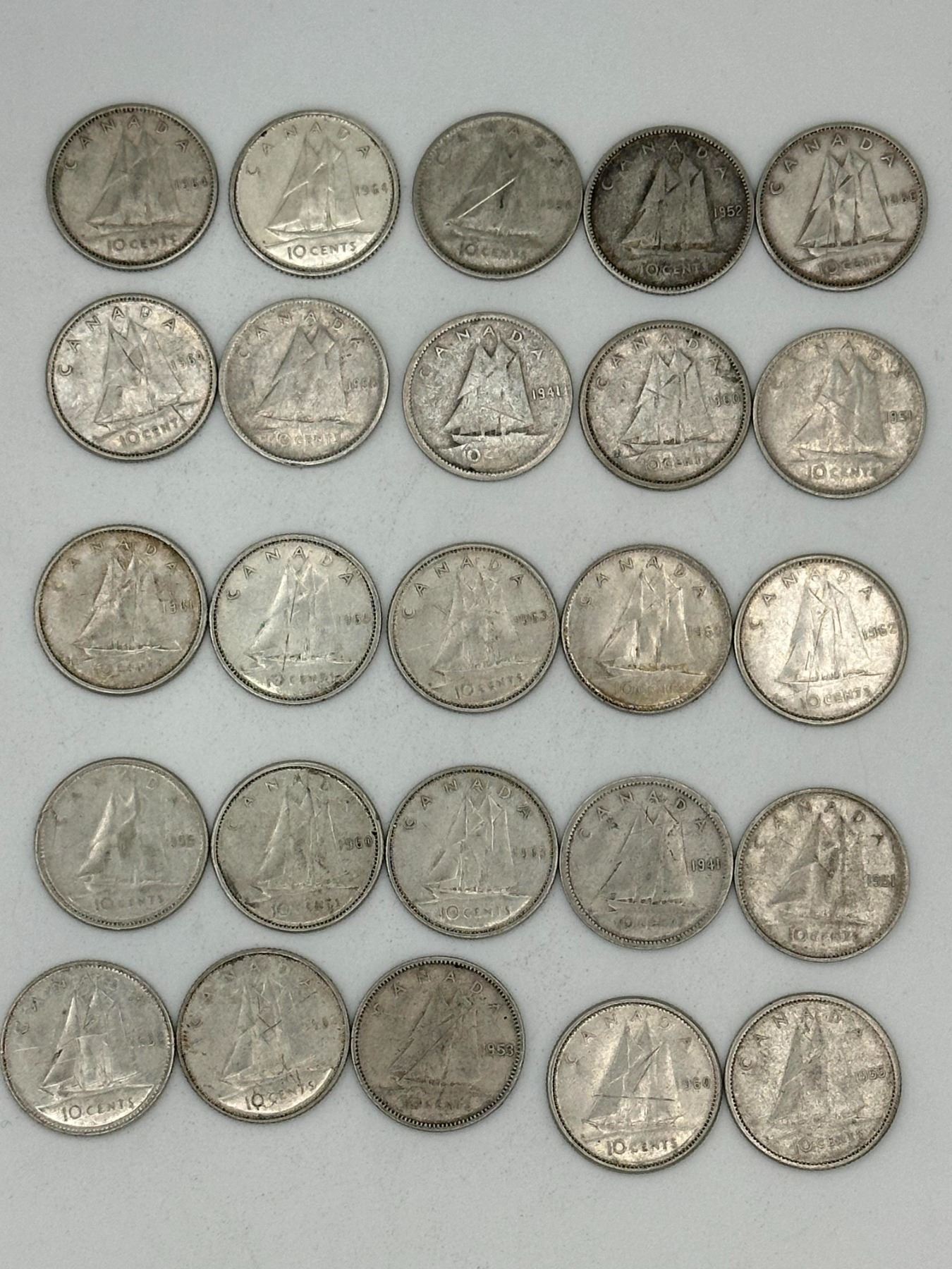Lot of 25 dimes. Mixed group of Canadian 10 cent coins including earlier dates (1940s–1960s); Bluenose design, circulated condition.