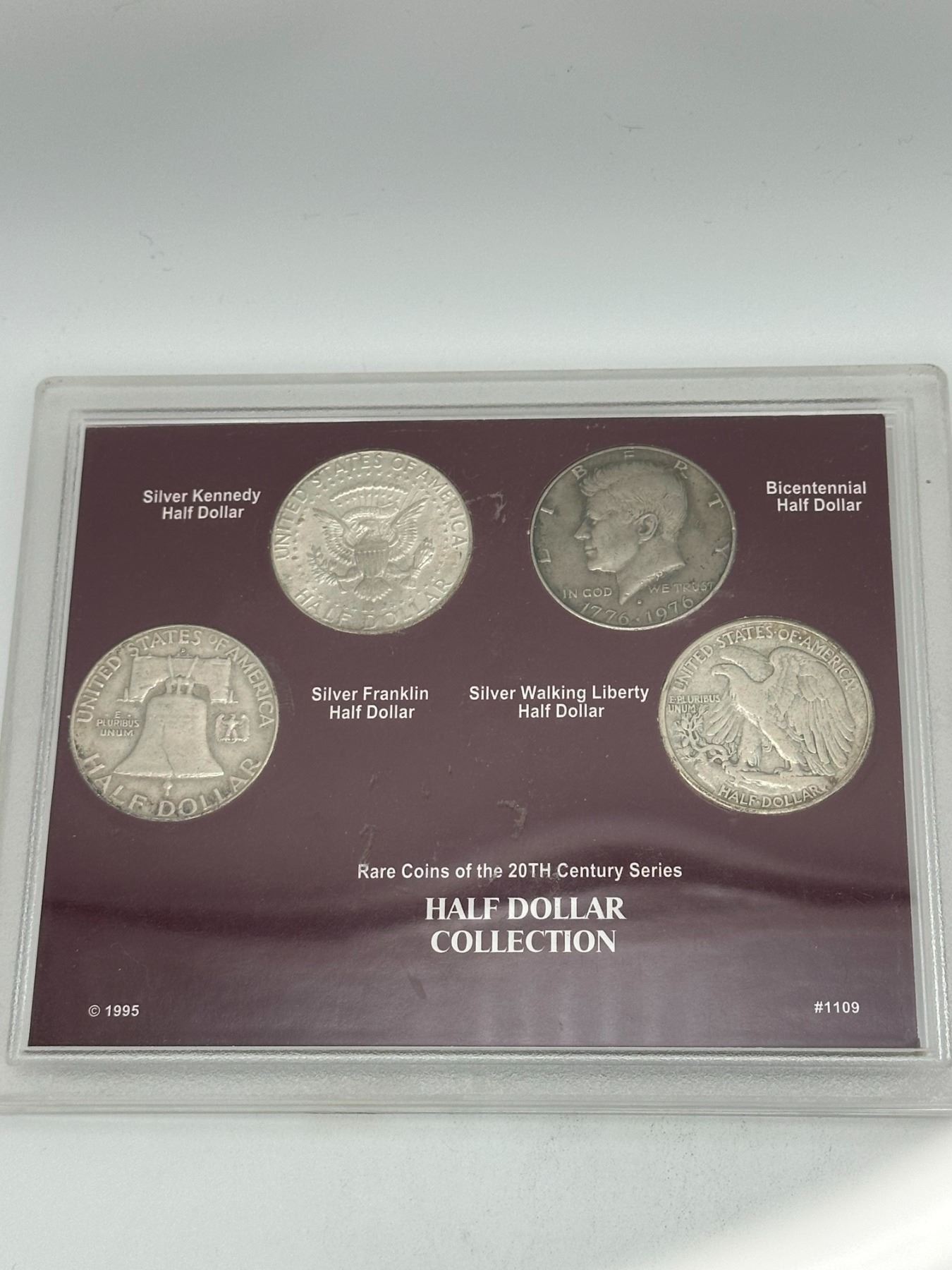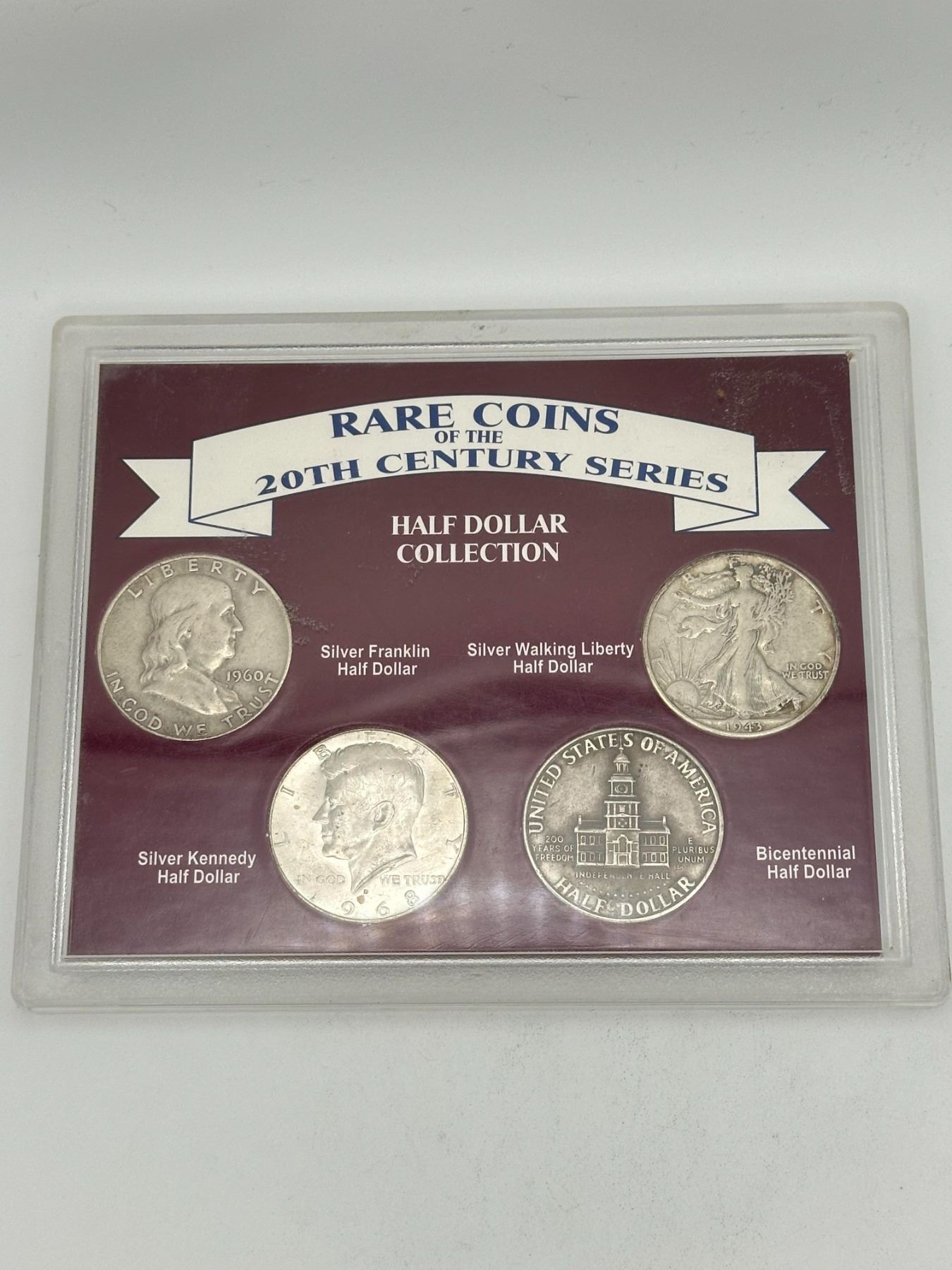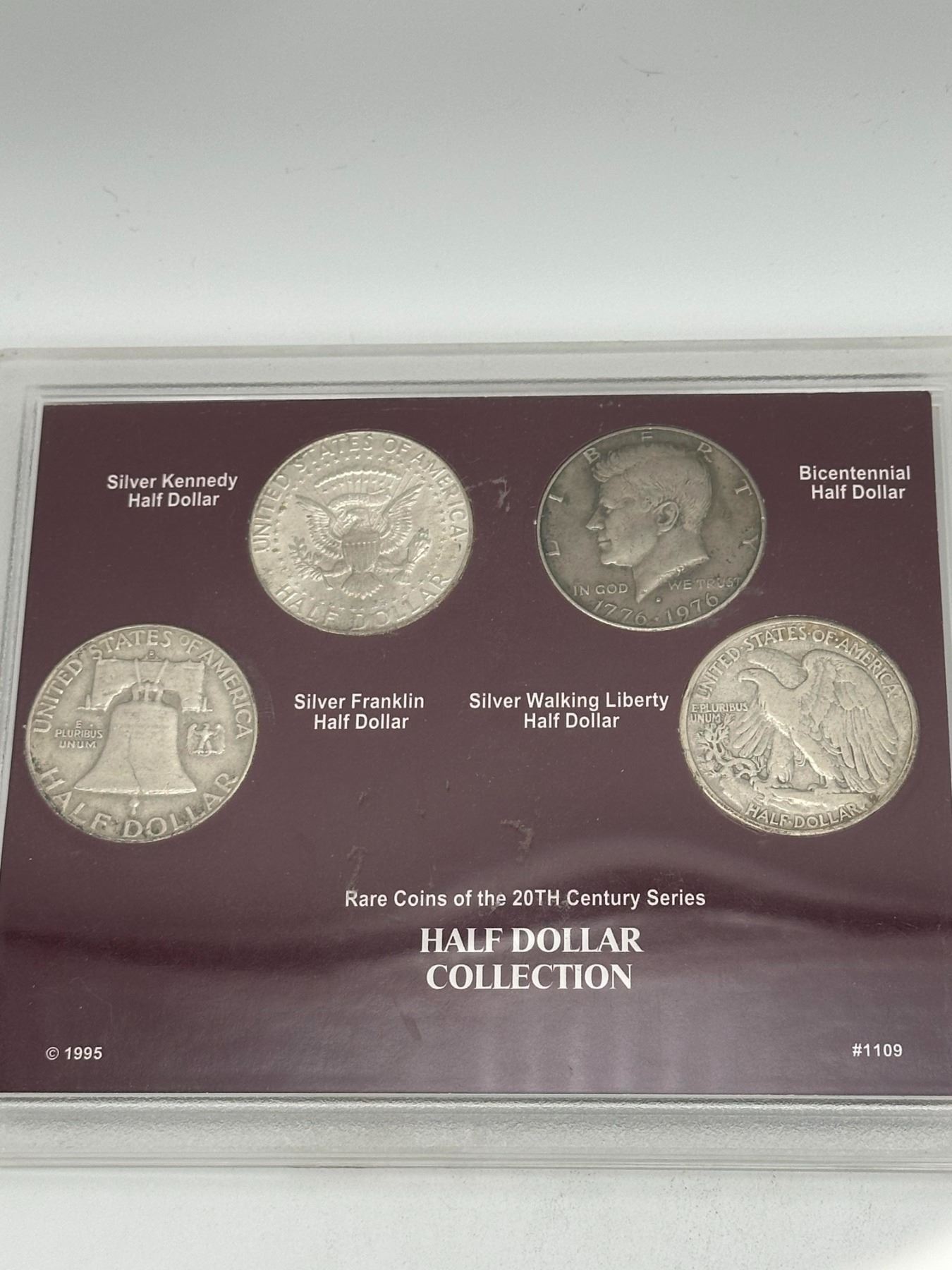 Display set featuring Franklin, Walking Liberty (1943), Kennedy (1968), and Bicentennial half dollars in holder.