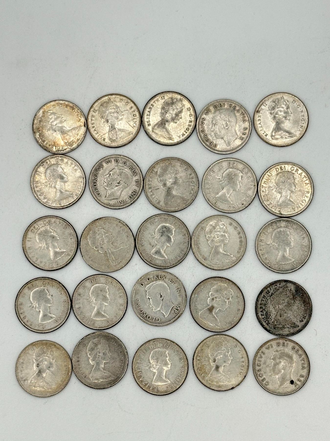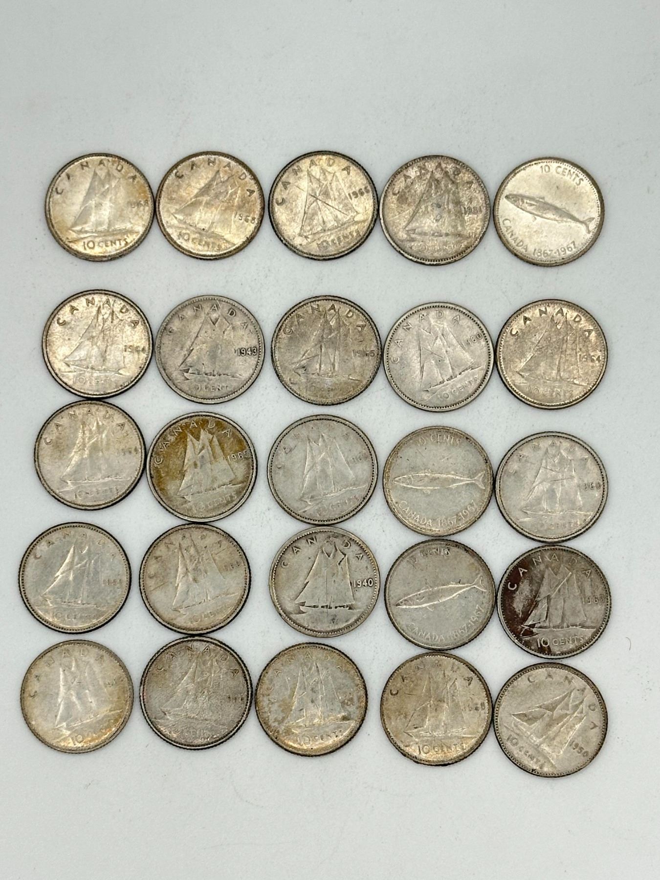 Lot of 25 dimes. Mixed group of Canadian silver dimes including 1940s–60s dates with some 1967 Centennial fish designs, circulated condition.