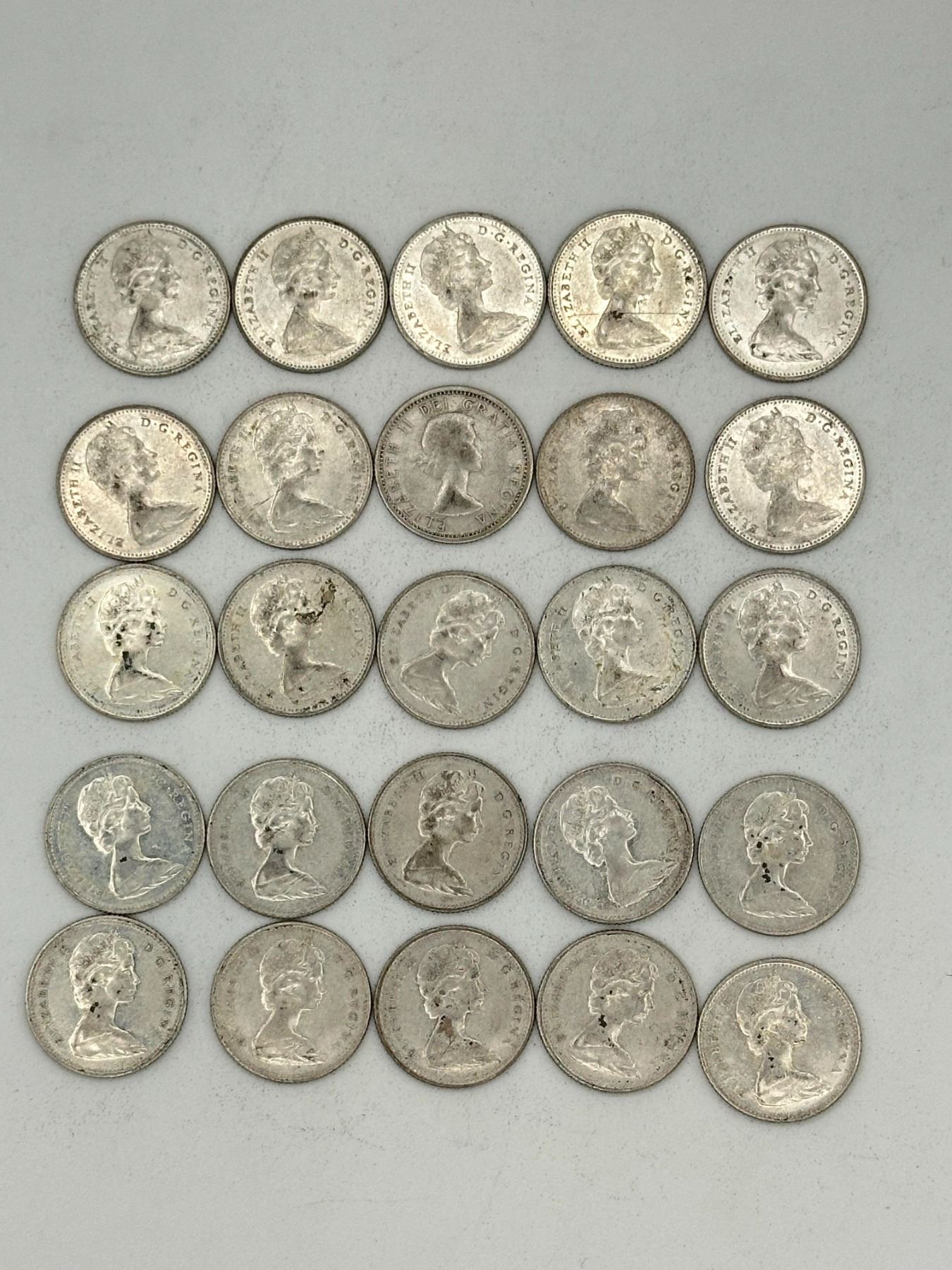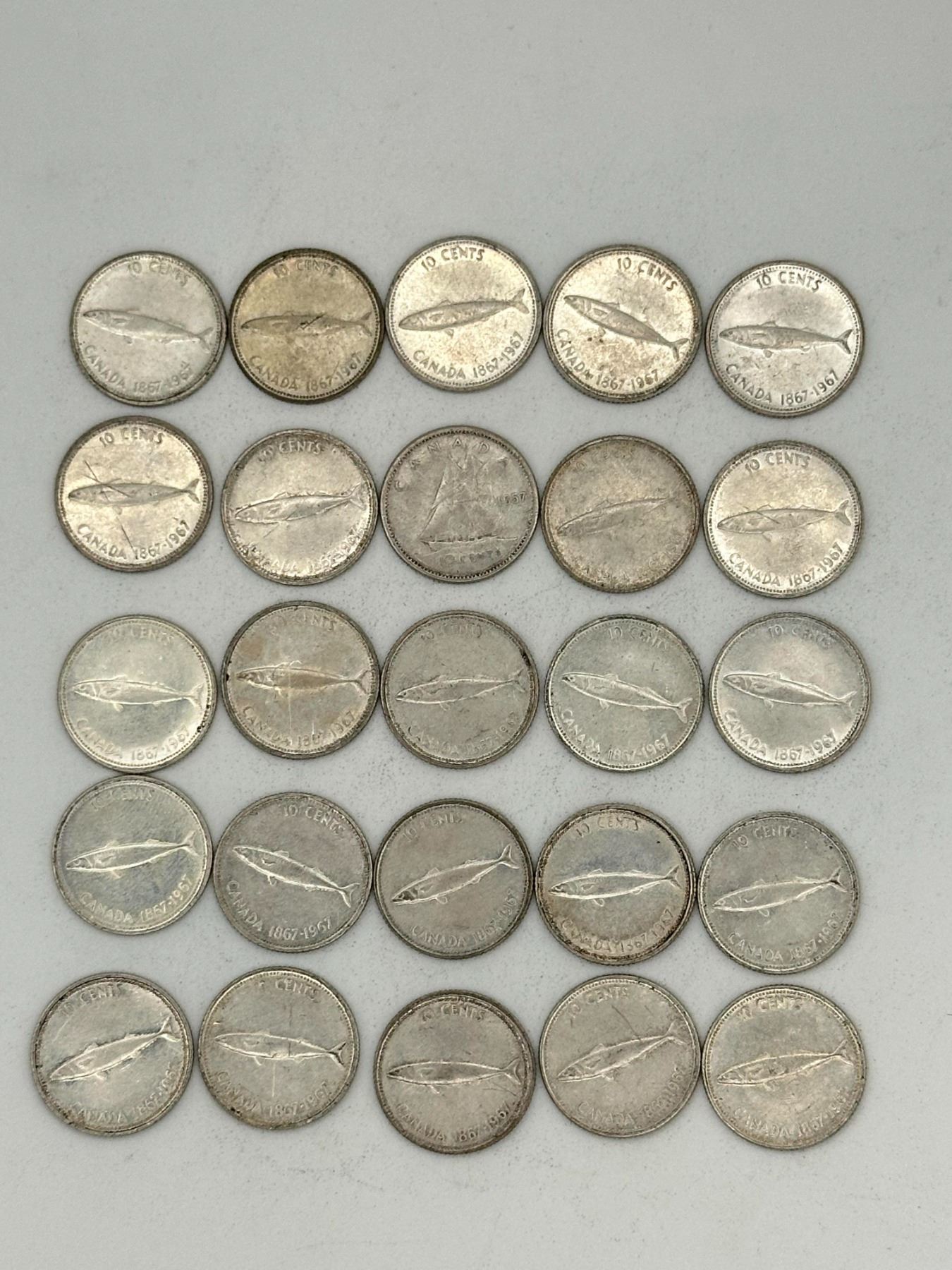 Lot of 25 dimes. Larger group of Canadian Centennial dimes (1867–1967) with mackerel design, mostly 1967 issues, circulated condition.