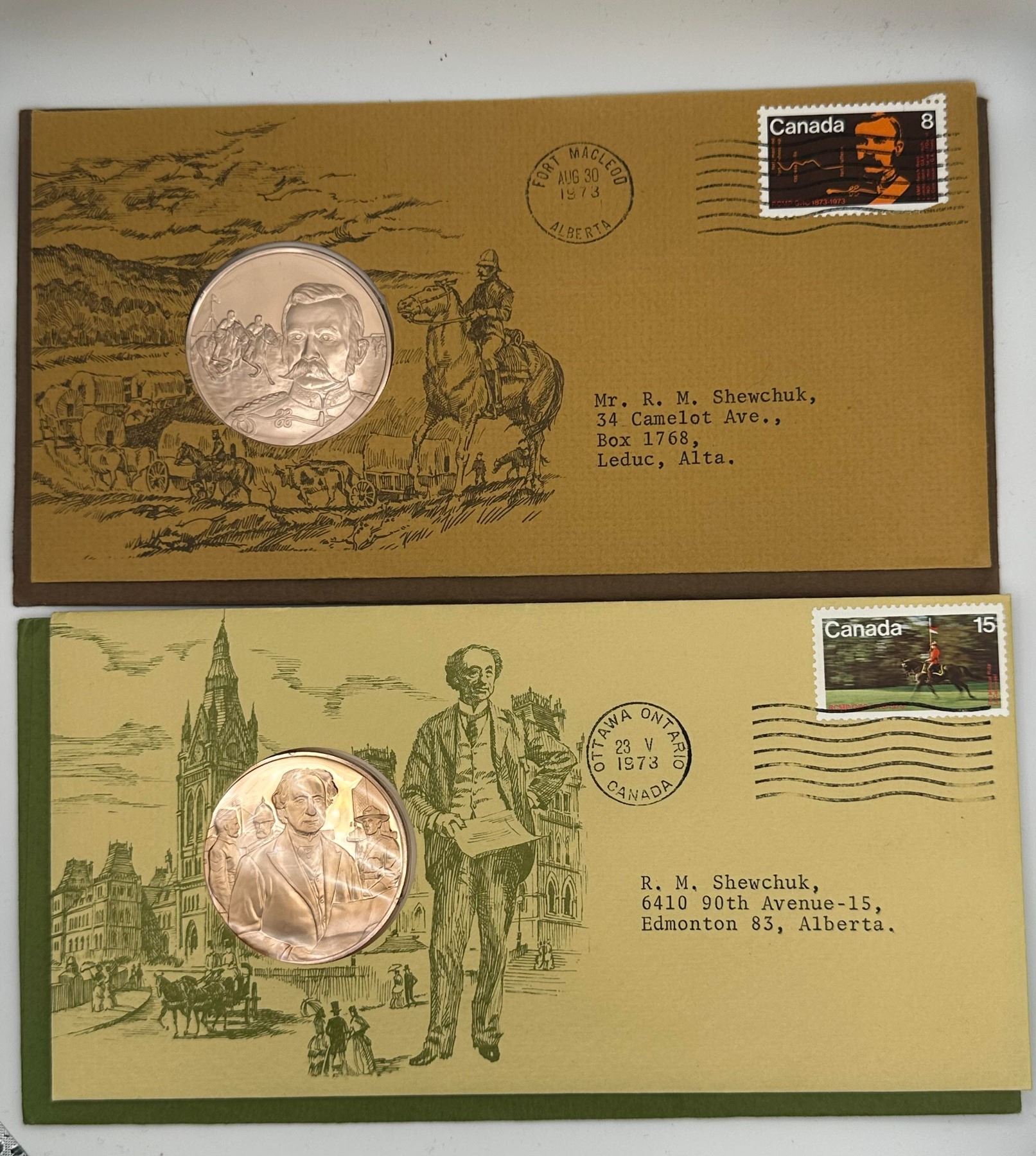 Pair of Canadian commemorative medallion first day covers with stamps and postmarks, dated 1973, featuring historical figures.