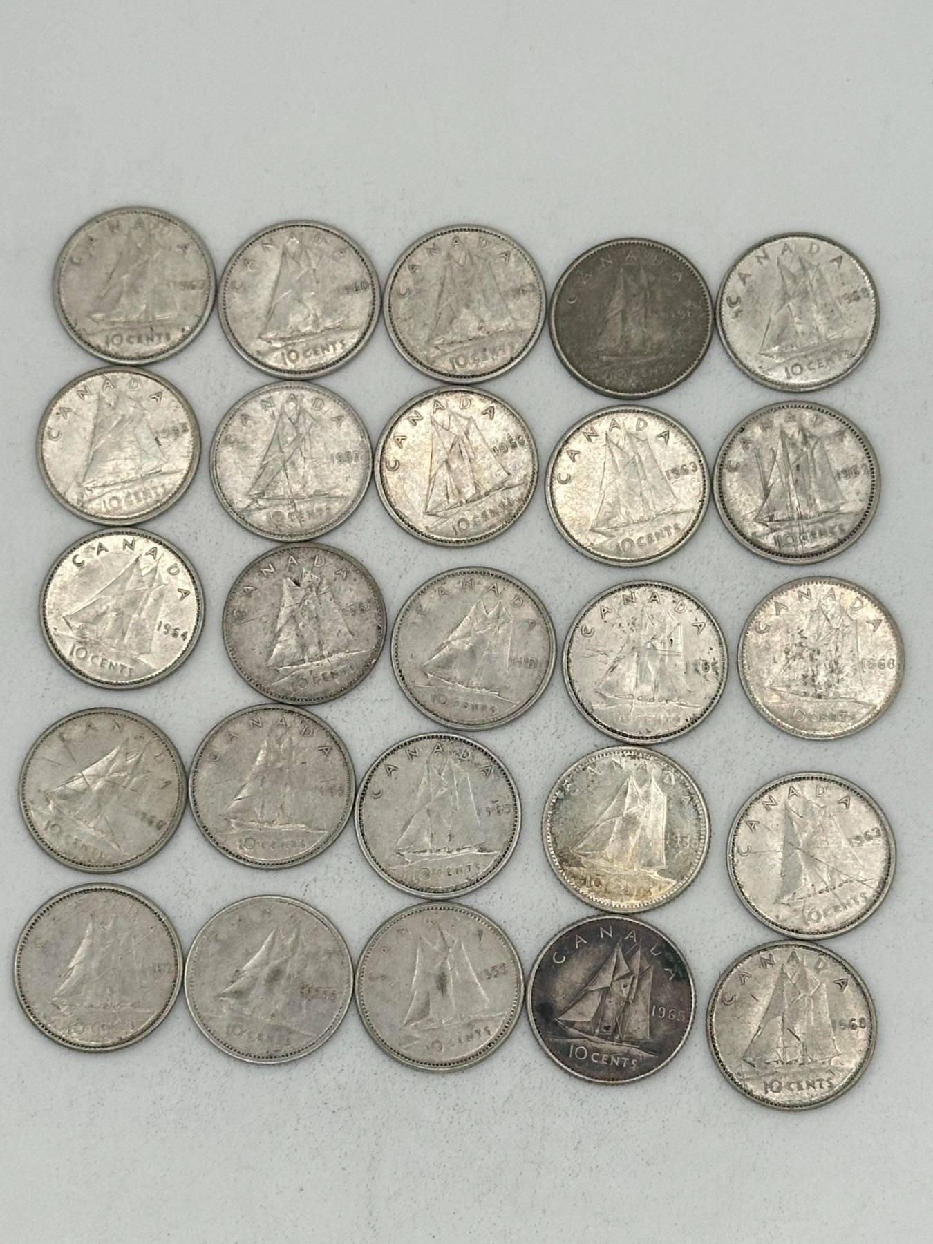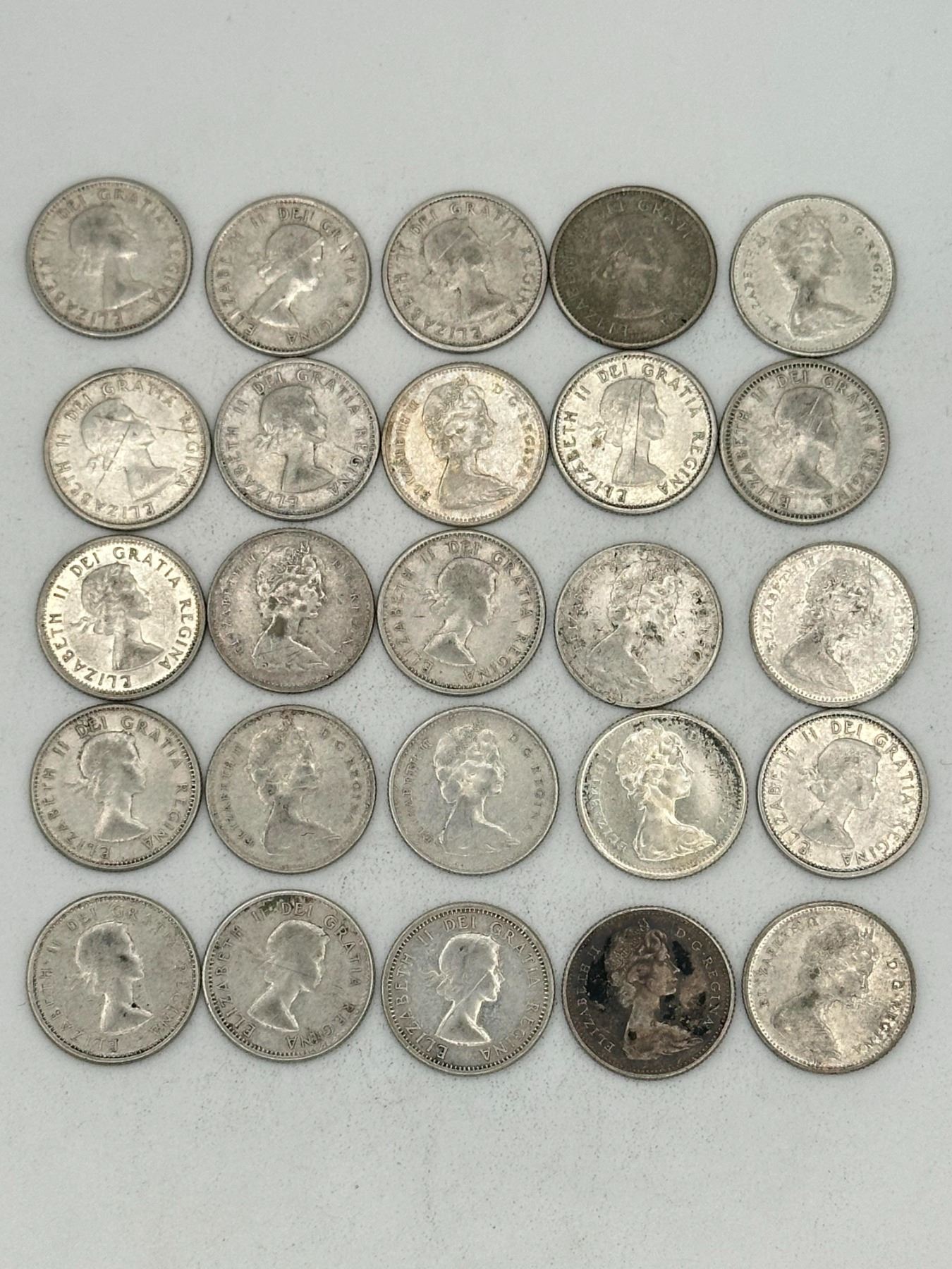Lot of 25 dimes. Assorted Canadian silver dimes including Elizabeth II and earlier issues, mostly mid-20th century. Circulated condition with visible wear, toning, and some darker pieces.