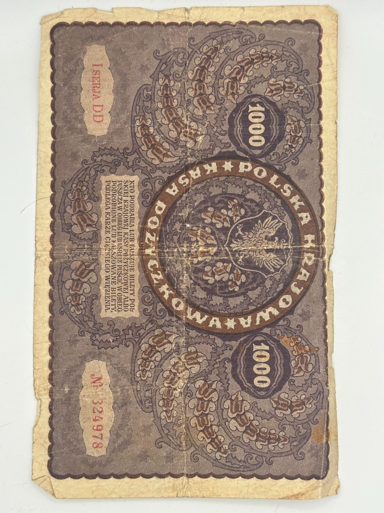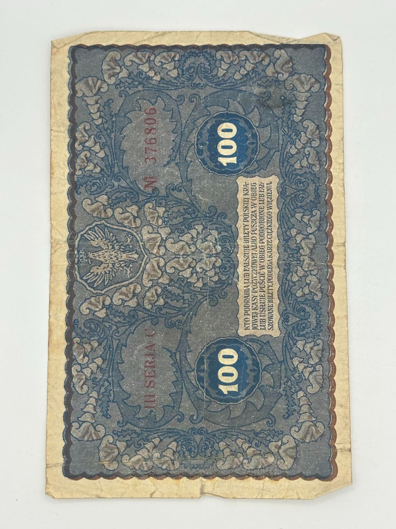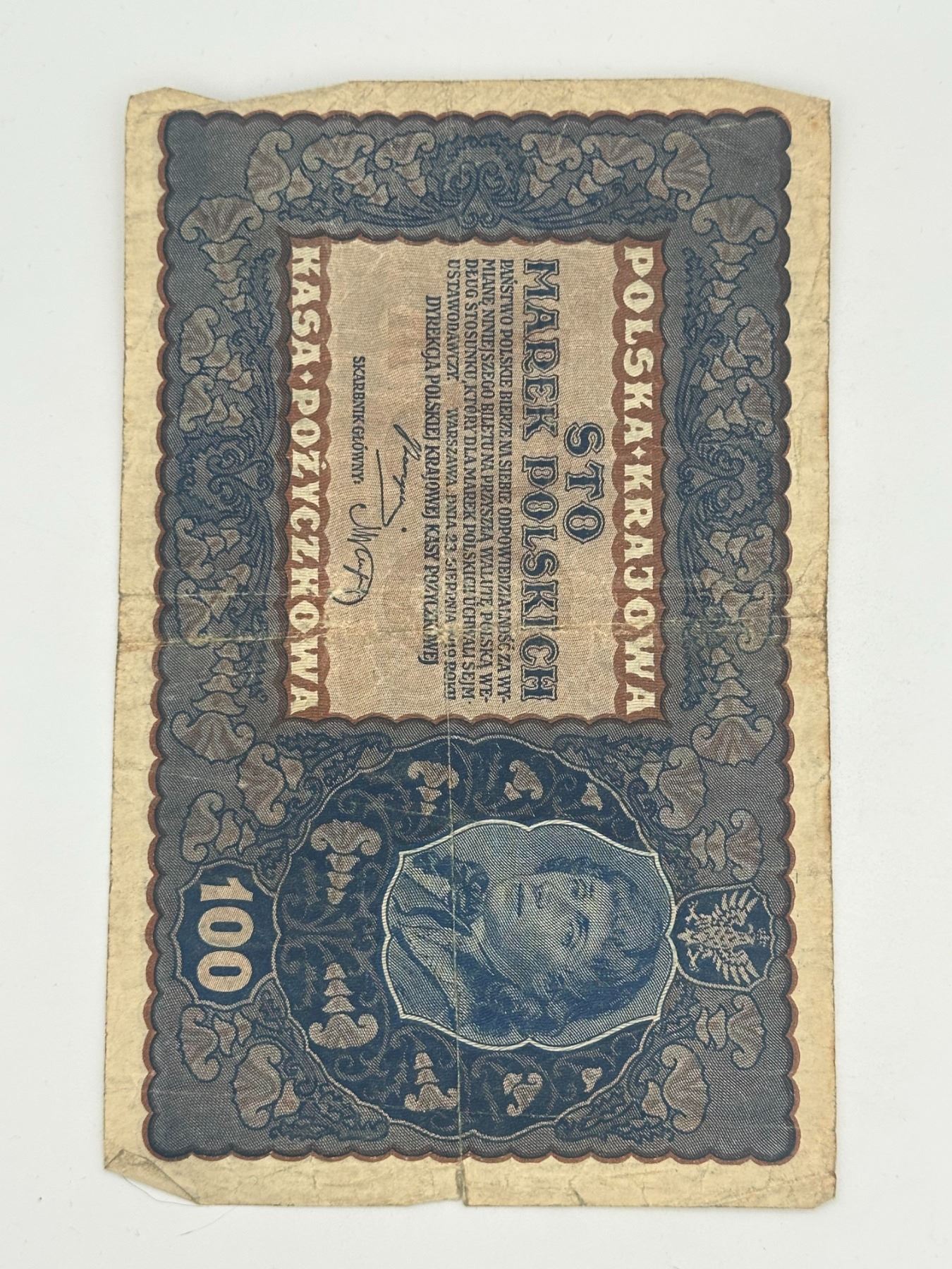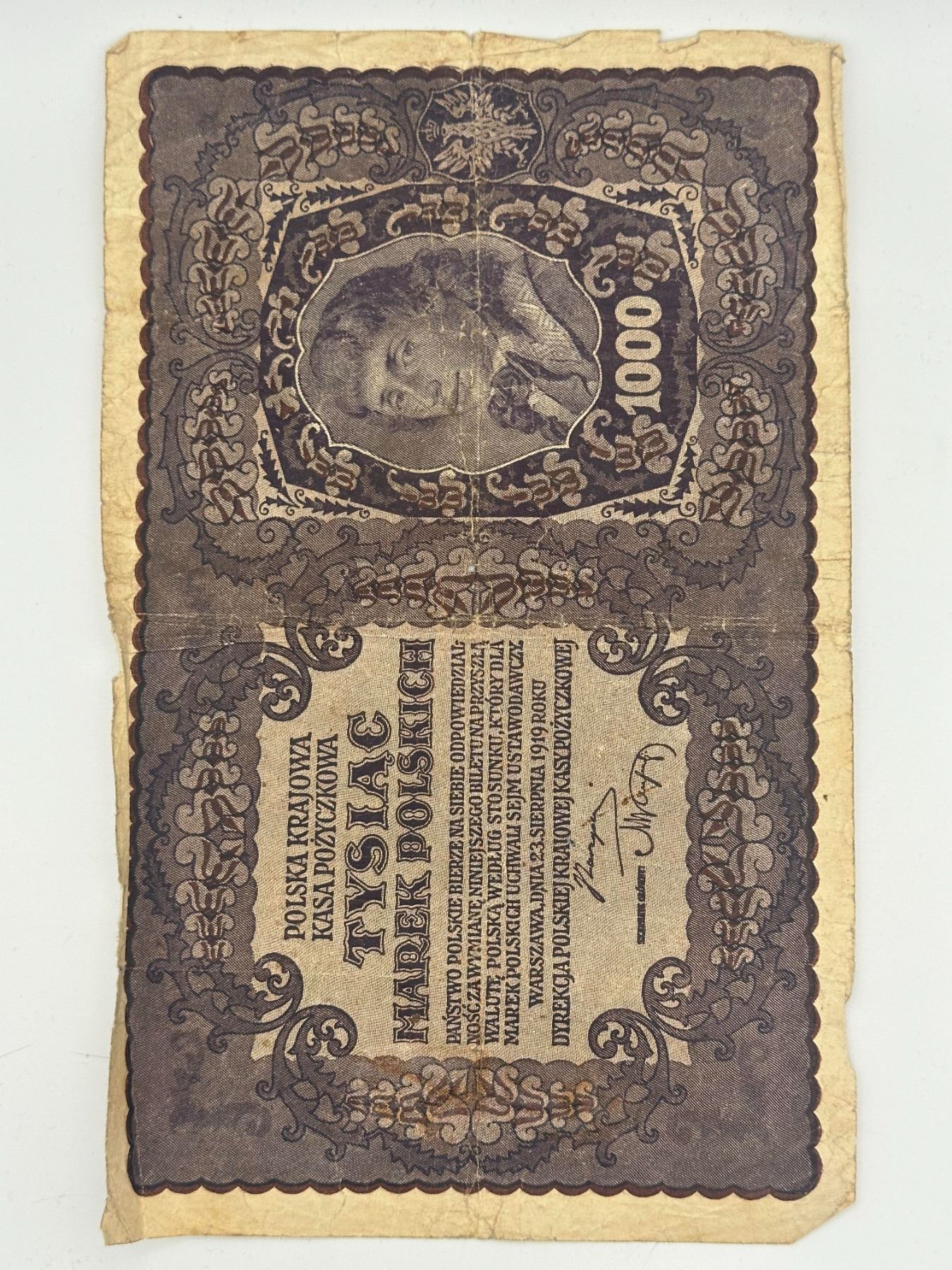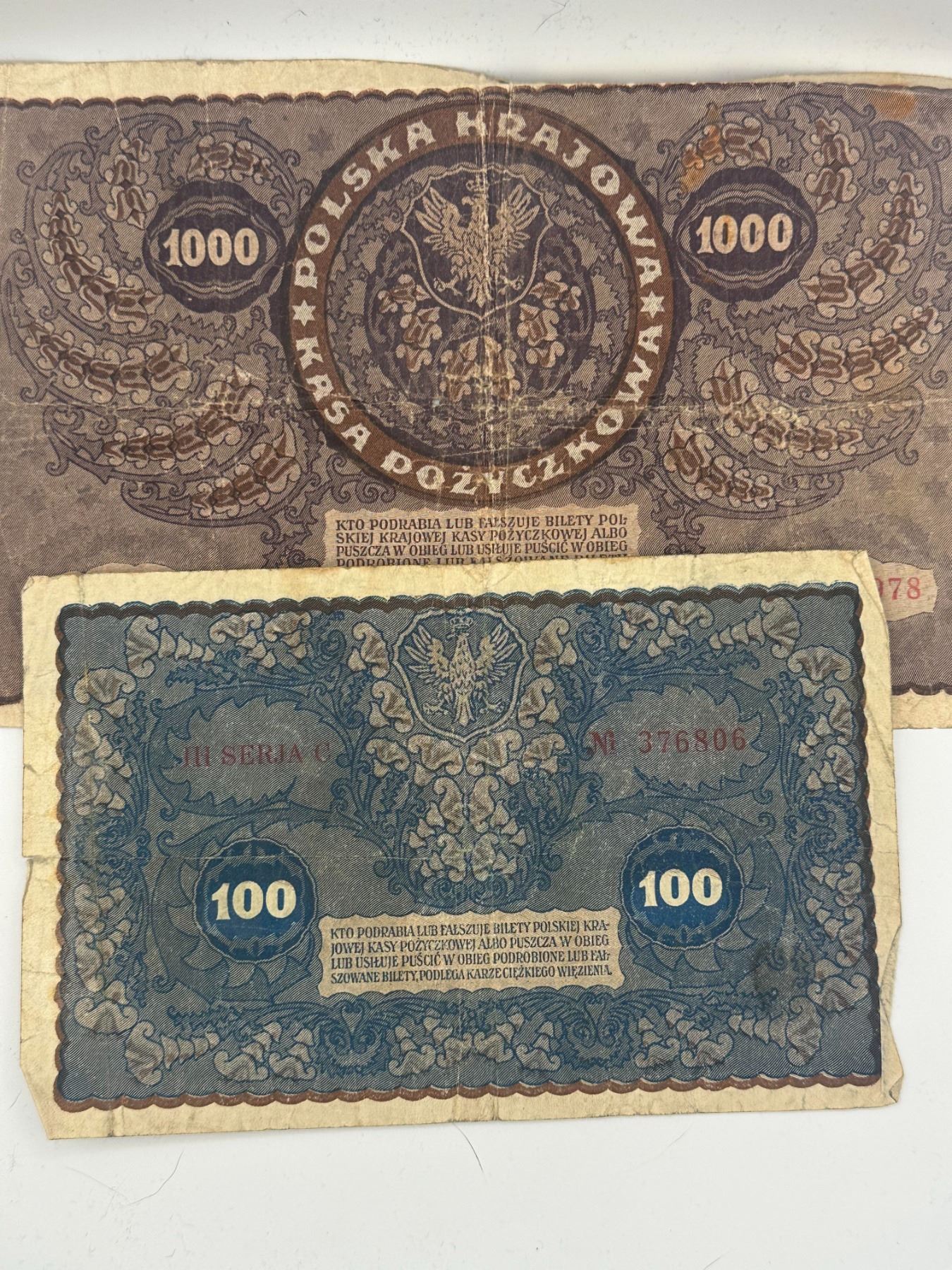 Two vintage Polish banknotes including 100 and 1000 marks, early 20th century issues; circulated with heavy wear, creasing, and edge damage.