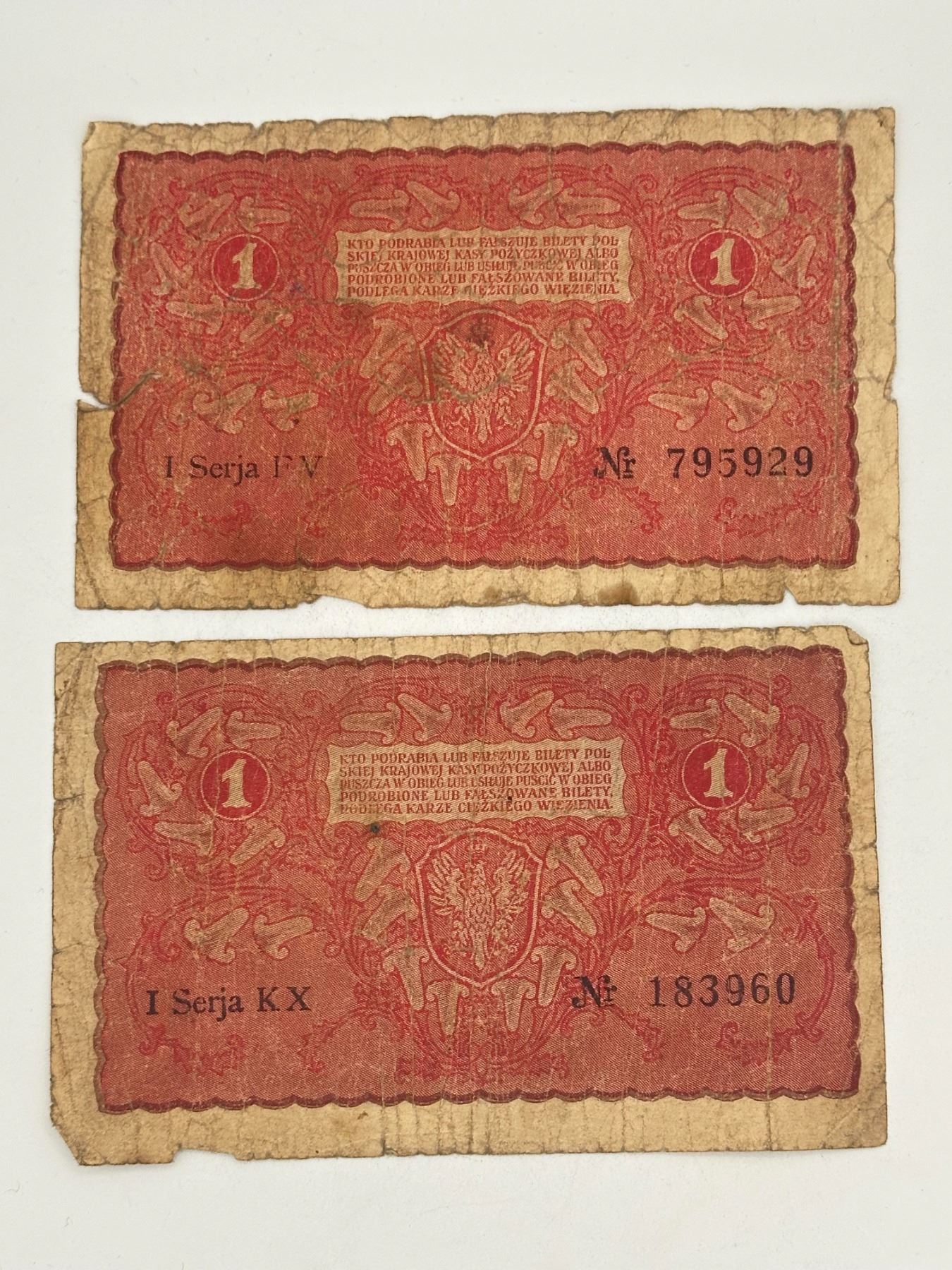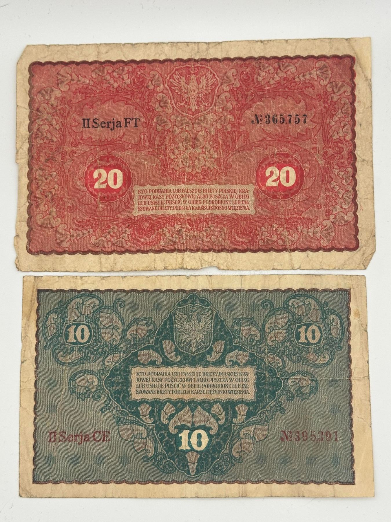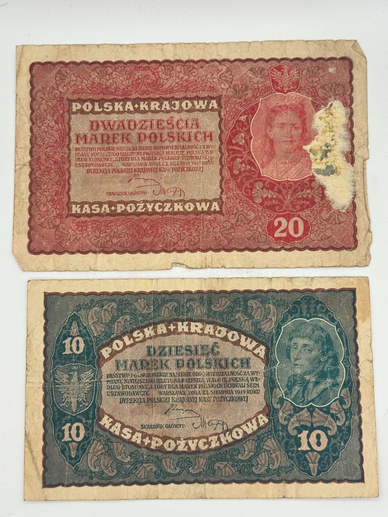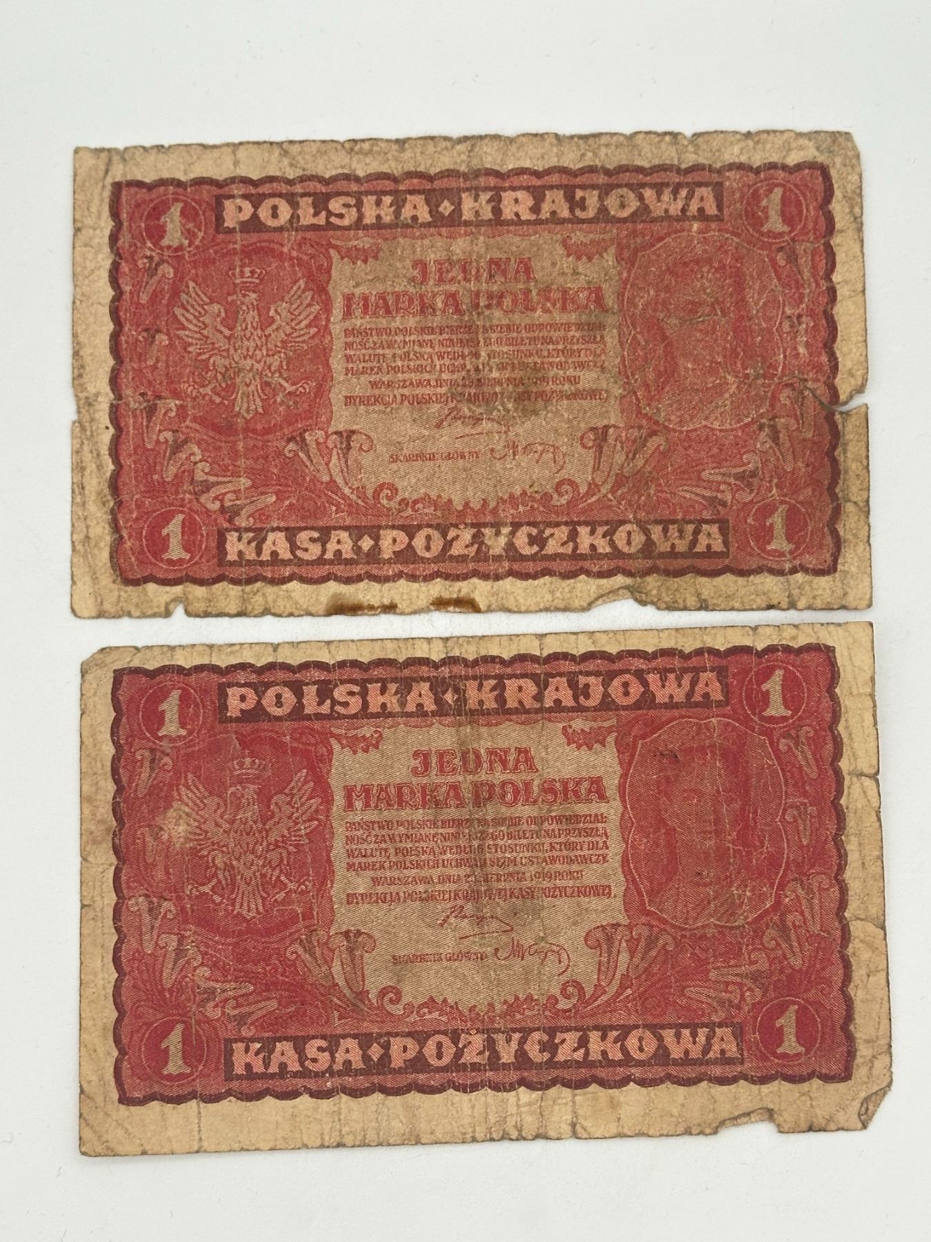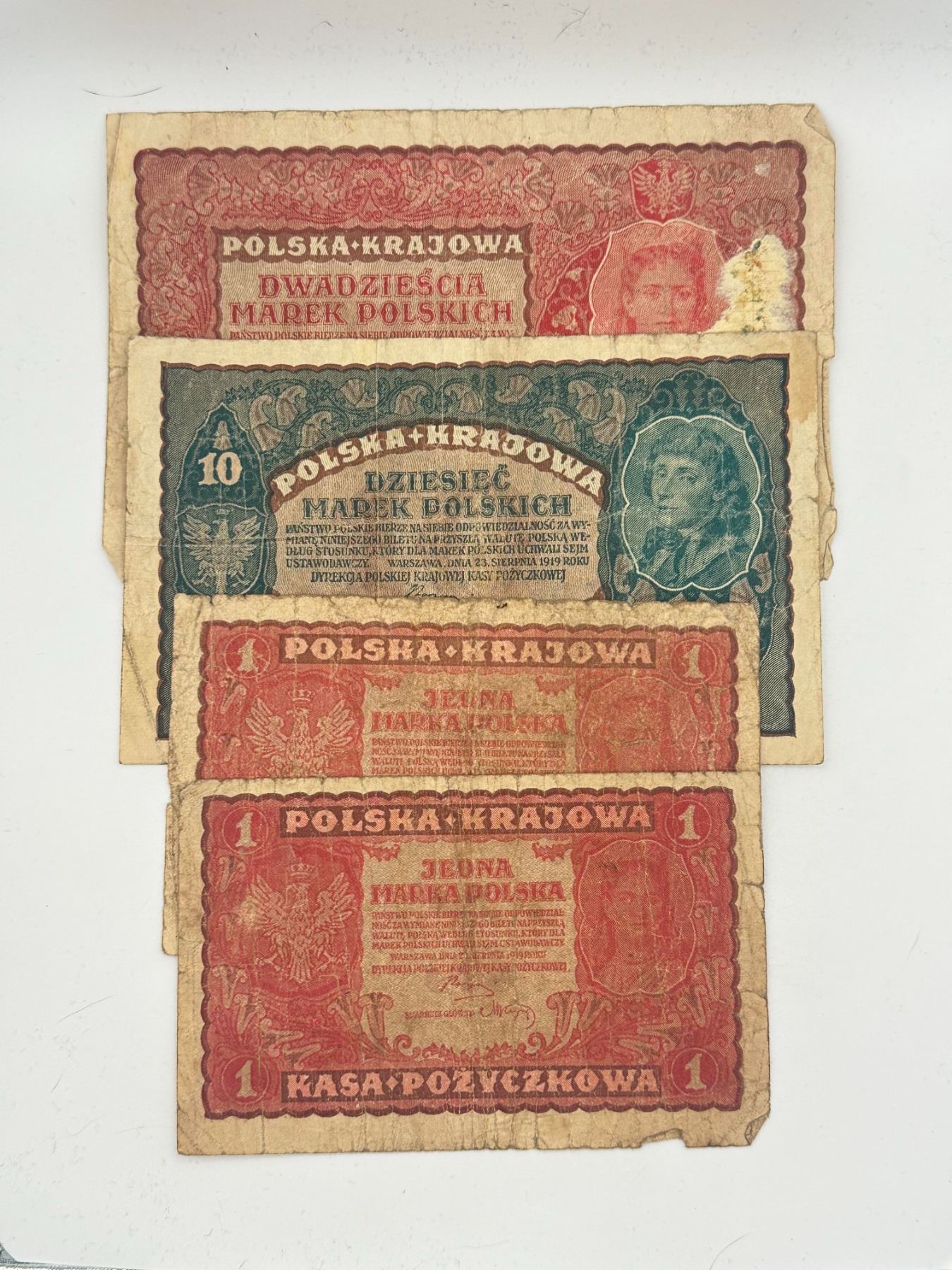 Collection of early 20th century Polish banknotes including 1, 10, and 20 Marek Polskich; heavily circulated with creases, staining, and edge wear.