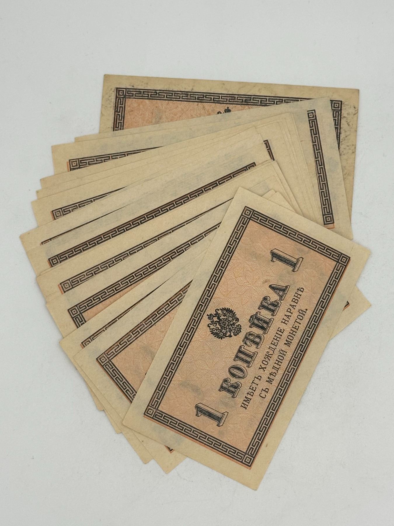 Group of multiple Russian 1 kopek banknotes; early issue paper currency, mostly uncirculated to lightly circulated with minor handling wear.