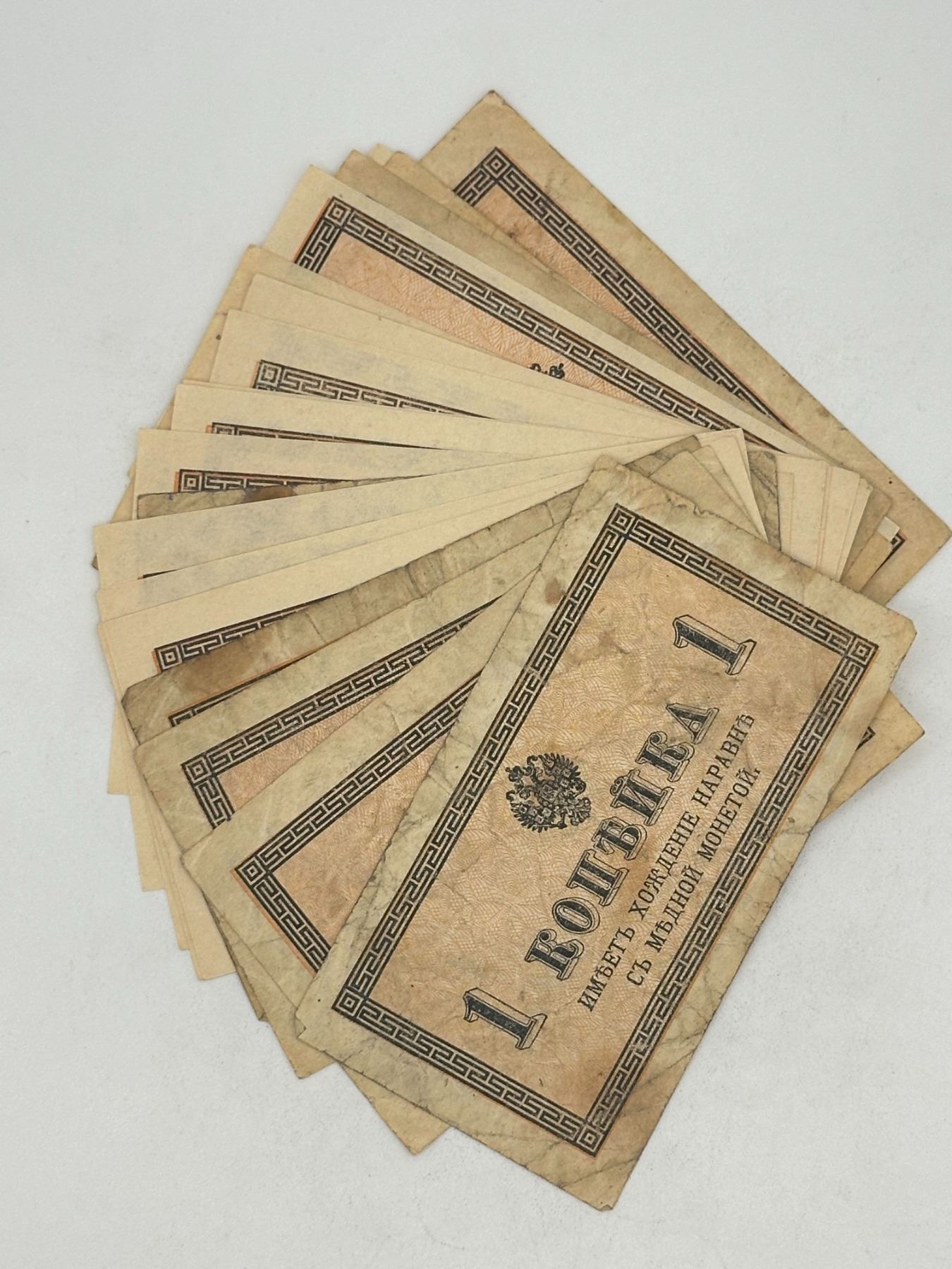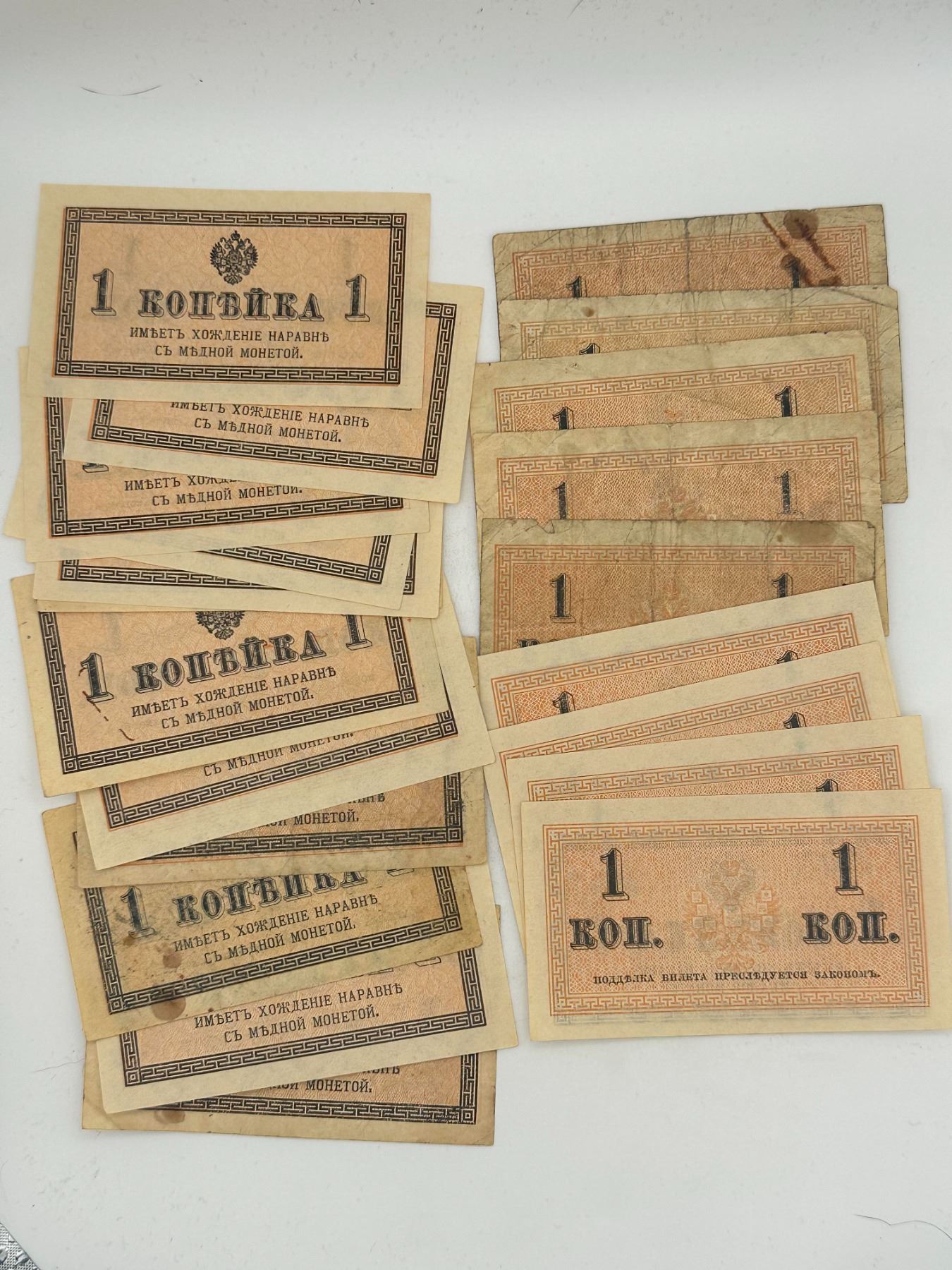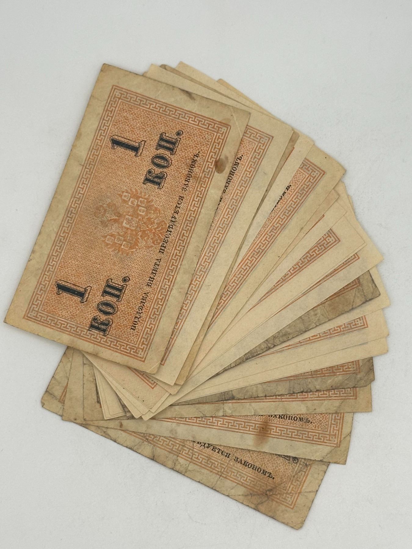 Lot of Russian 1 kopek banknotes including two different design types; circulated condition with staining, creases, and handling wear.
