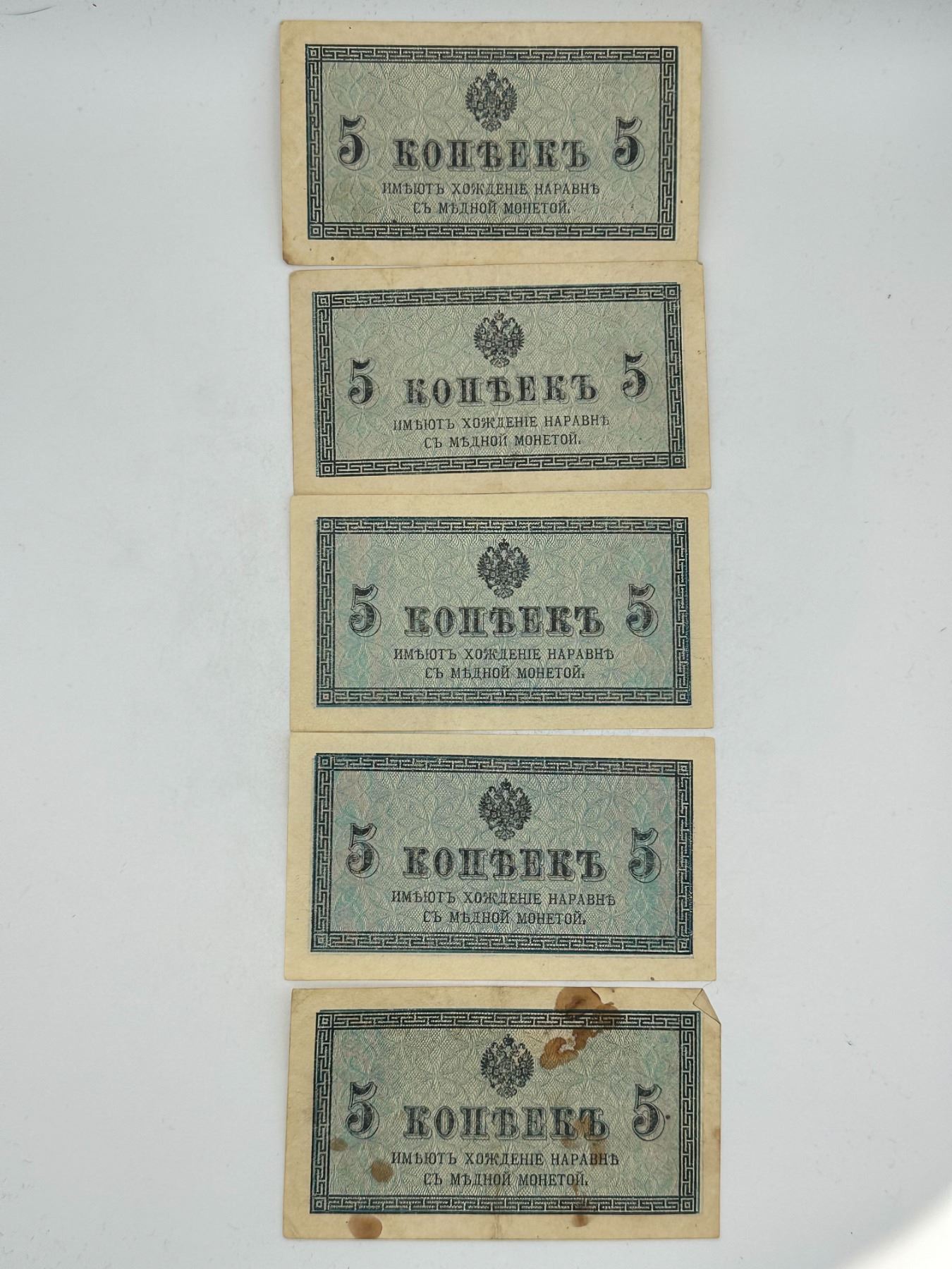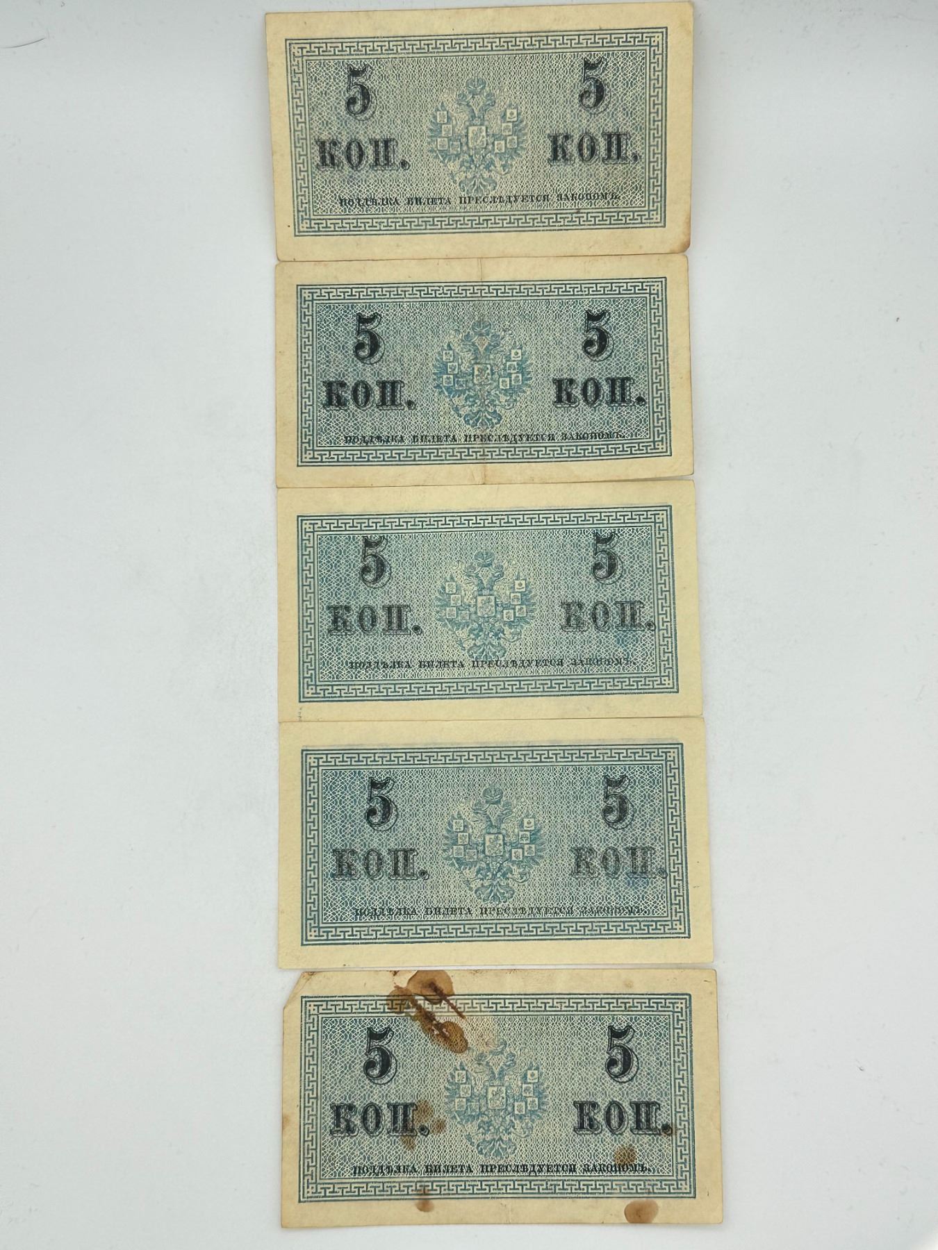 Group of Imperial Russian 5 kopek banknotes. Multiple examples in circulated condition with visible staining, creases, and edge wear.