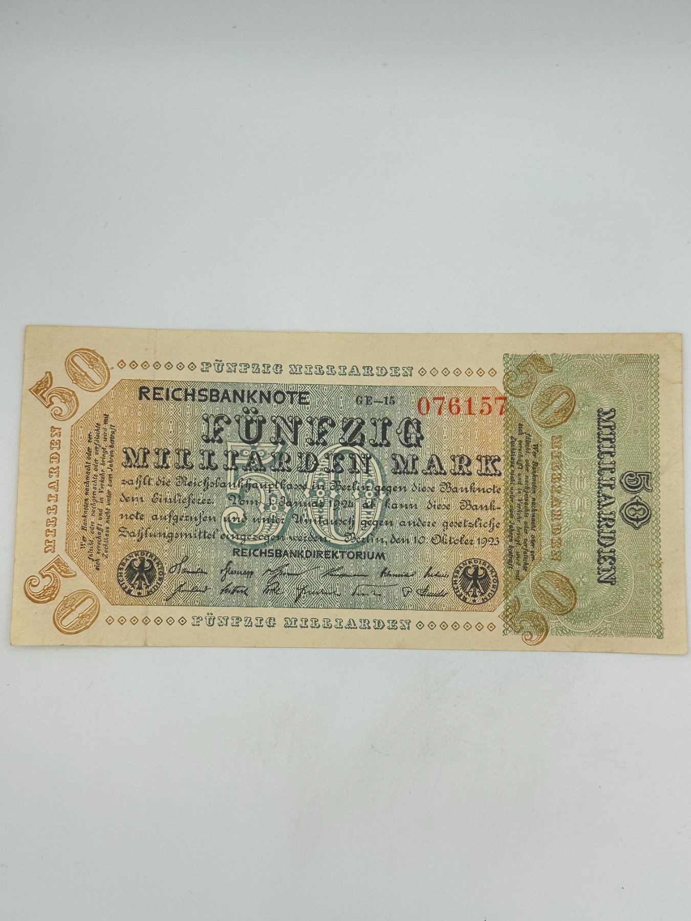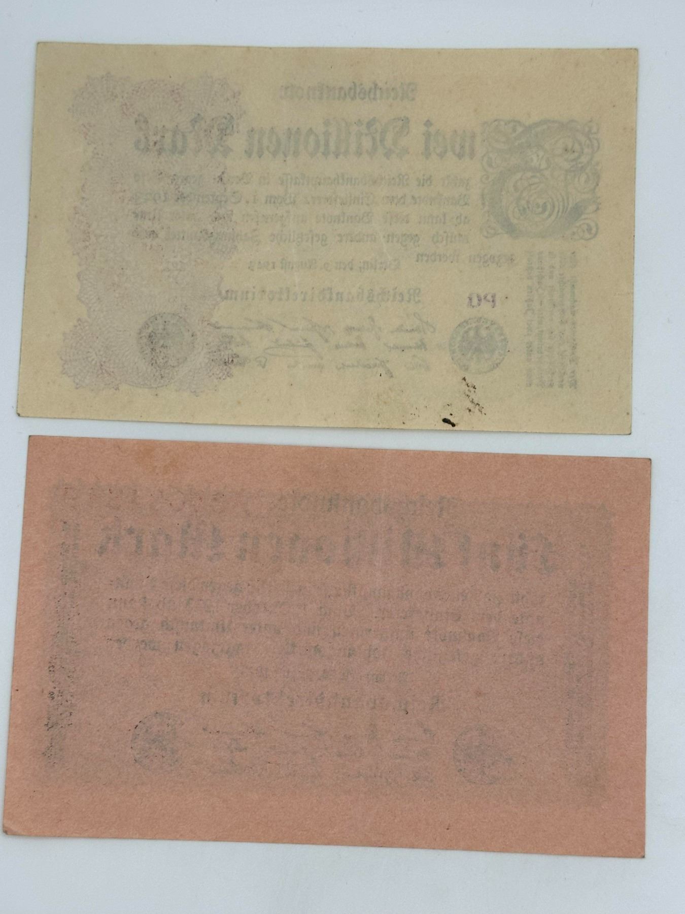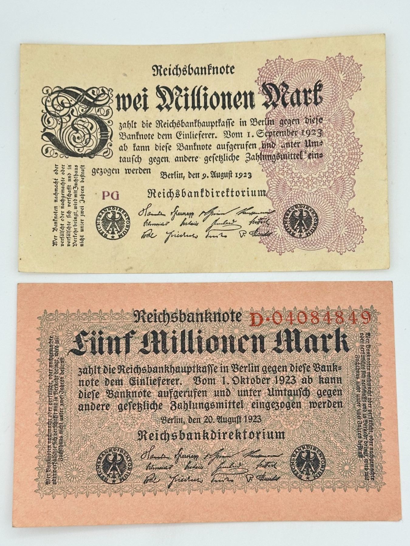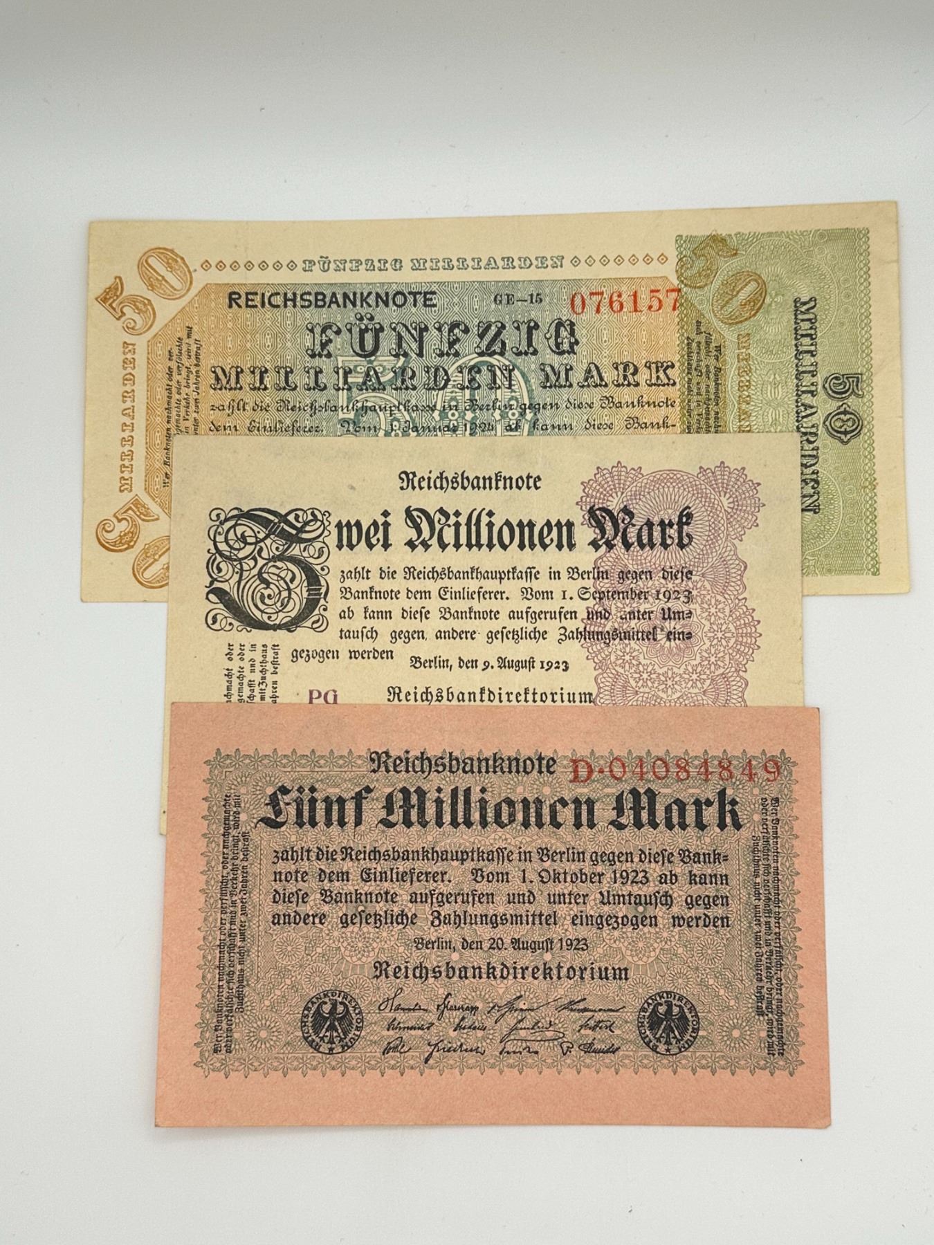 Group of three German Reichsbank notes from the hyperinflation era: 50 Milliarden Mark, 2 Millionen Mark, and 5 Millionen Mark. Circulated condition with typical wear.