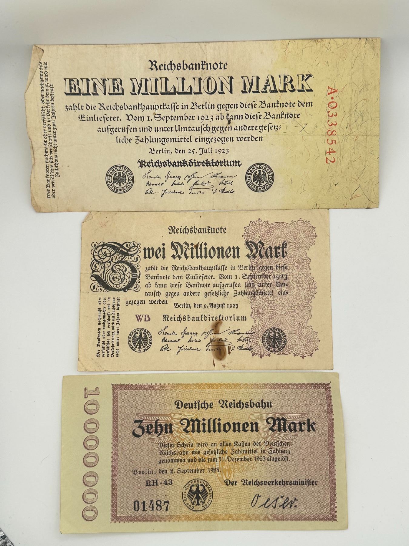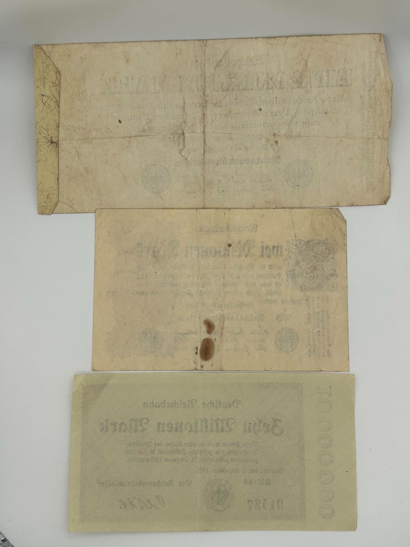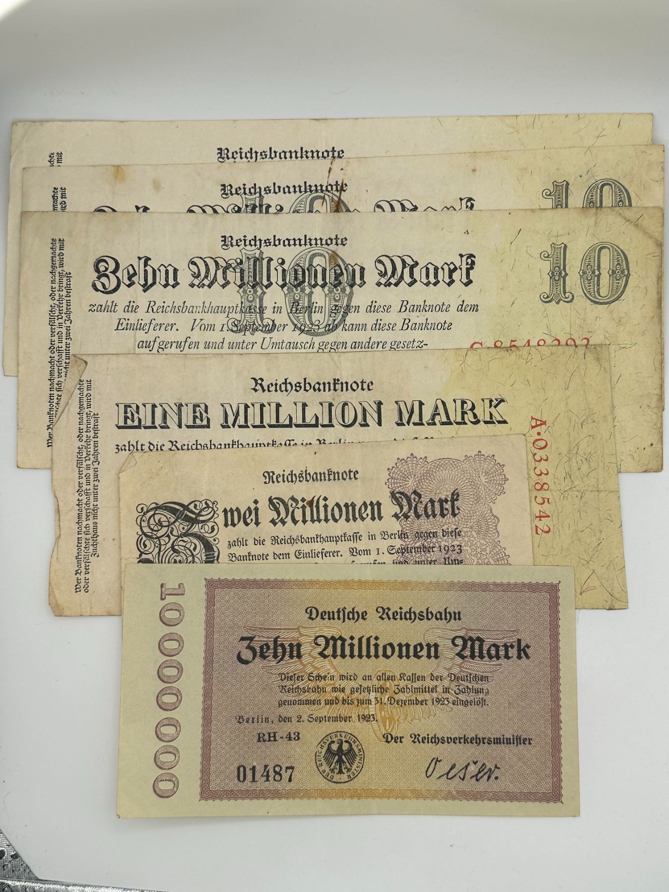 Group of German Reichsbank and Reichsbahn hyperinflation notes including million and multi-million mark denominations. Circulated condition with creases, staining, and wear.