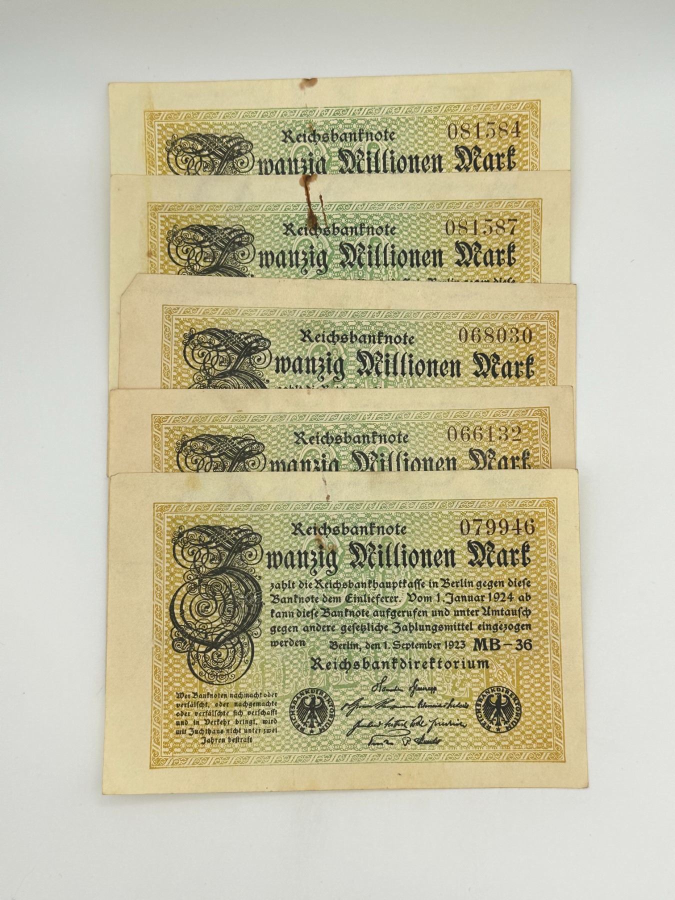 Group of five German Reichsbanknote 'Zwanzig Millionen Mark' notes (1923). Circulated condition with folds, staining, and edge wear.