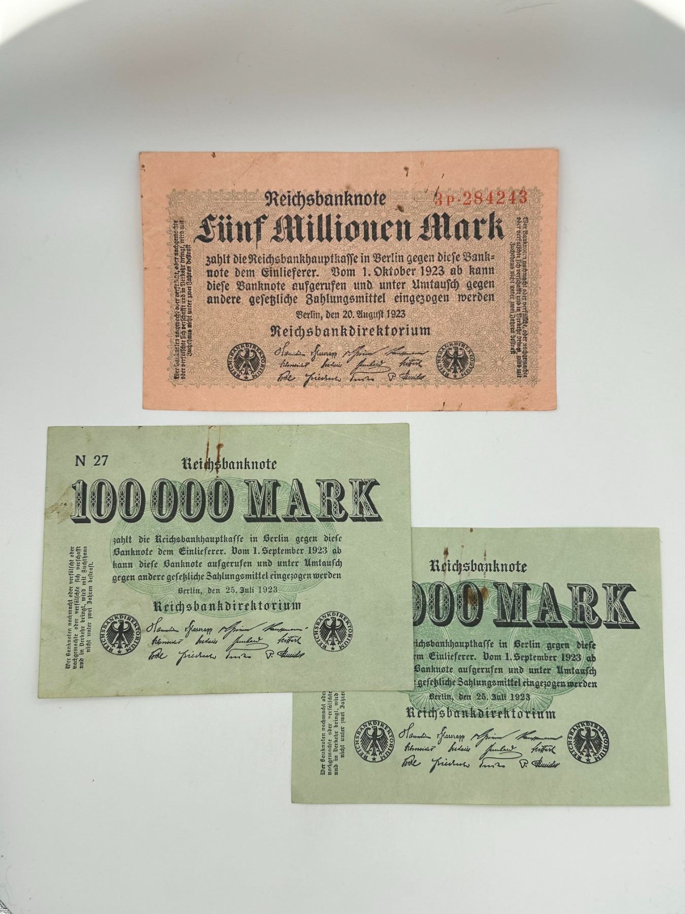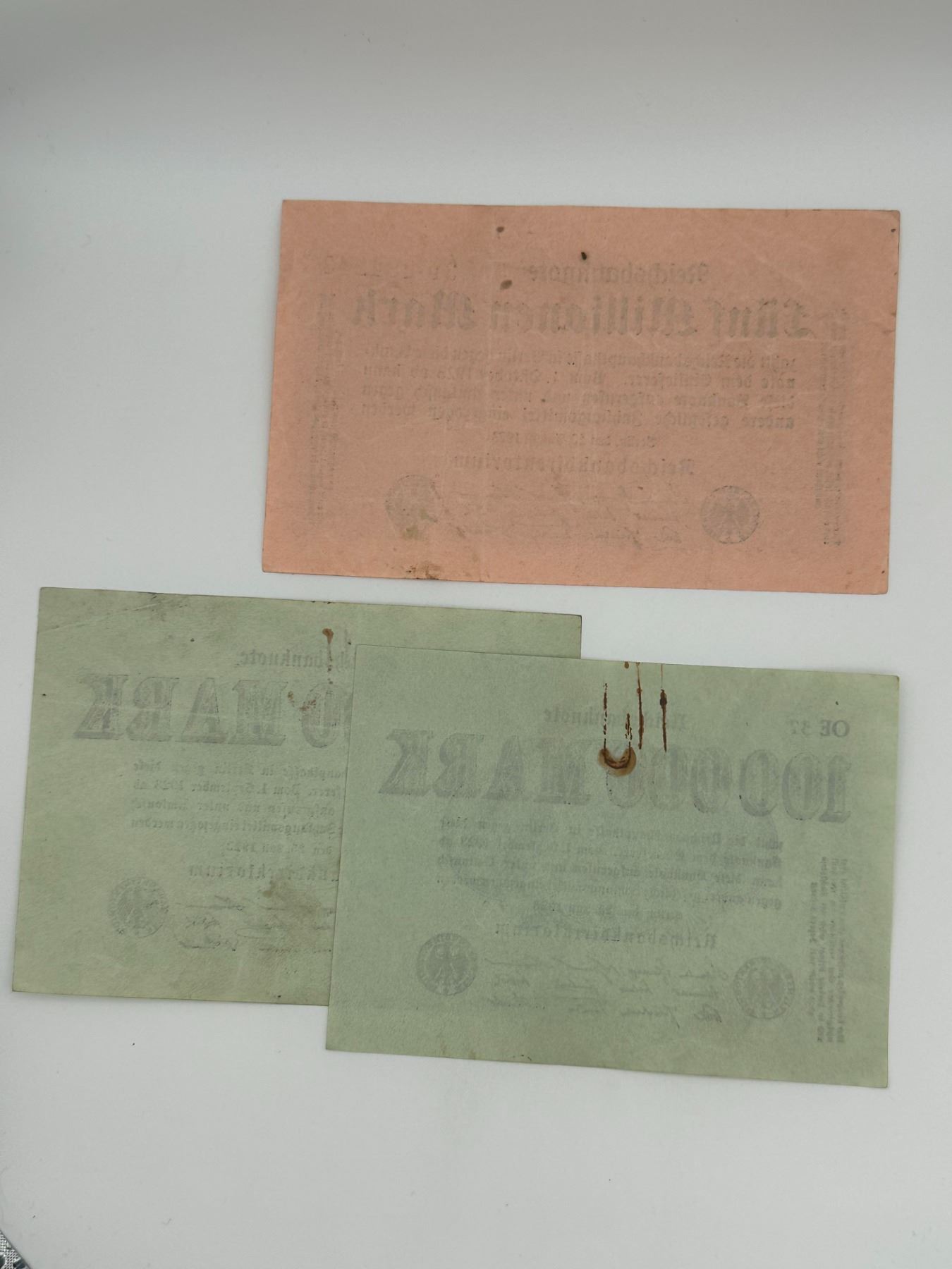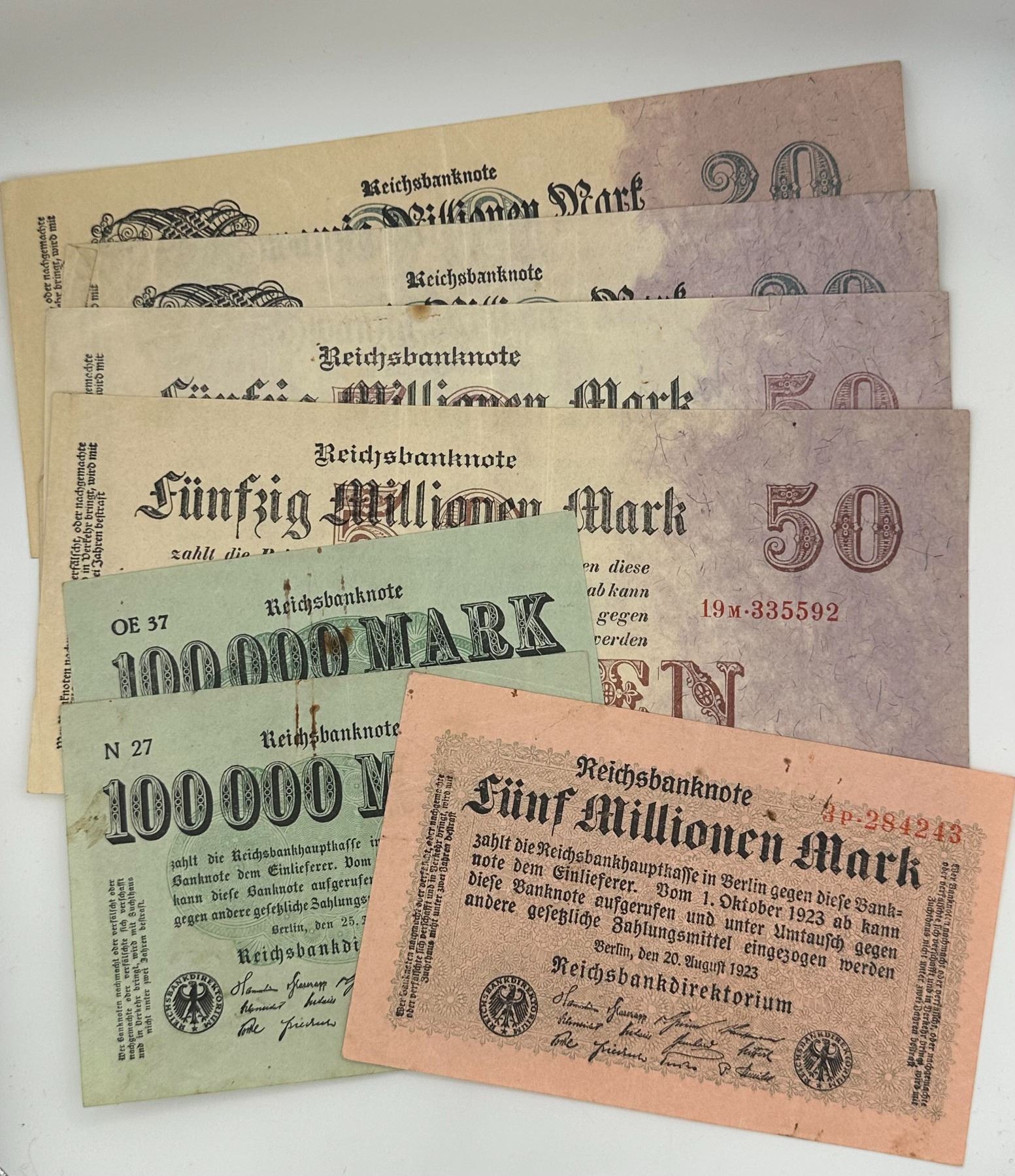 Group of seven German Reichsbanknotes including 50 Million Mark, 5 Million Mark, and 100,000 Mark notes. Circulated condition with folds, stains, and wear.