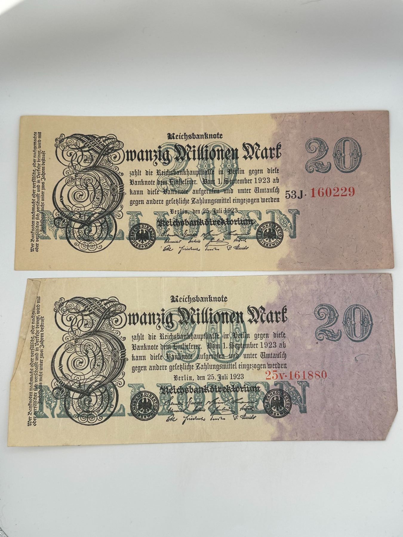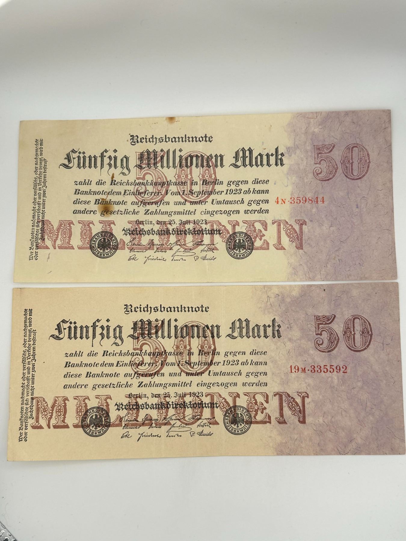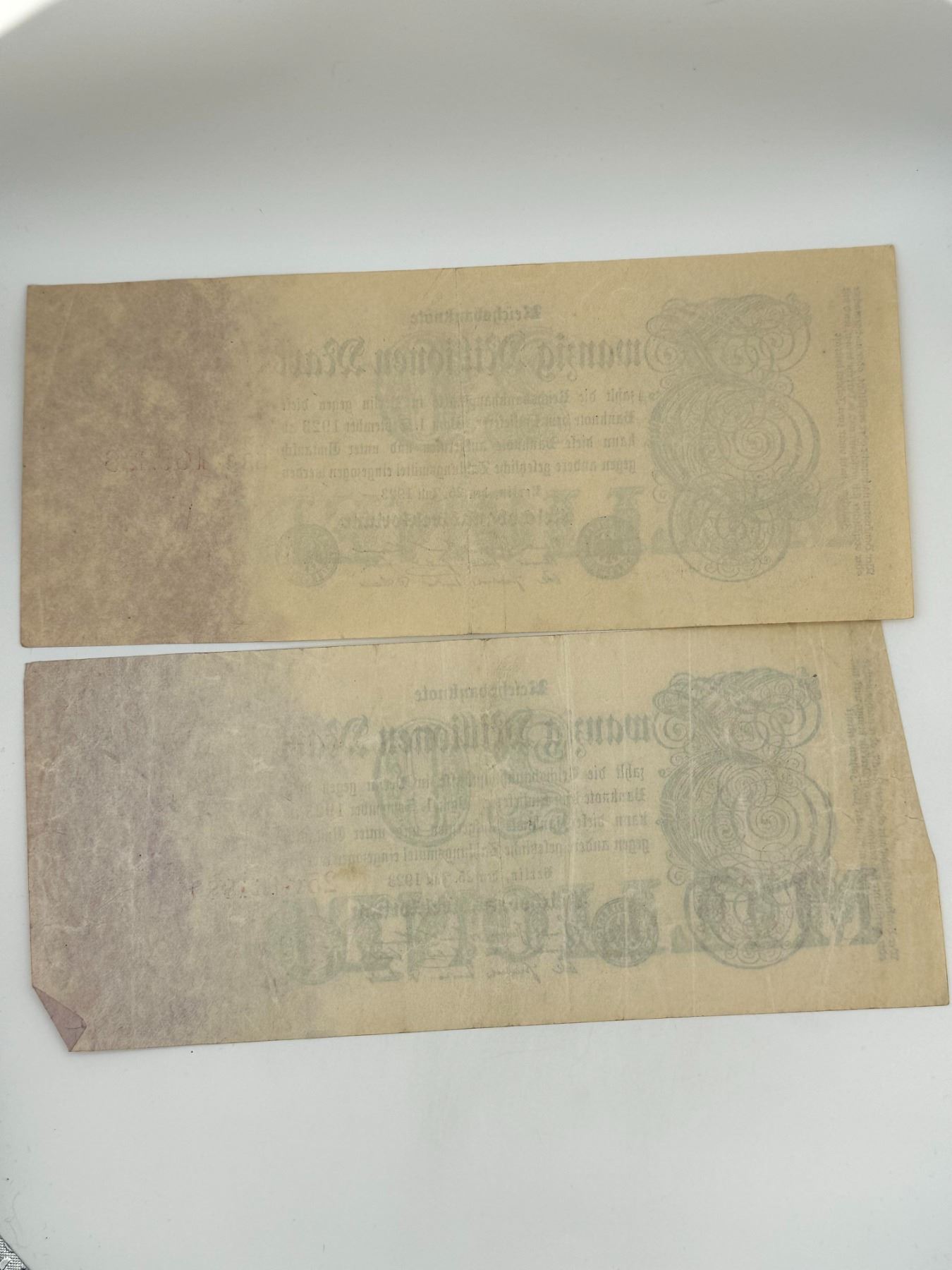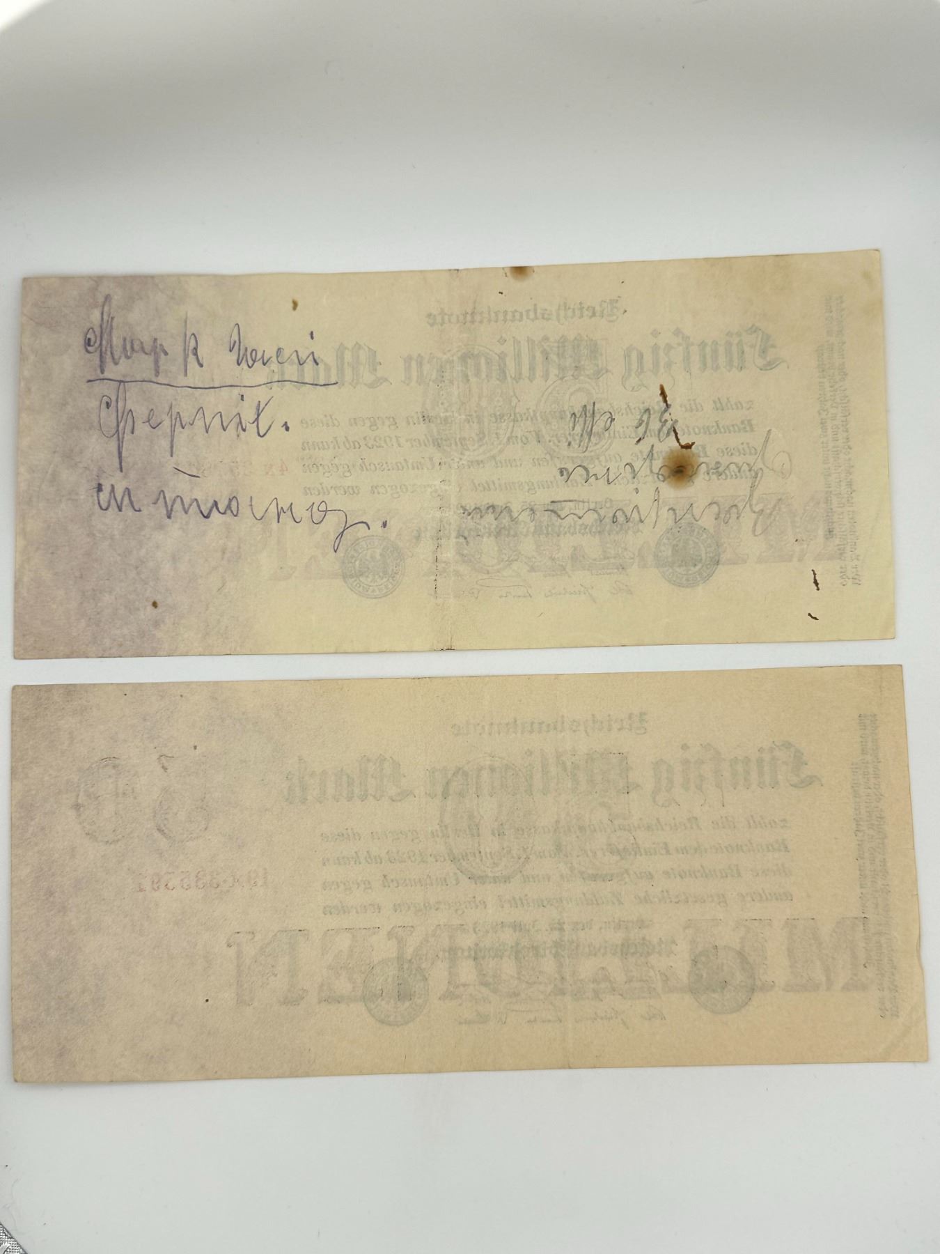 Group of seven German Reichsbanknotes including 50 Million Mark, 5 Million Mark, and 100,000 Mark notes. Circulated condition with folds, stains, and wear.