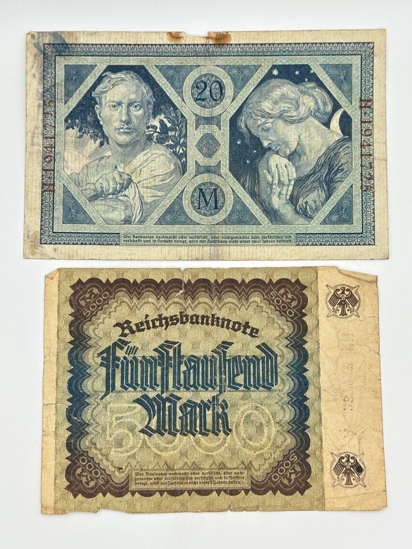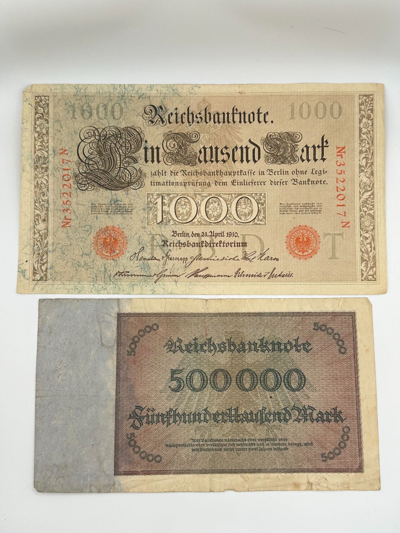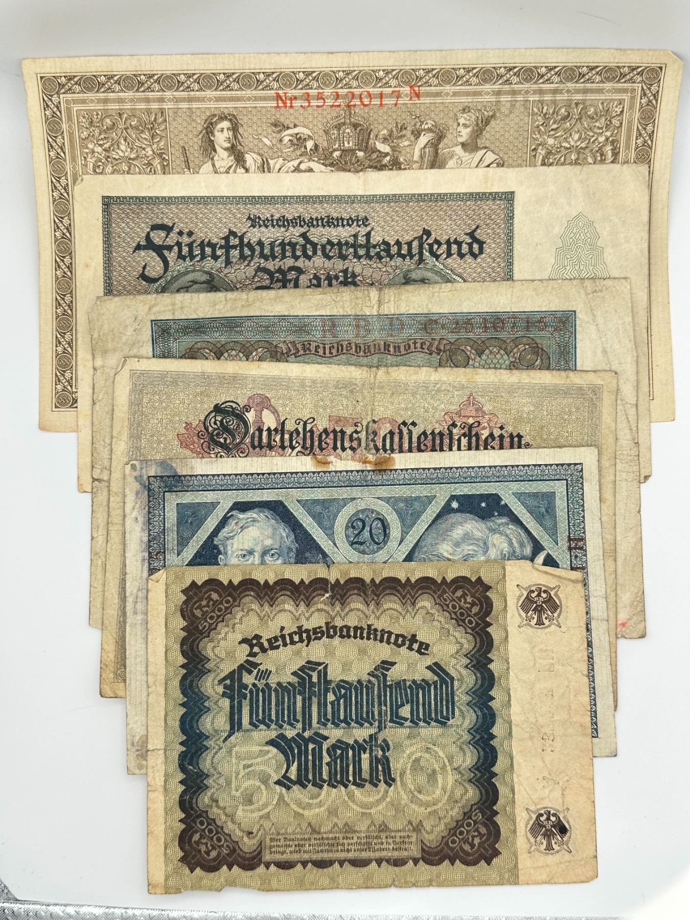 Group including various German Reichsbanknotes and Darlehenskassenschein notes (including 20 Mark and 500,000 Mark types). Circulated condition with folds, staining, and wear.