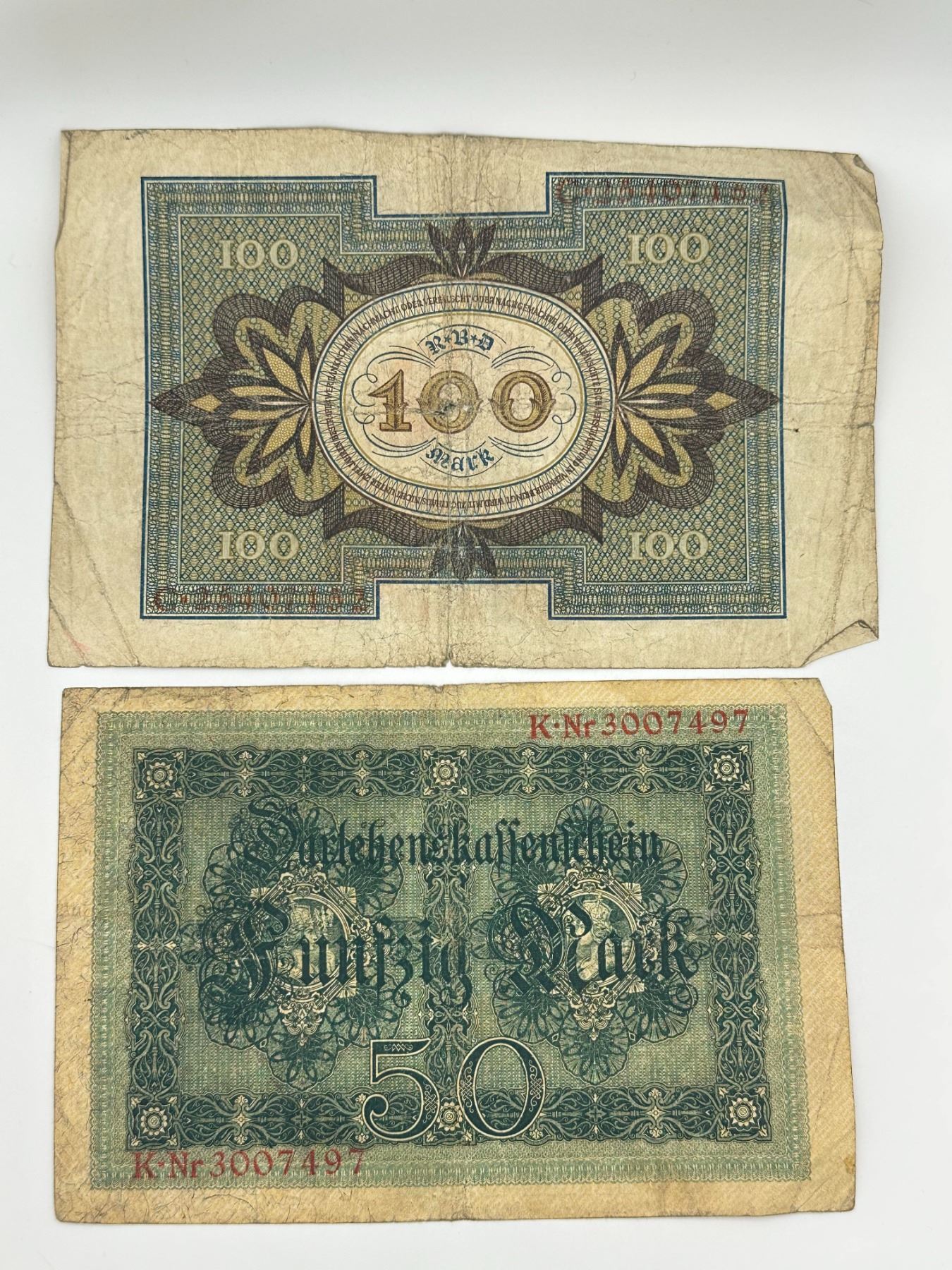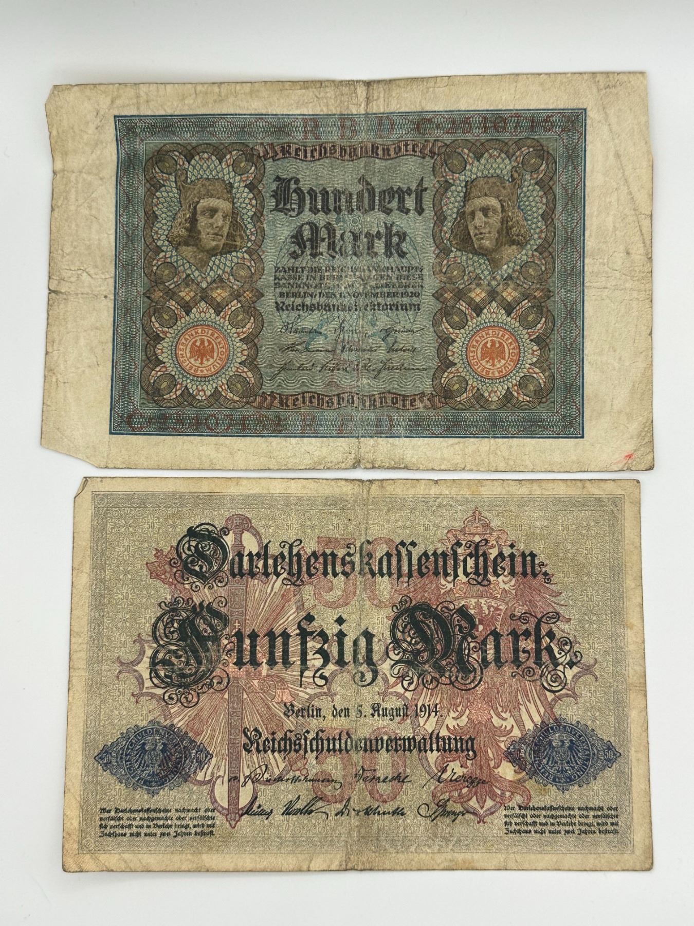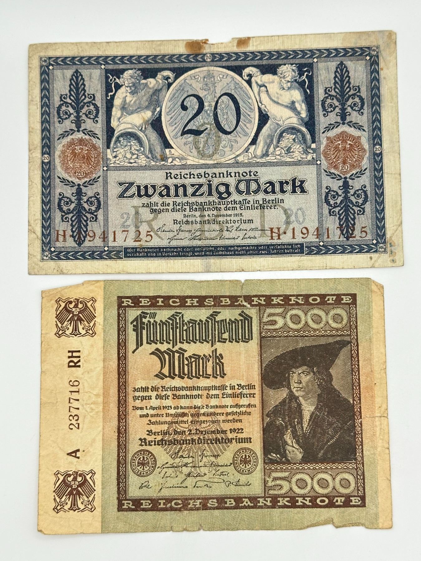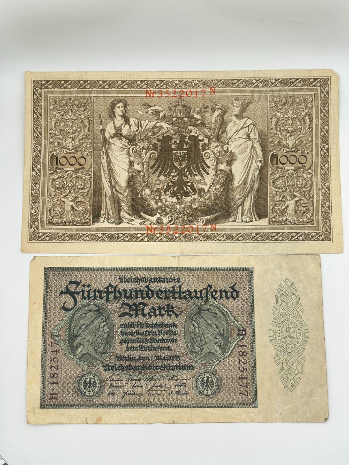 Group including various German Reichsbanknotes and Darlehenskassenschein notes (including 20 Mark and 500,000 Mark types). Circulated condition with folds, staining, and wear.