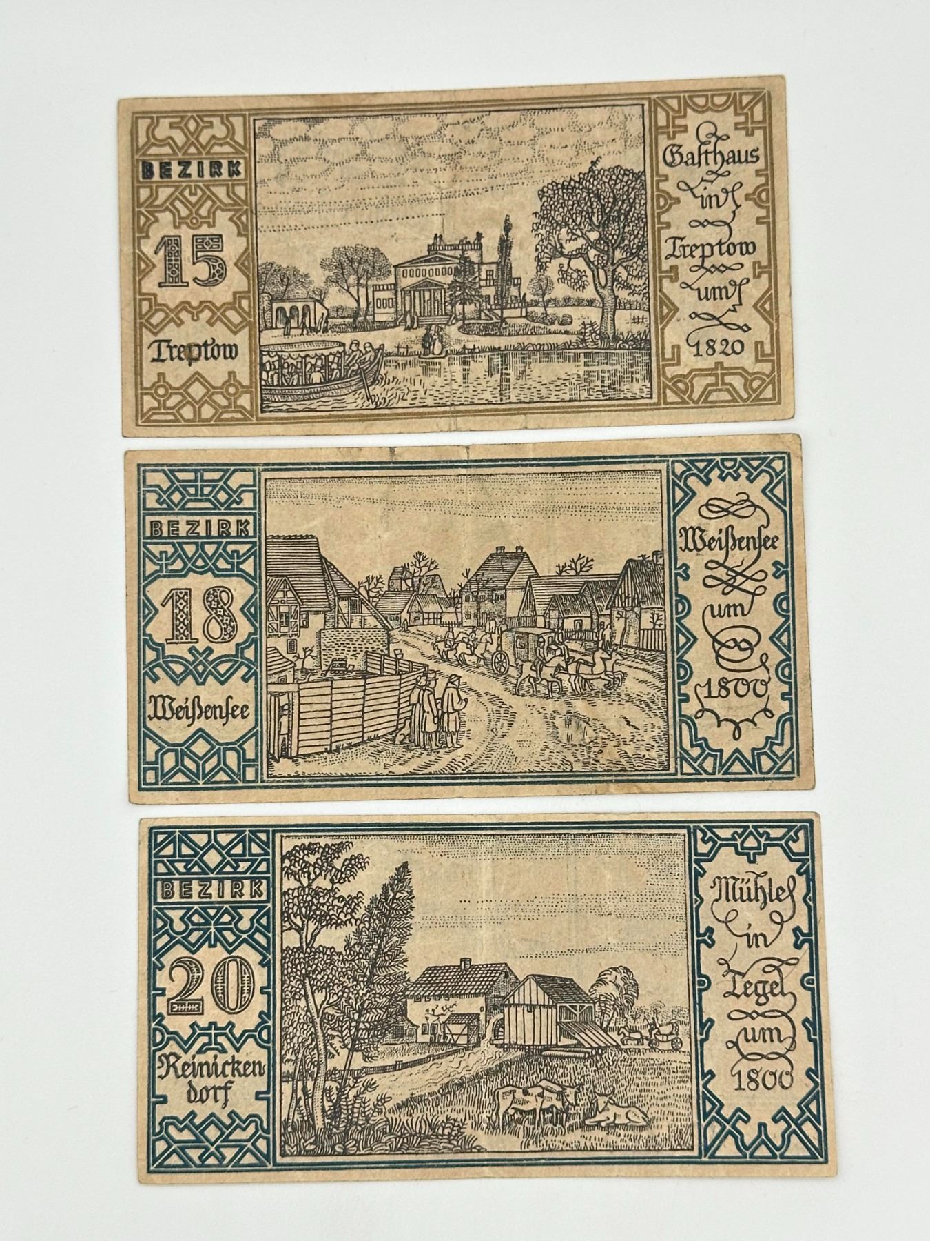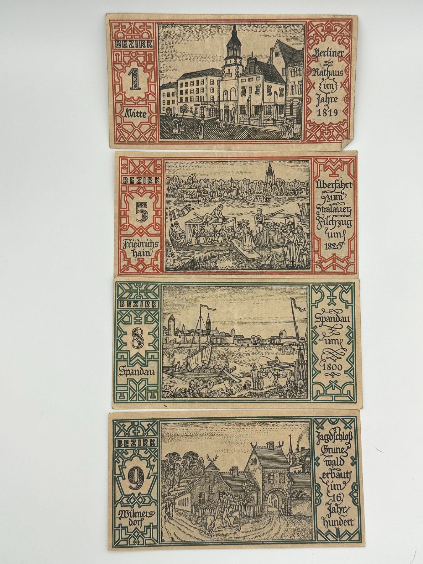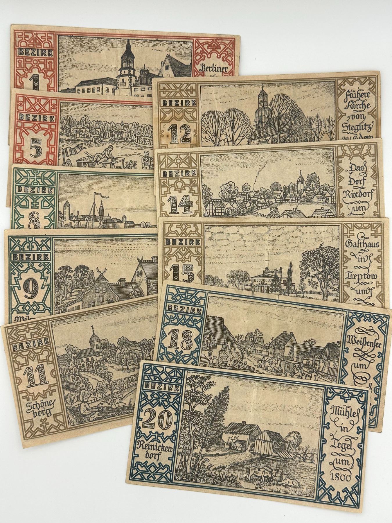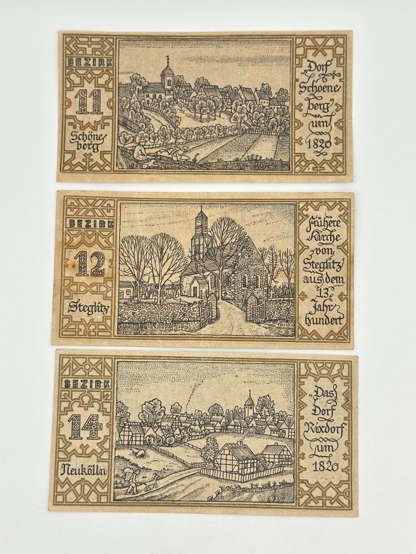 Collection of German Notgeld notes from Berlin districts (Bezirke), featuring various illustrated local scenes and denominations. Circulated condition with light wear and toning.