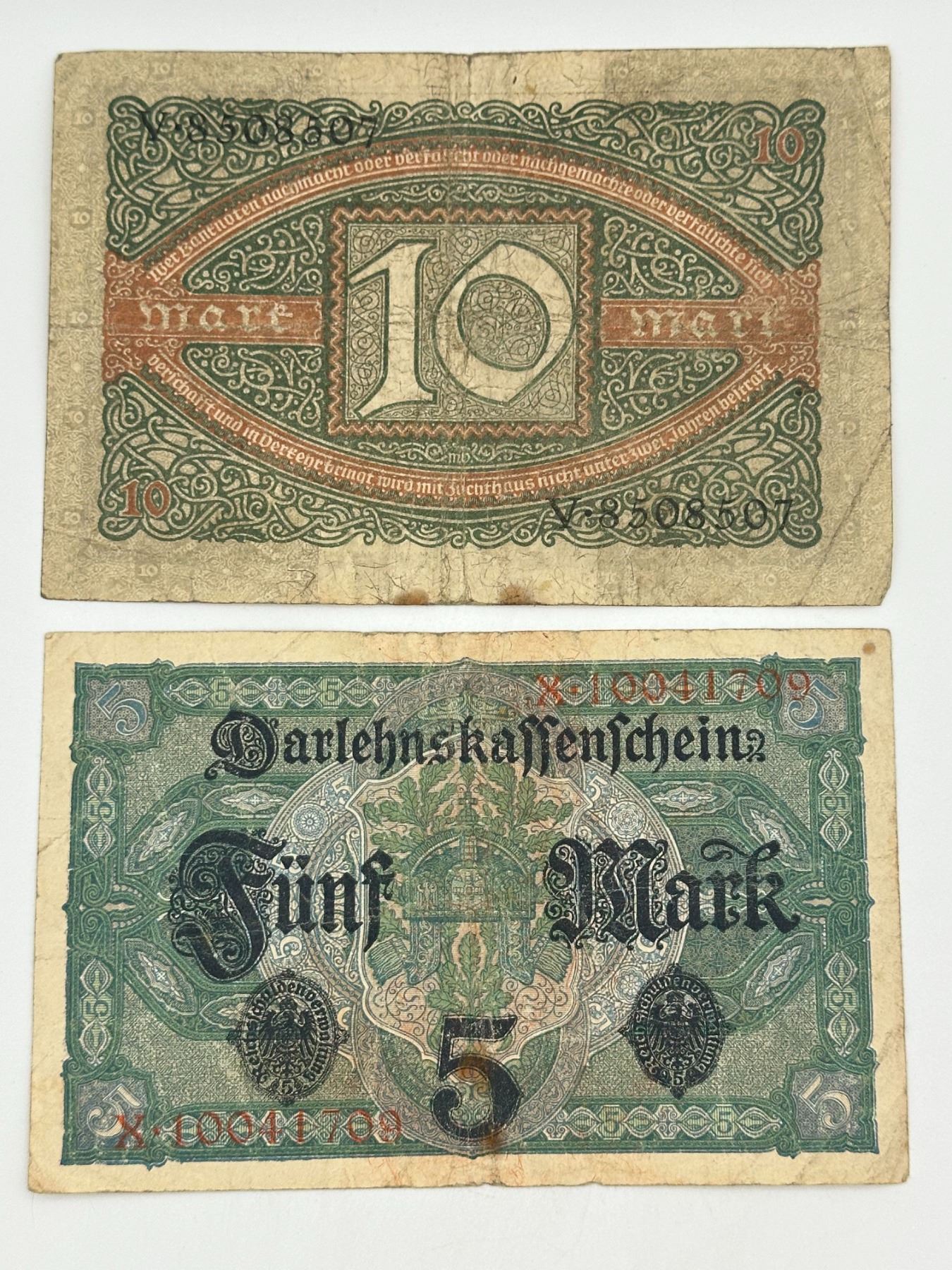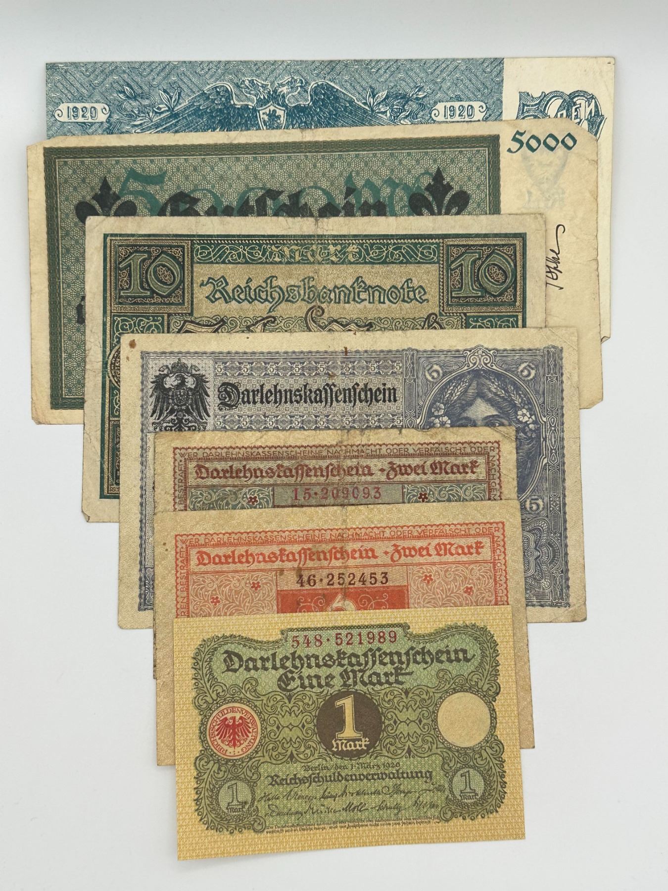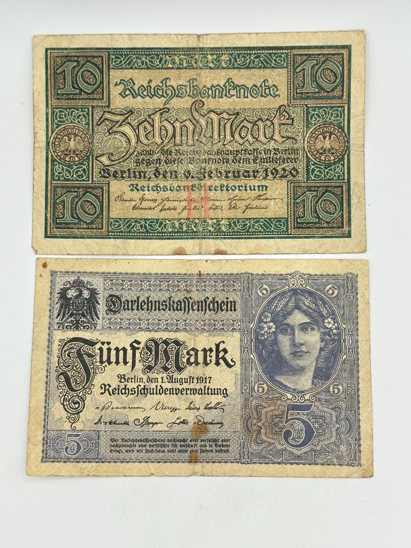 Group of six German notes including 1, 2, 5, and 10 Mark issues, early 20th century (incl. 1920). Mixed types and circulated condition.