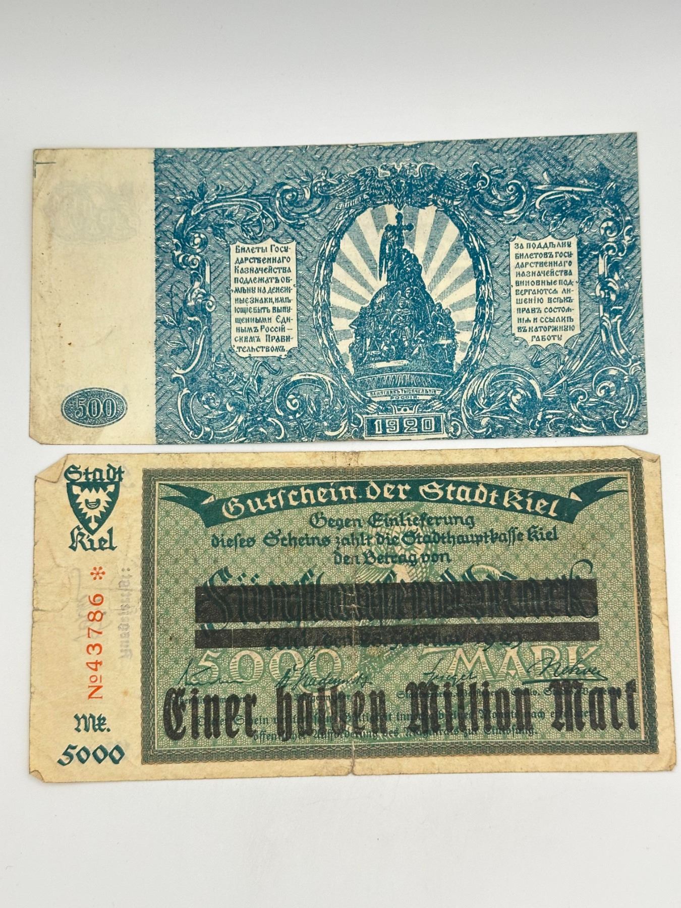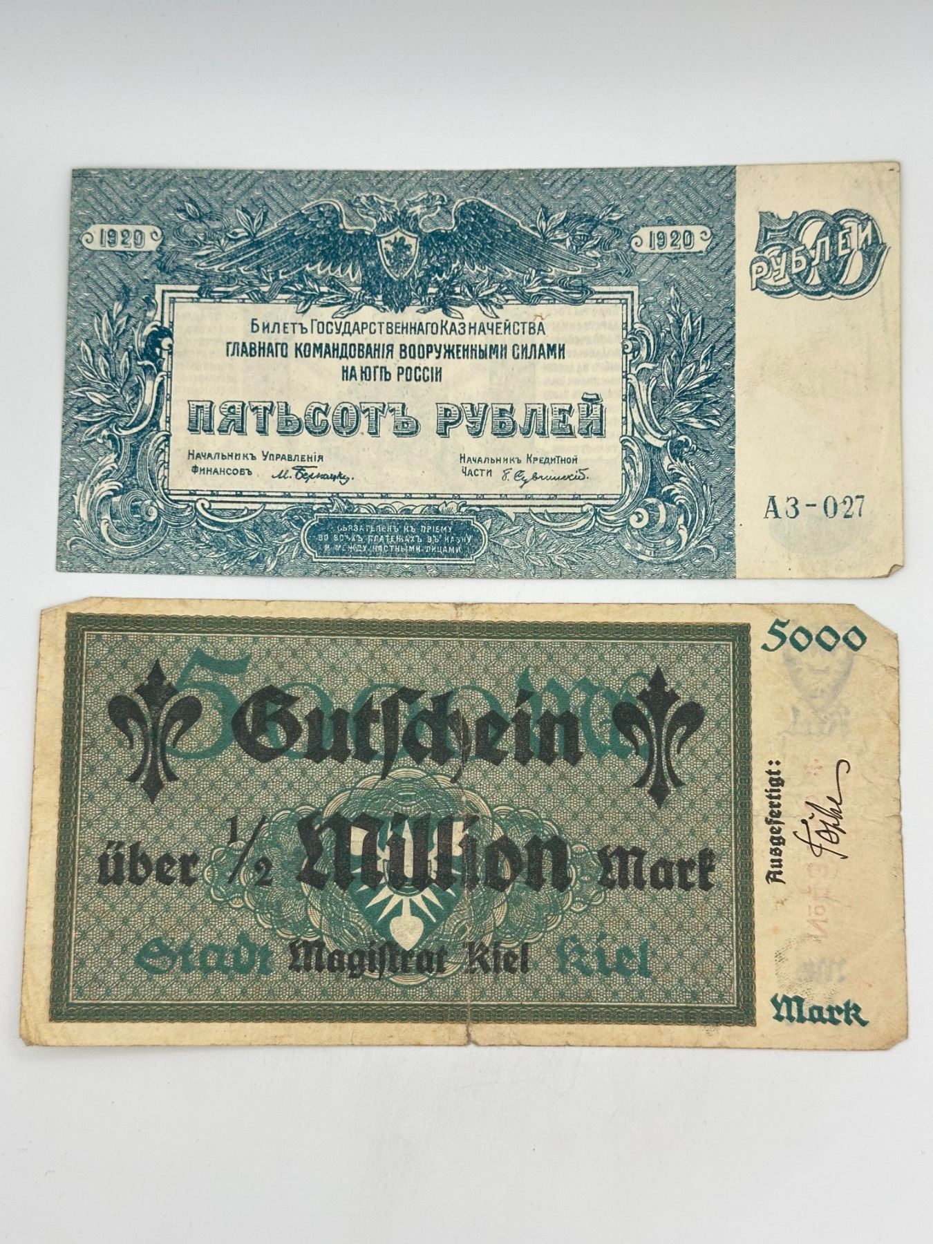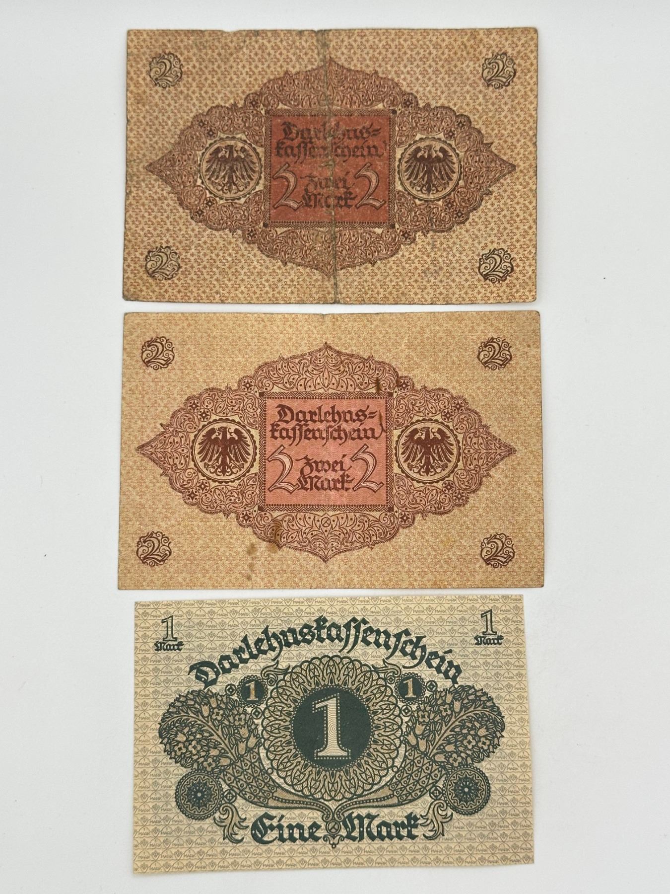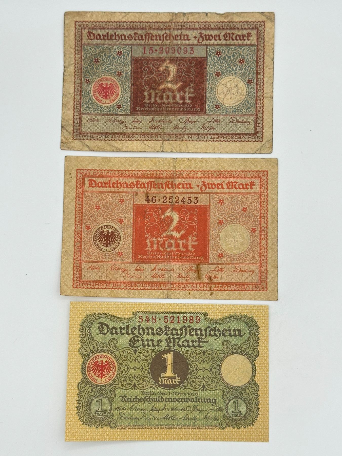 Group of six German notes including 1, 2, 5, and 10 Mark issues, early 20th century (incl. 1920). Mixed types and circulated condition.