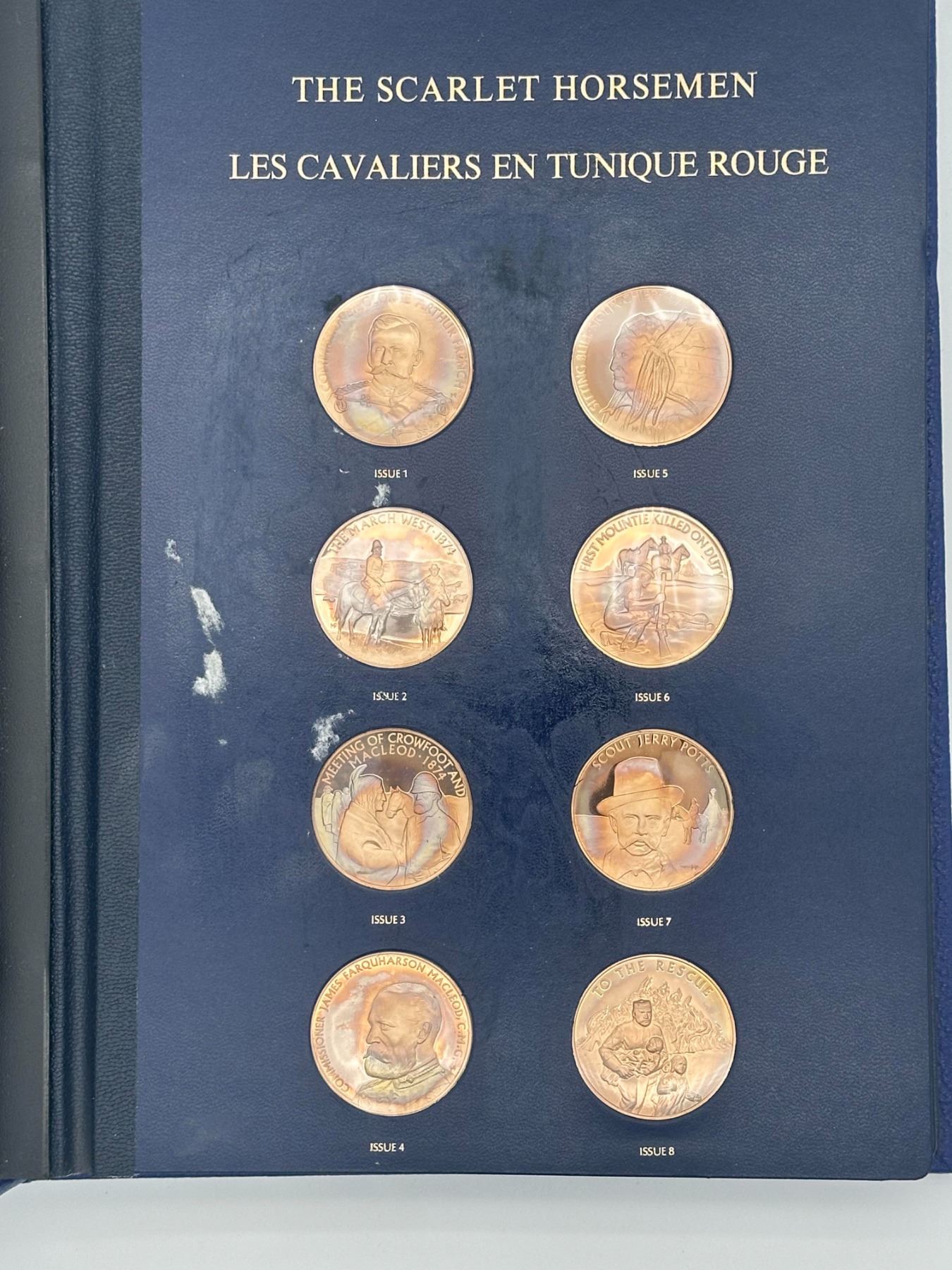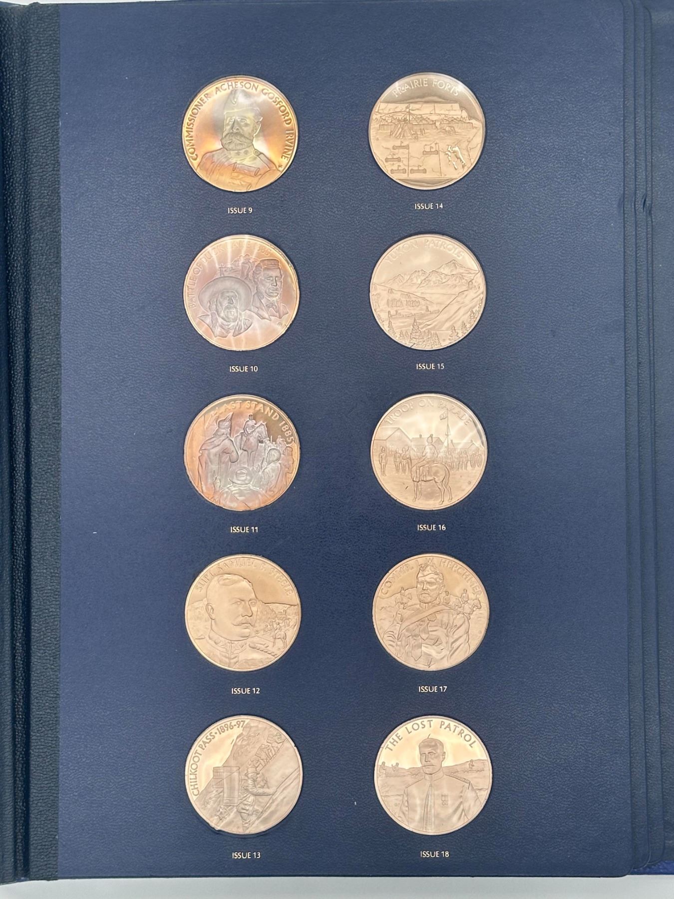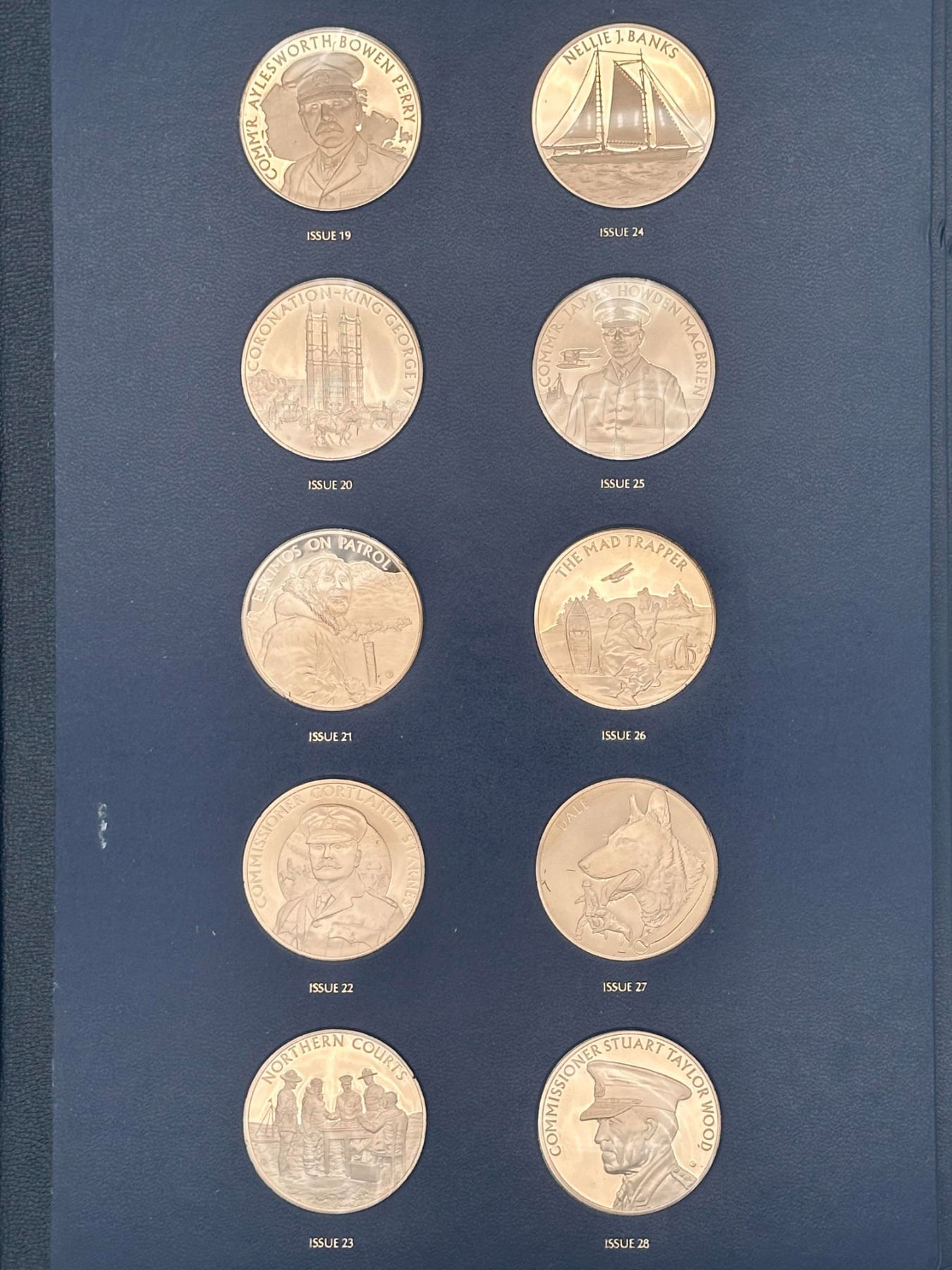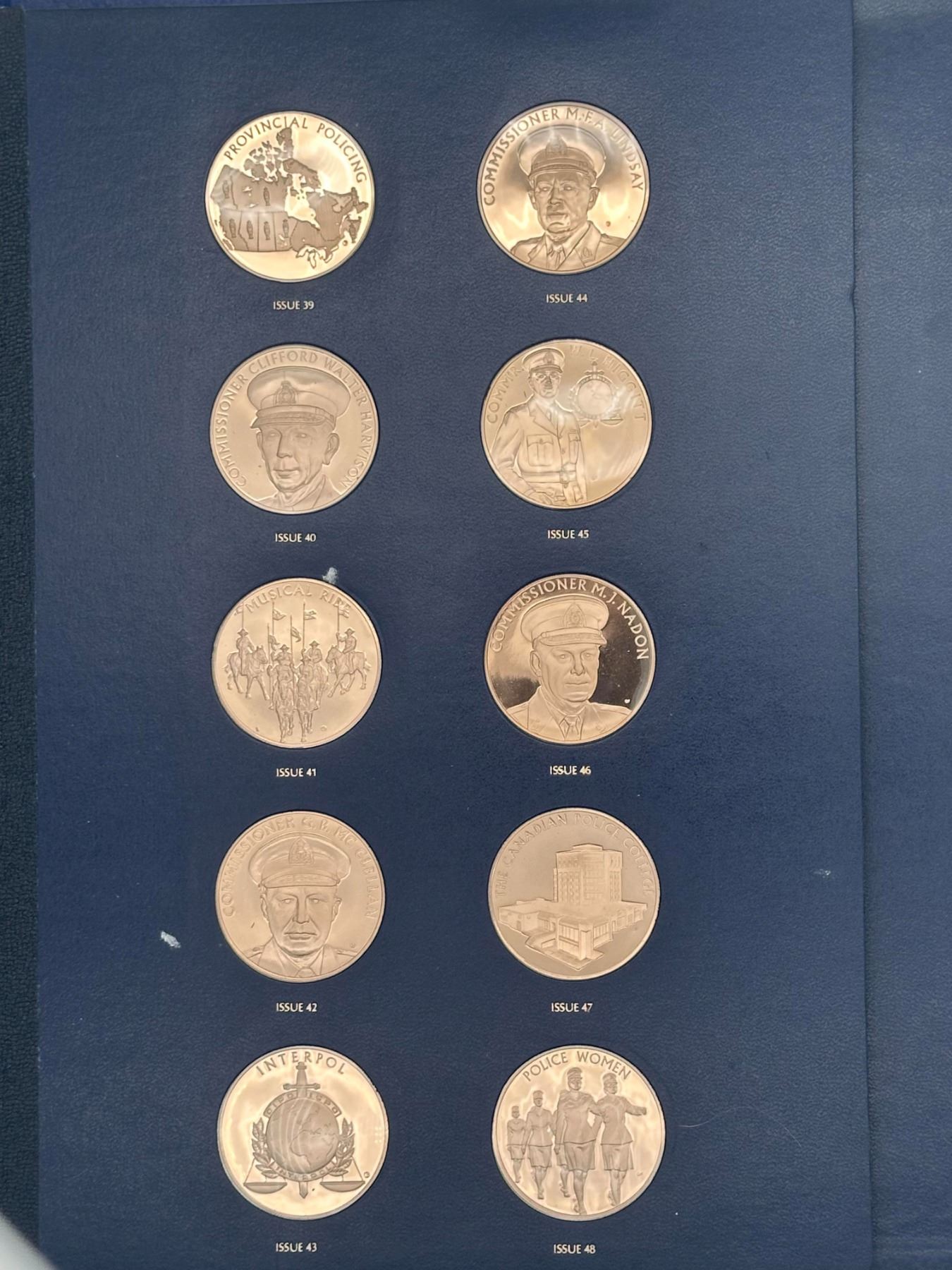 Royal Canadian Mounted Police centennial bronze medal set, 1873–1973, approx. 48 medals in album. Depicts RCMP history. Includes binder.