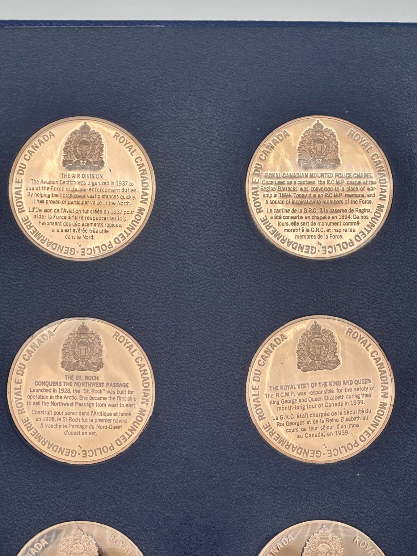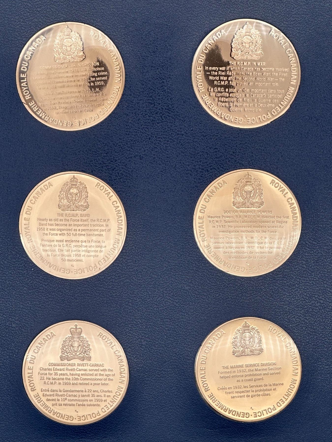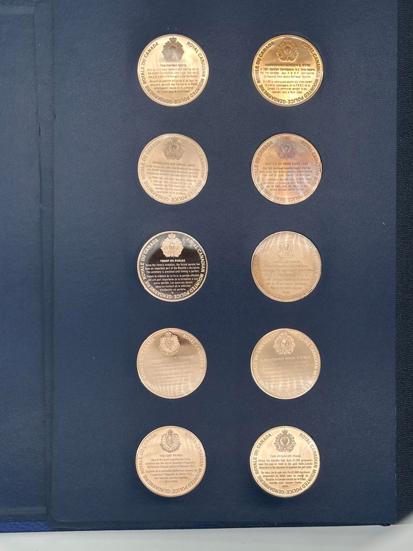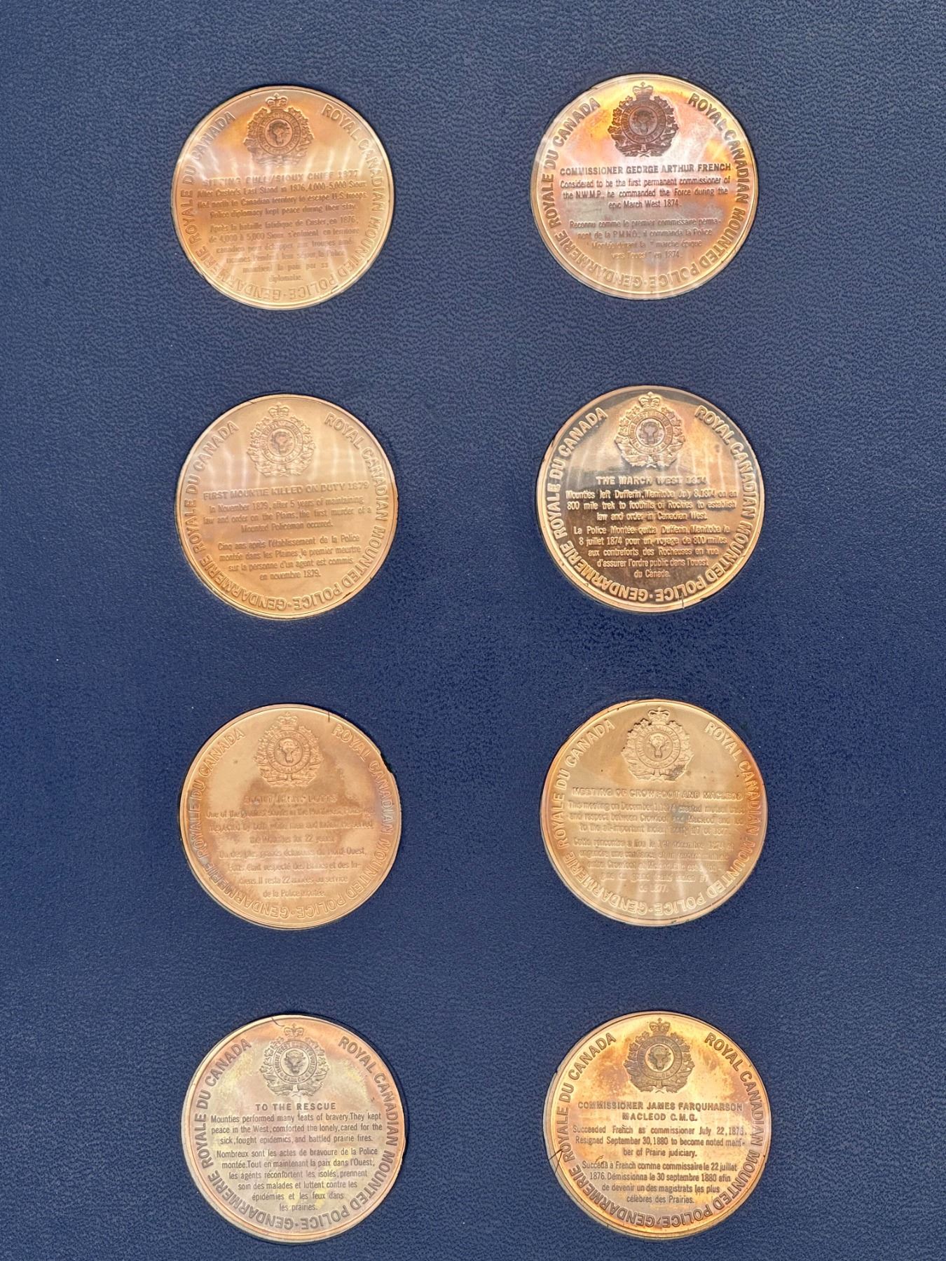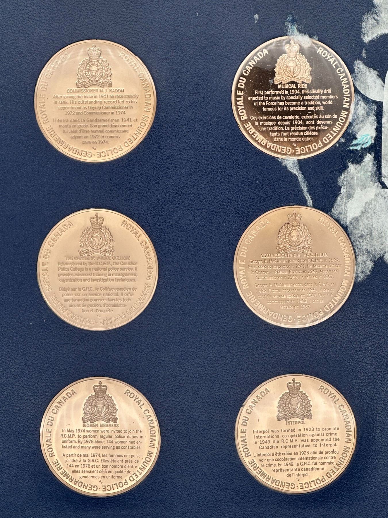 Royal Canadian Mounted Police centennial bronze medal set, 1873–1973, approx. 48 medals in album. Depicts RCMP history. Includes binder.