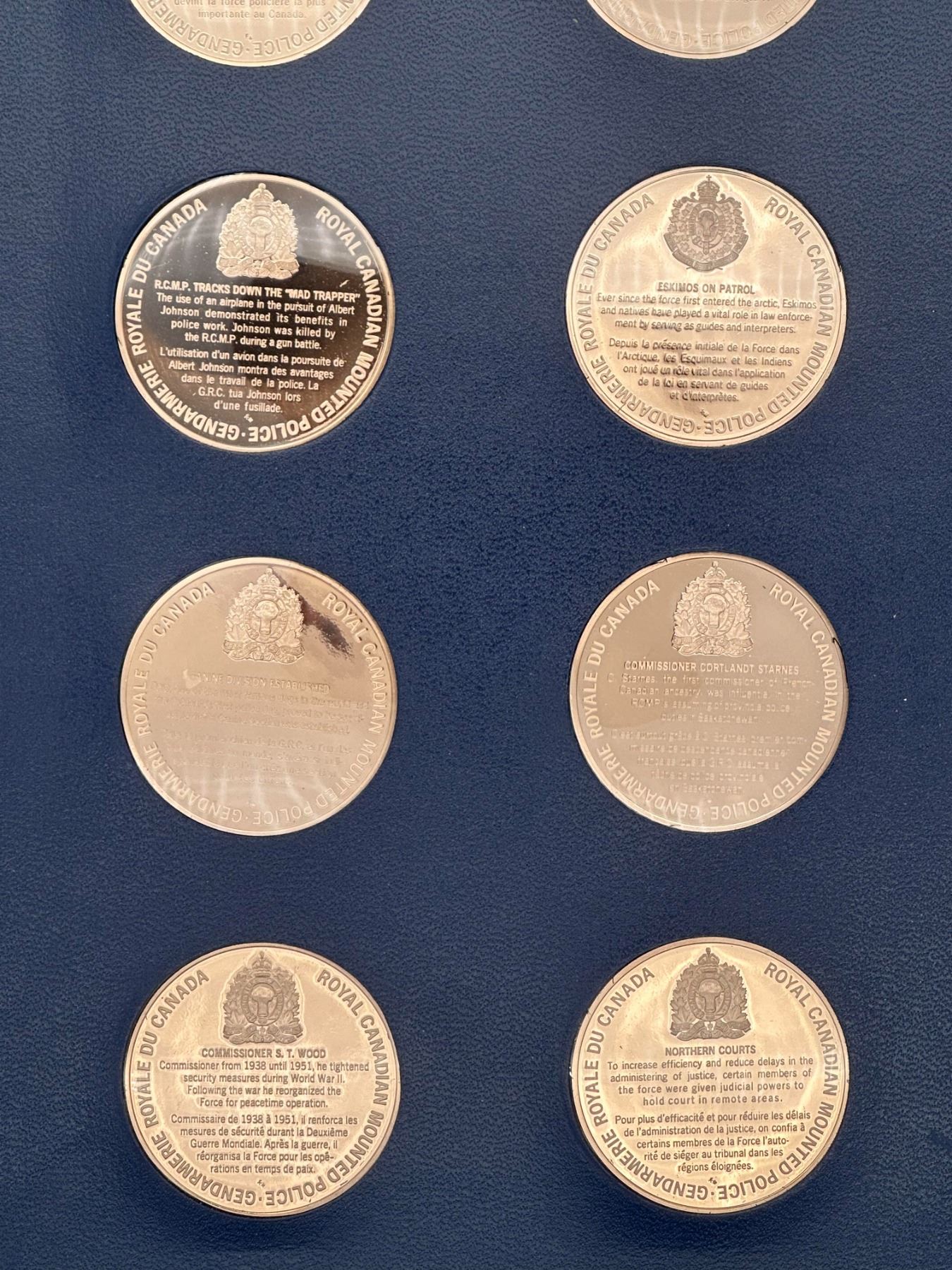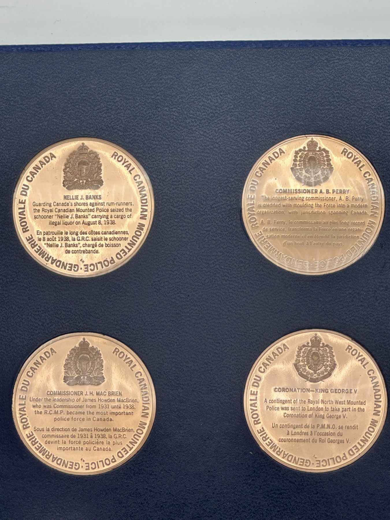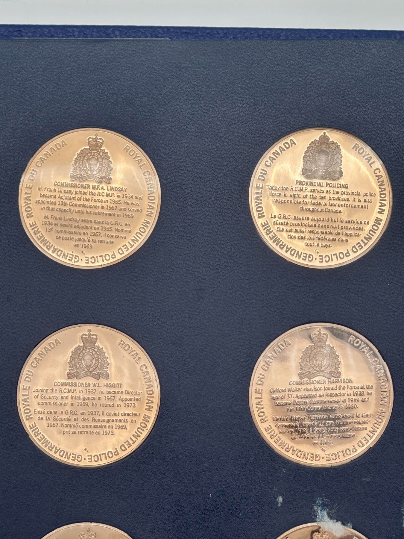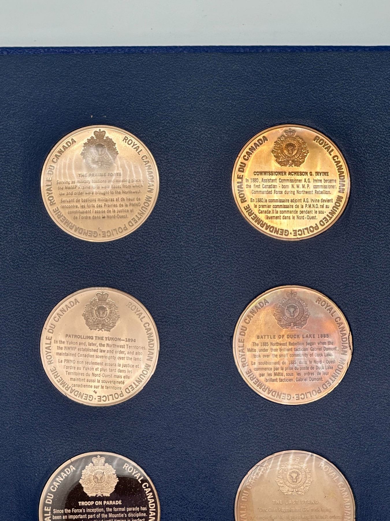 Royal Canadian Mounted Police centennial bronze medal set, 1873–1973, approx. 48 medals in album. Depicts RCMP history. Includes binder.