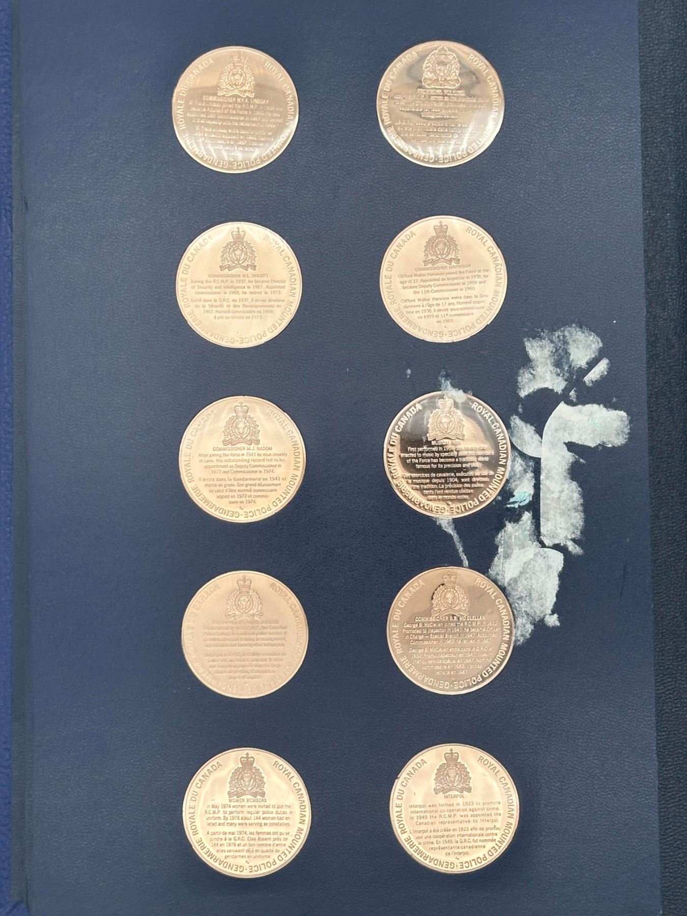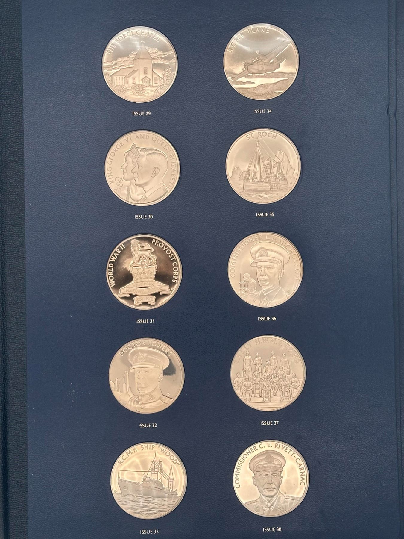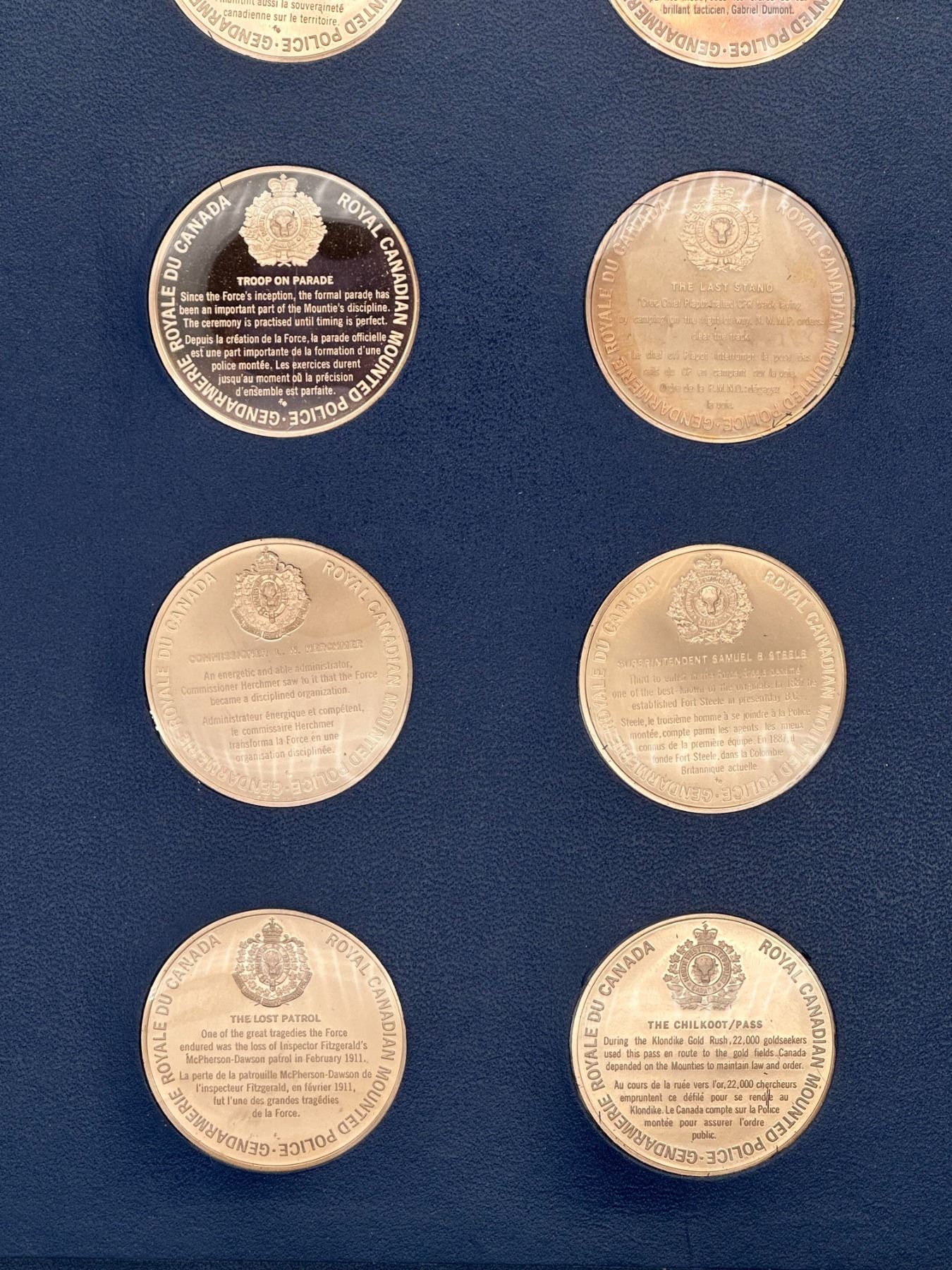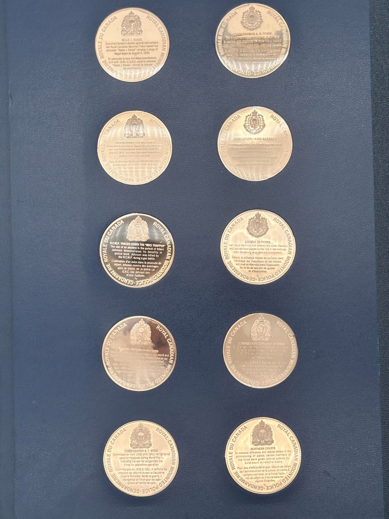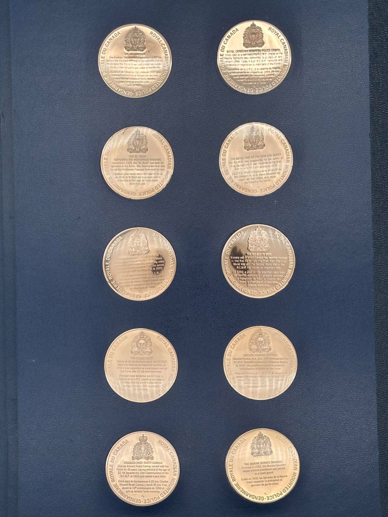 Royal Canadian Mounted Police centennial bronze medal set, 1873–1973, approx. 48 medals in album. Depicts RCMP history. Includes binder.