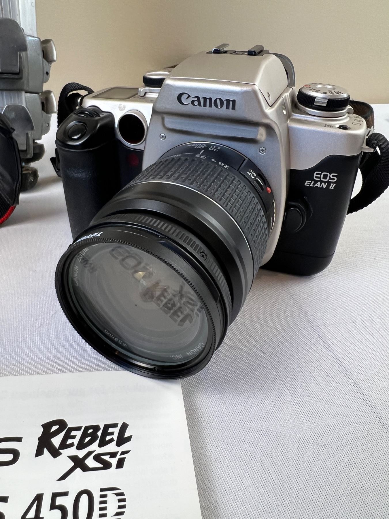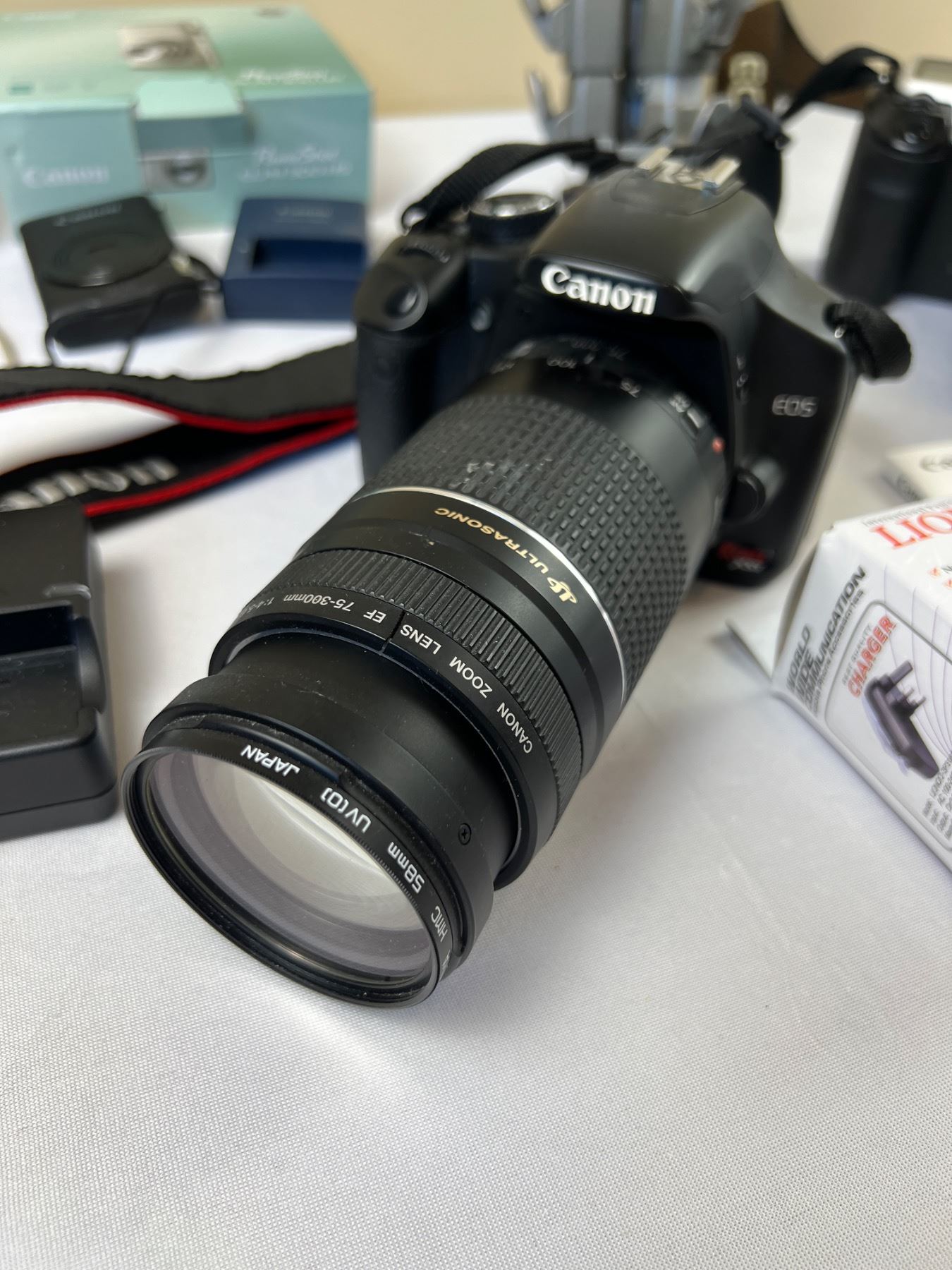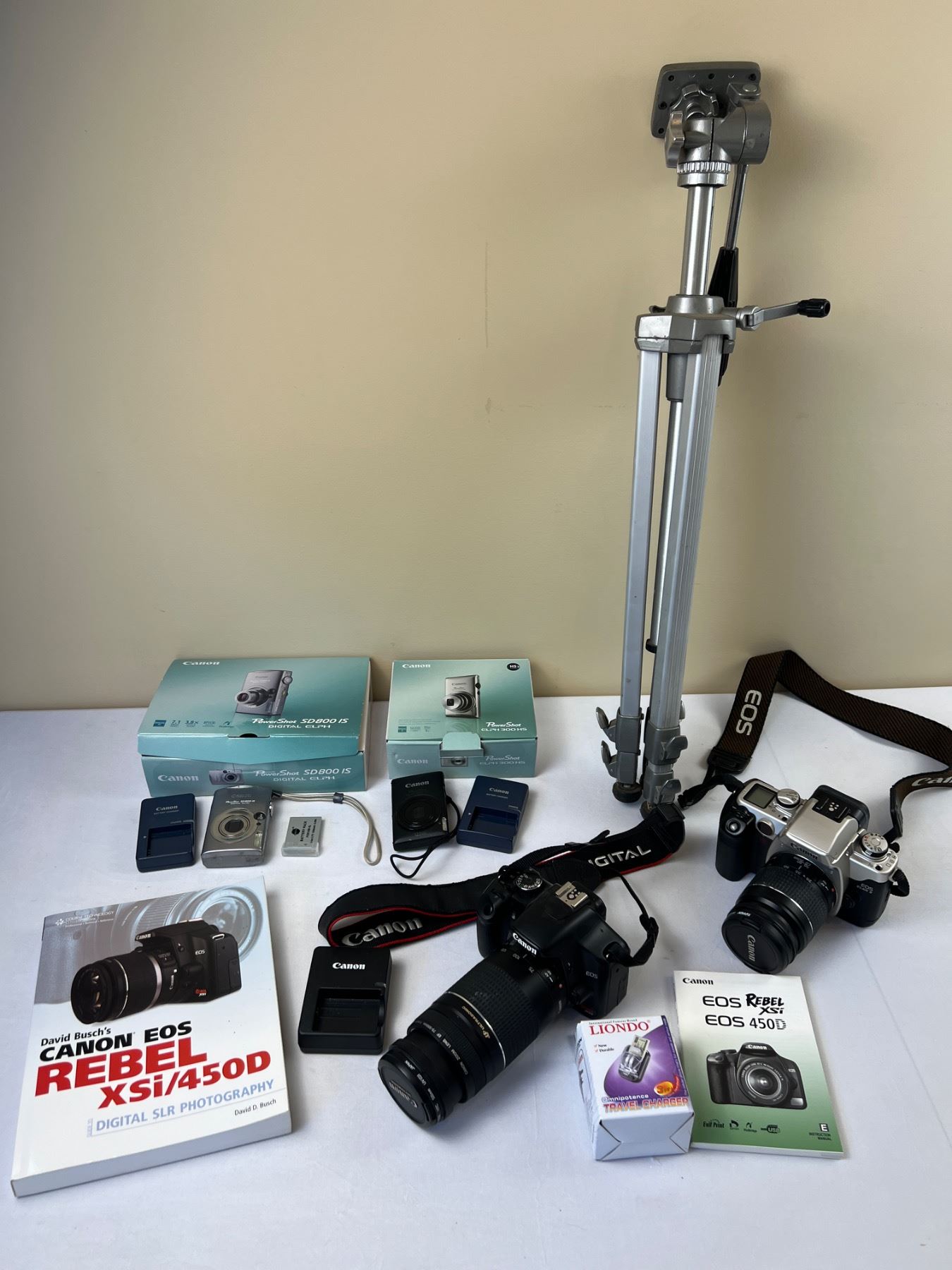 Includes a Velbon tripod, EOS Elan II, EOS Rebel XSI, Power Shot SD800 IS, Power Shot ELPH 300 HS, not tested