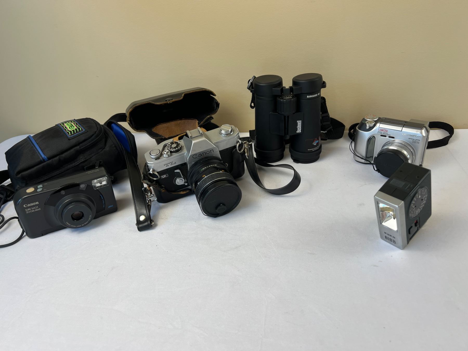Includes a Canon Sure Shot, Canon TL, Olympus Optical Zoom, Bushnell Legend E Series 10x42 binoculars, and more, not tested