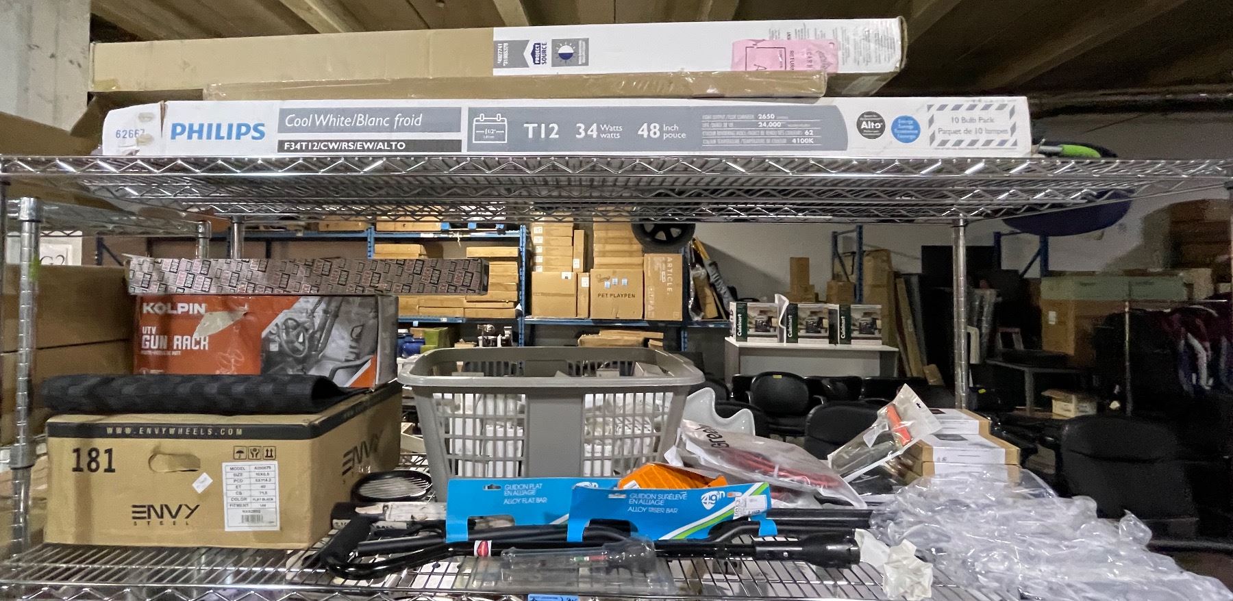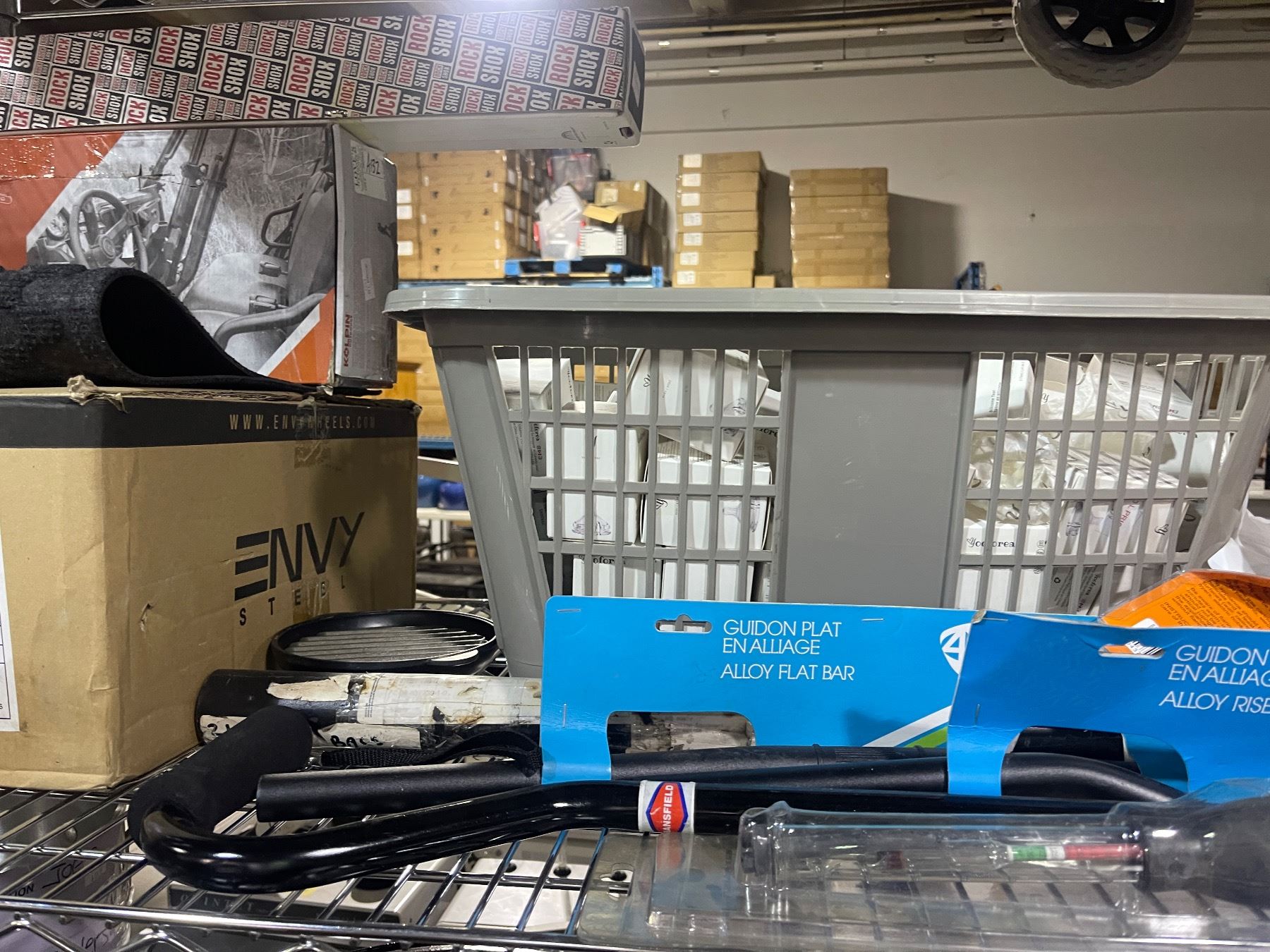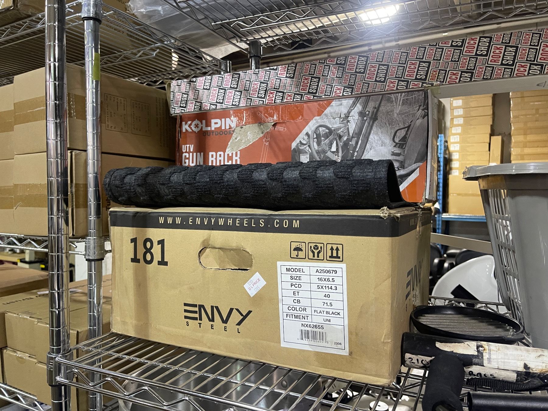 Lot 358 2-Shelf of Assorted Merchandise - Envy Wheels, Kolpin UTV Gun Rack, Philips Cool White Light Bulbs,