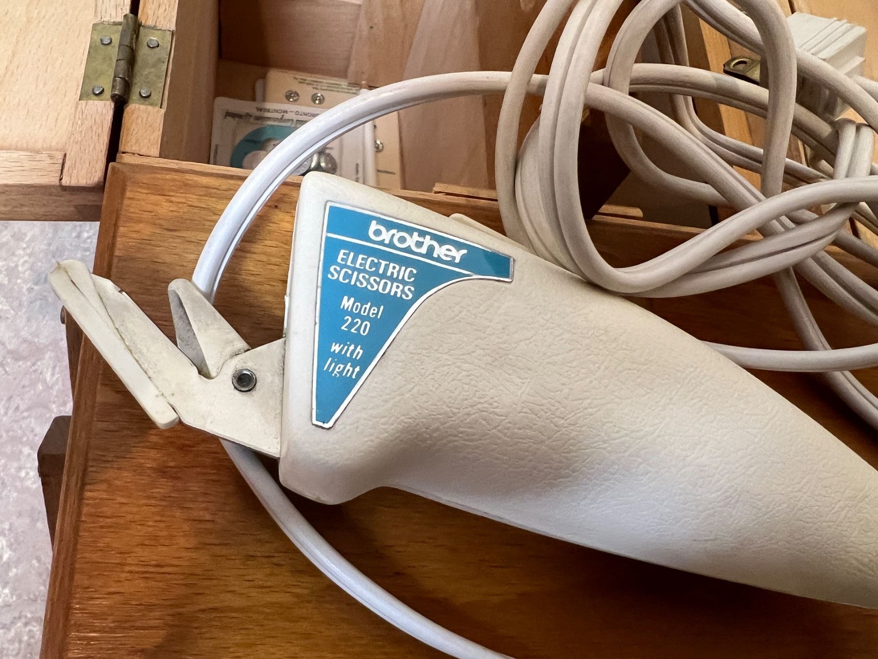 Includes a pair of Brother Electric Scxissors (works), the sewing box is 17.5"L x 9"W x 8"H when closed