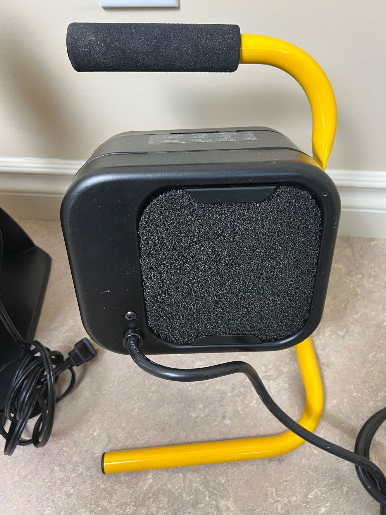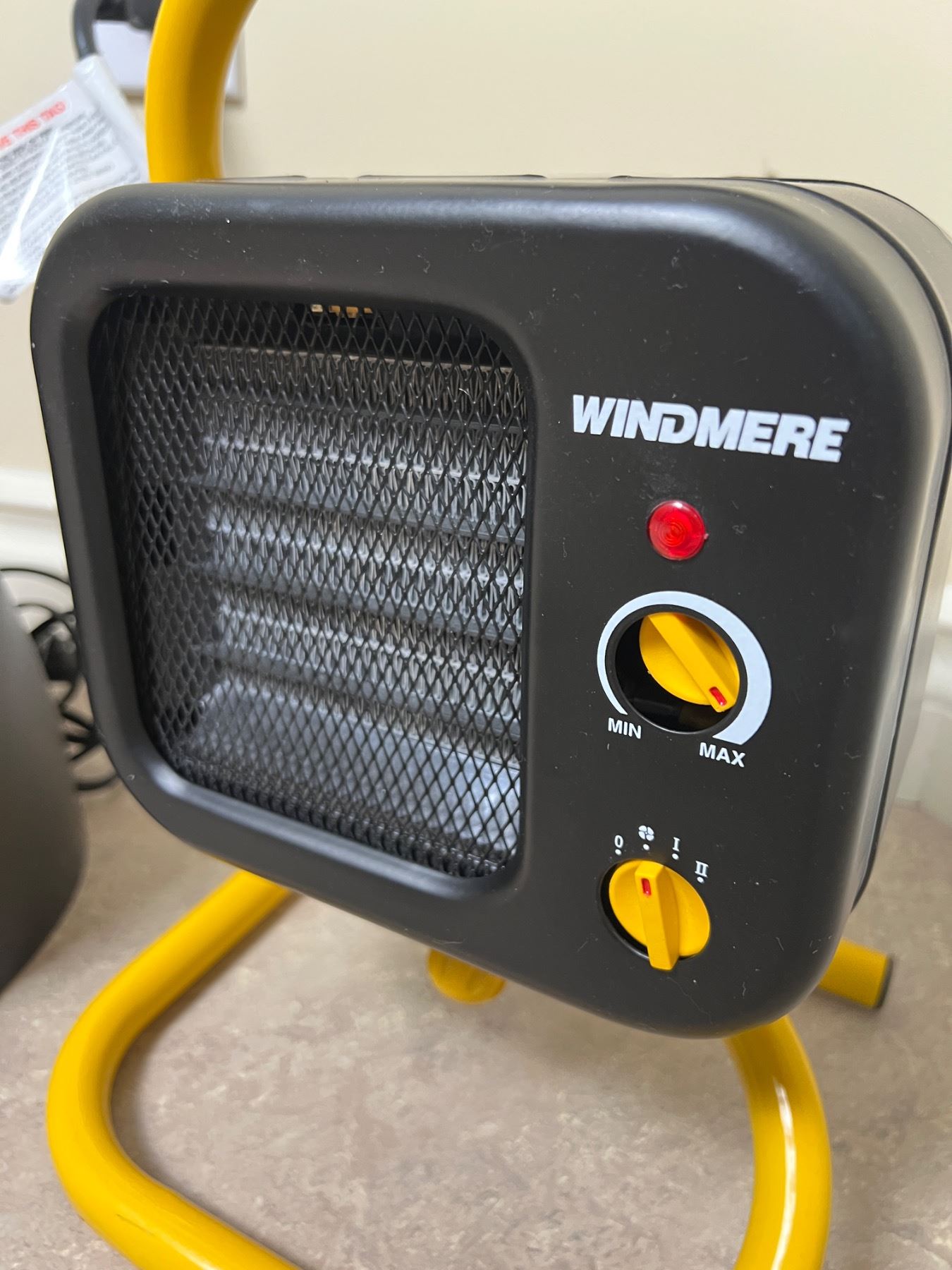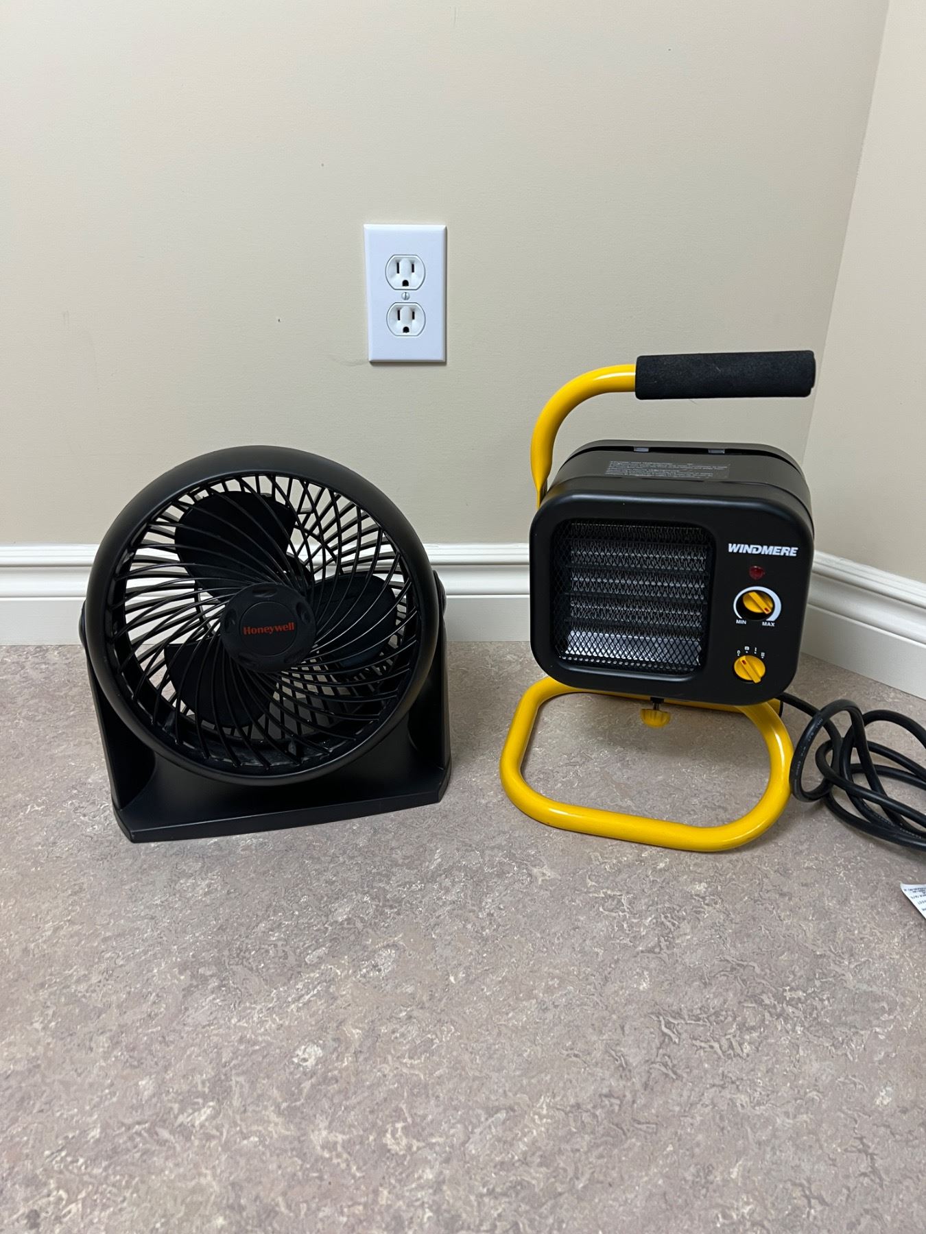 Includes a Honeywell fan and a Windmere heater, both power on, the heater is 9"L x 8"W x 14"H