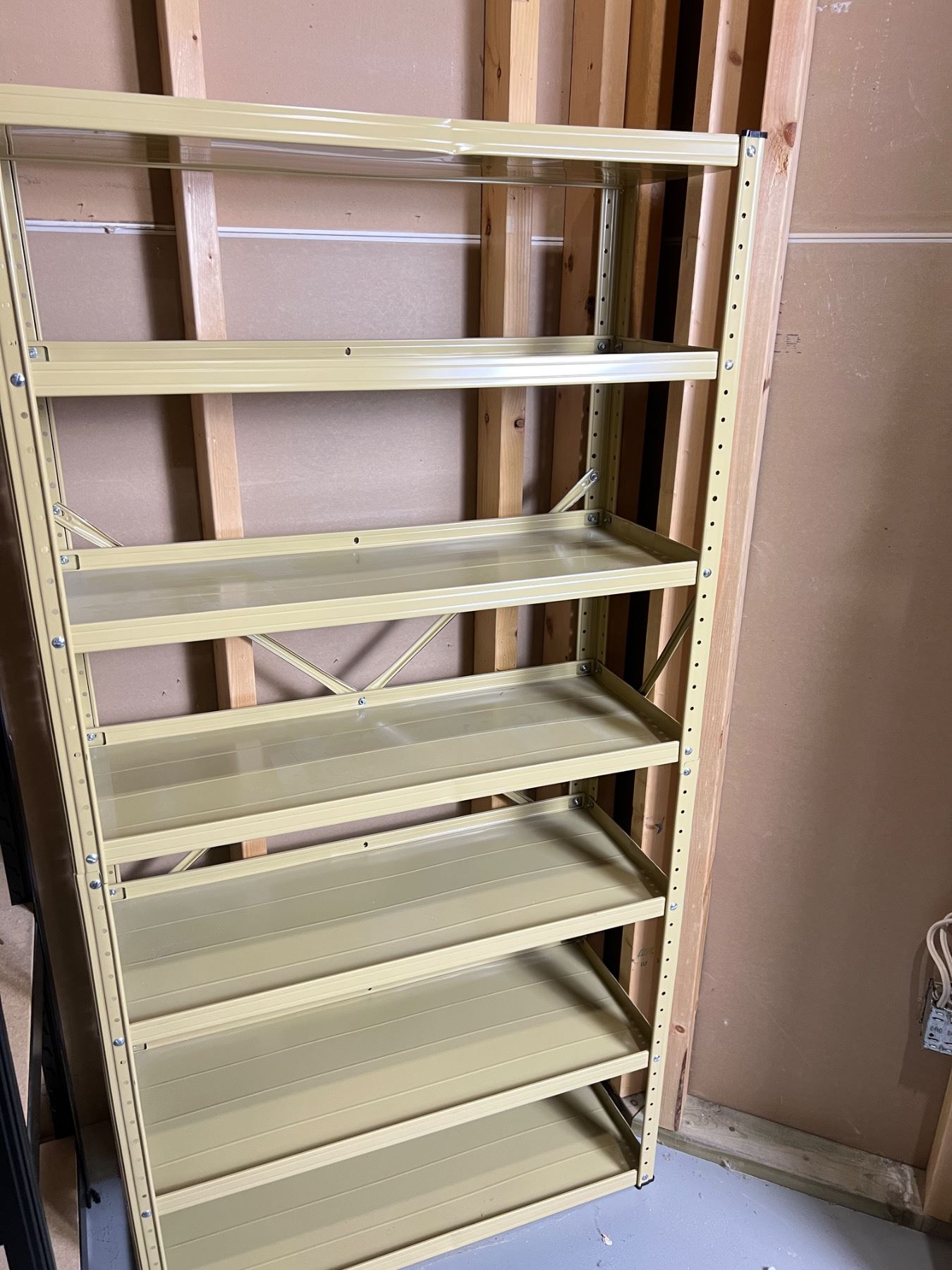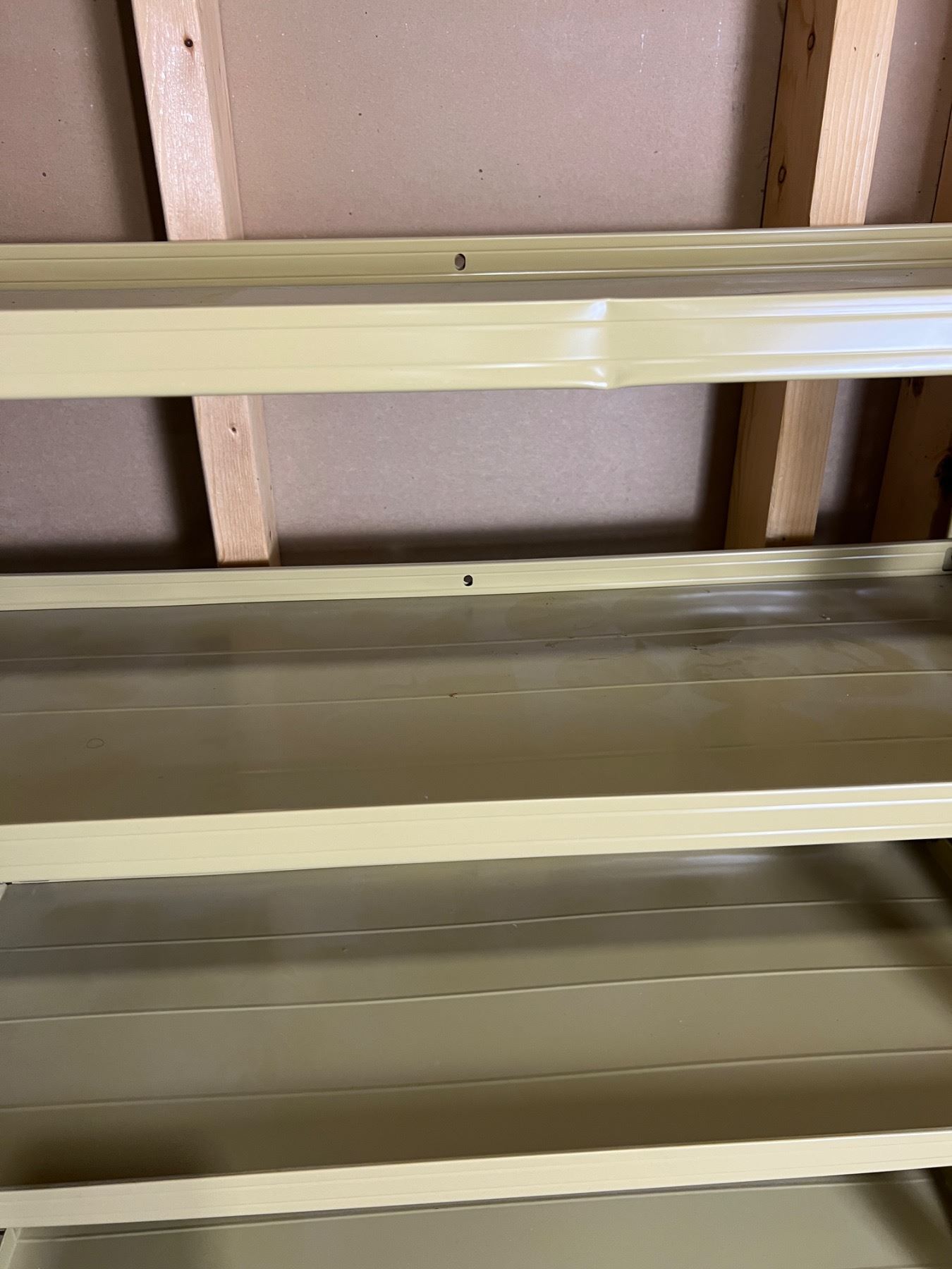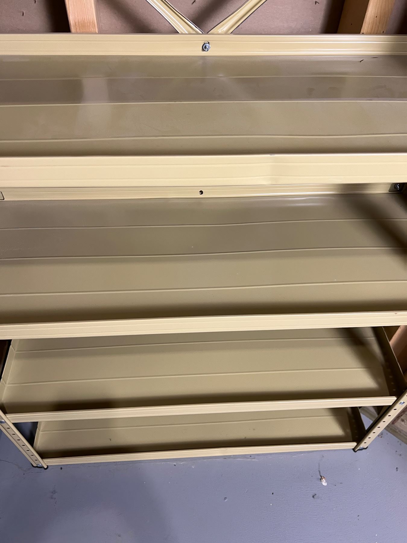 30"L x 11"W x 58"H, has some dents on the front of the shelfs