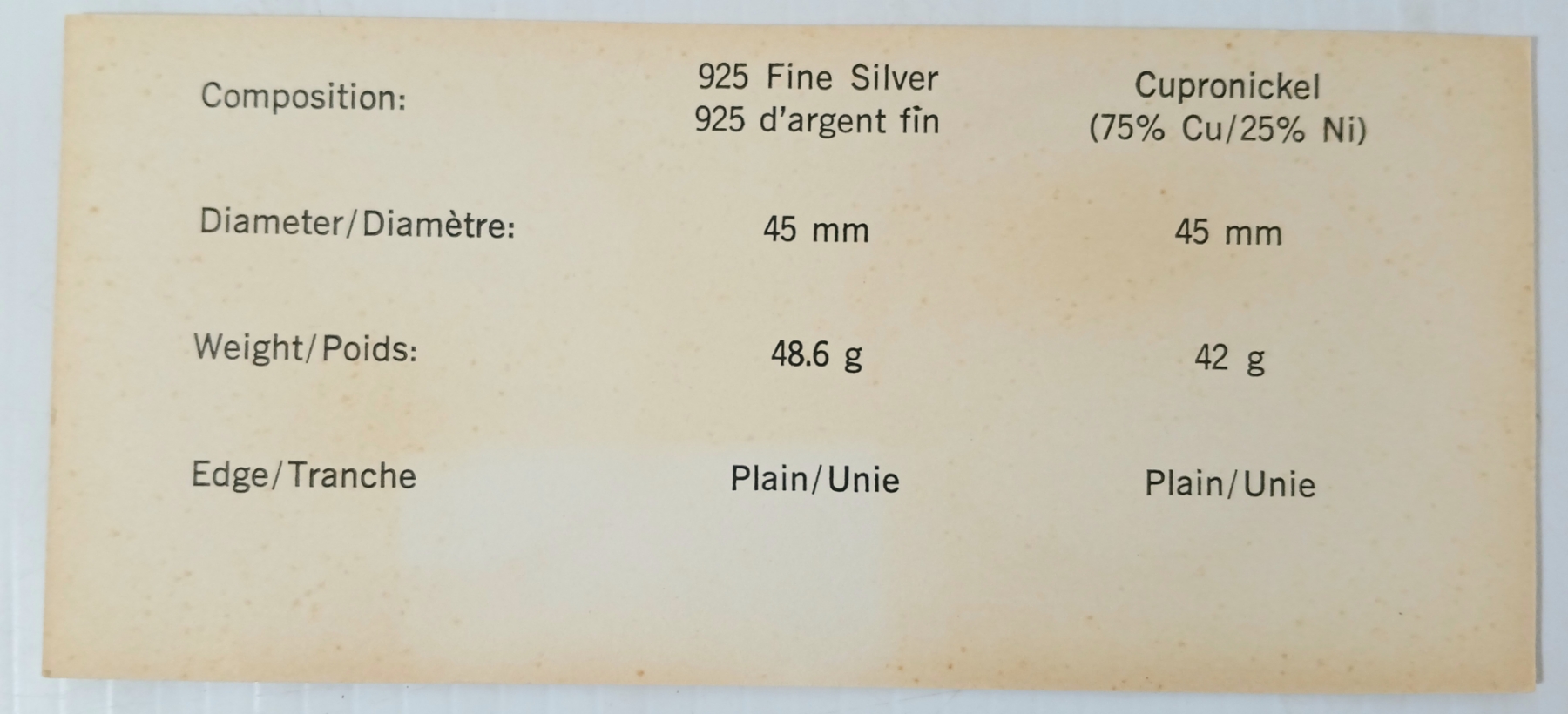 NOTE: 925 FINE SILVER, 45 MM, 48.6 G - CUPRONICKEL(75% CU/25% Ni) 45 MM, 42 G - BOTH PLAIN EDGE.