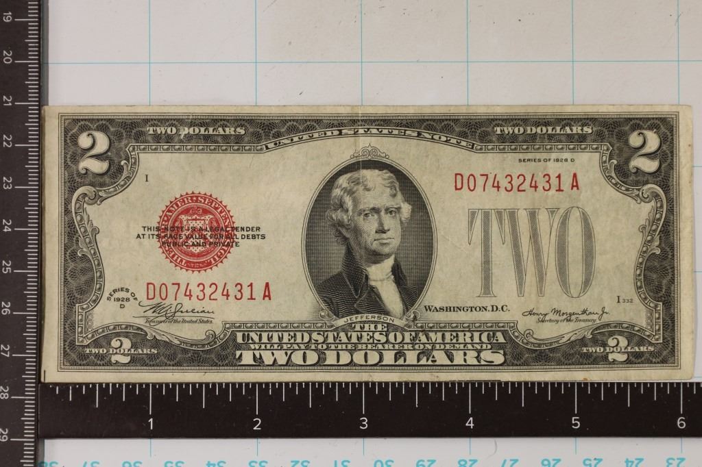 #22 Lot 22 1928-D US $2 RED SEAL NOTE. CRISP WITH A COUPLE OF