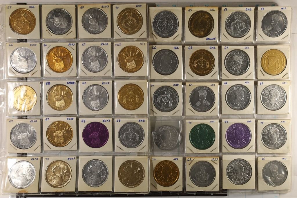 MERRY MASKERS, ELK'S KREWE OF ORLEANS, GONE ARE THE DAYS. ALL TOKENS ARE ALUMINUM IN 20 POCKET PAGES.