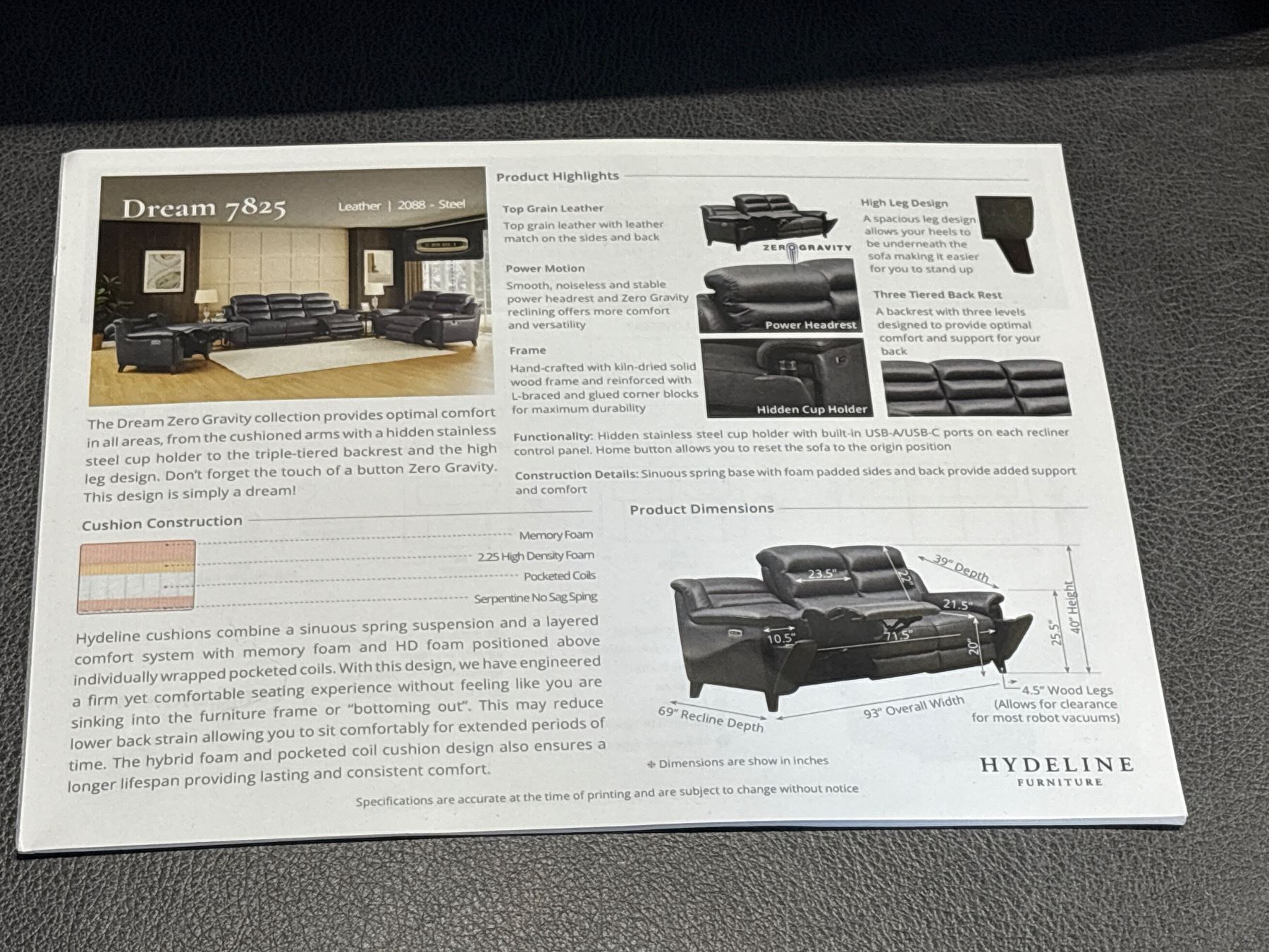 New – Hydeline Dream 7825 Top Grain Leather Power Sofa with Zero Gravity Reclining, Power Headrest, Hidden Cup Holders with USB, and Kiln-Dried Solid Wood Frame – 93" W x 39" D x 40" H – Retail Price: $3,599