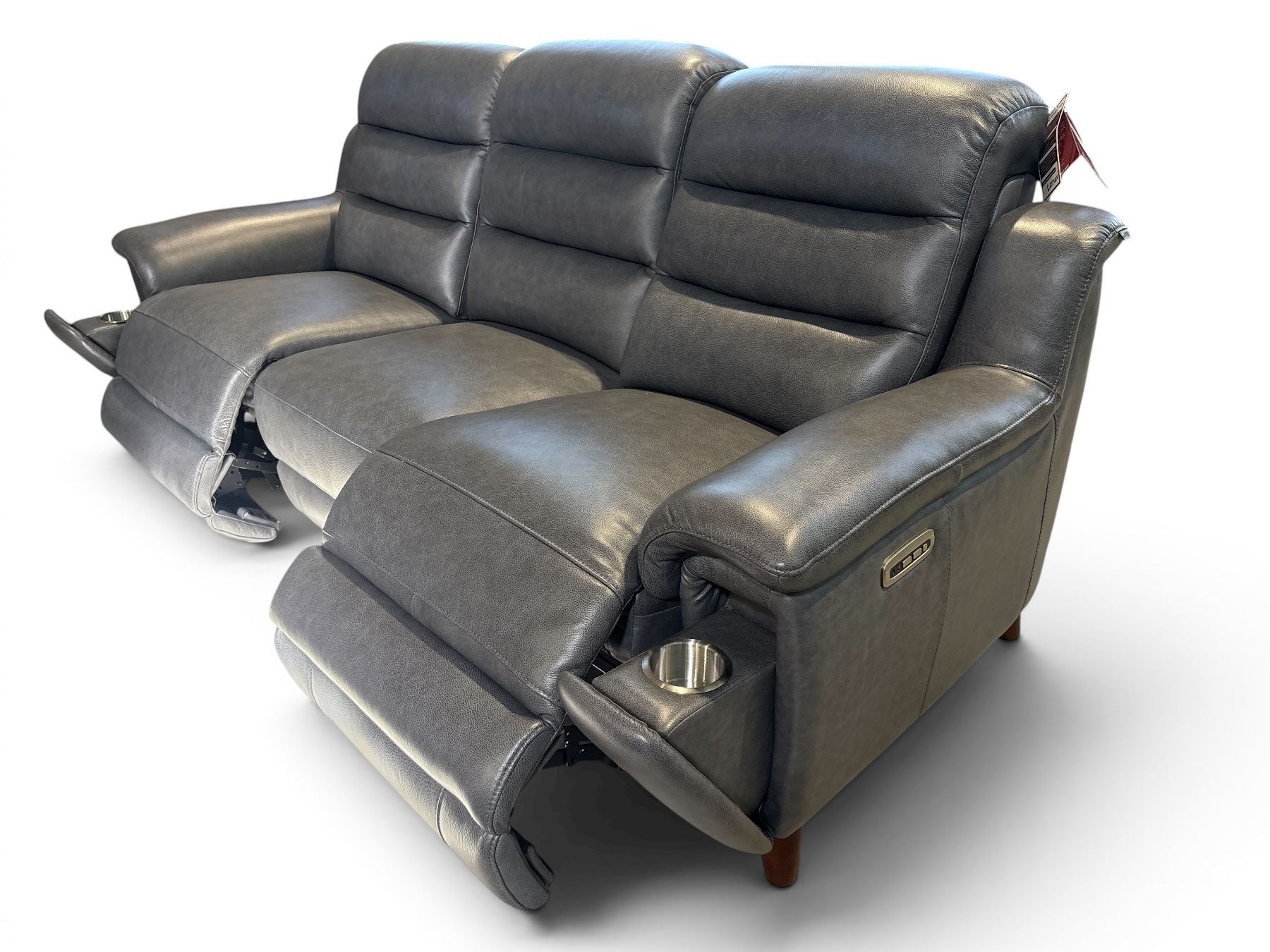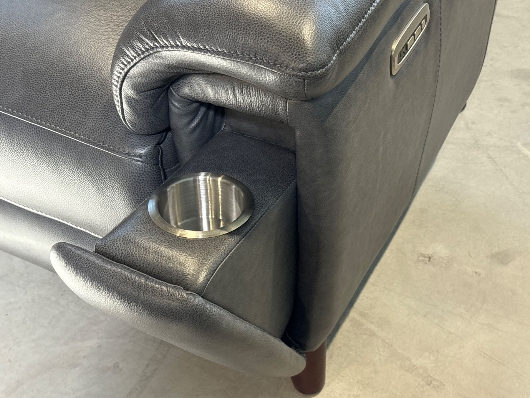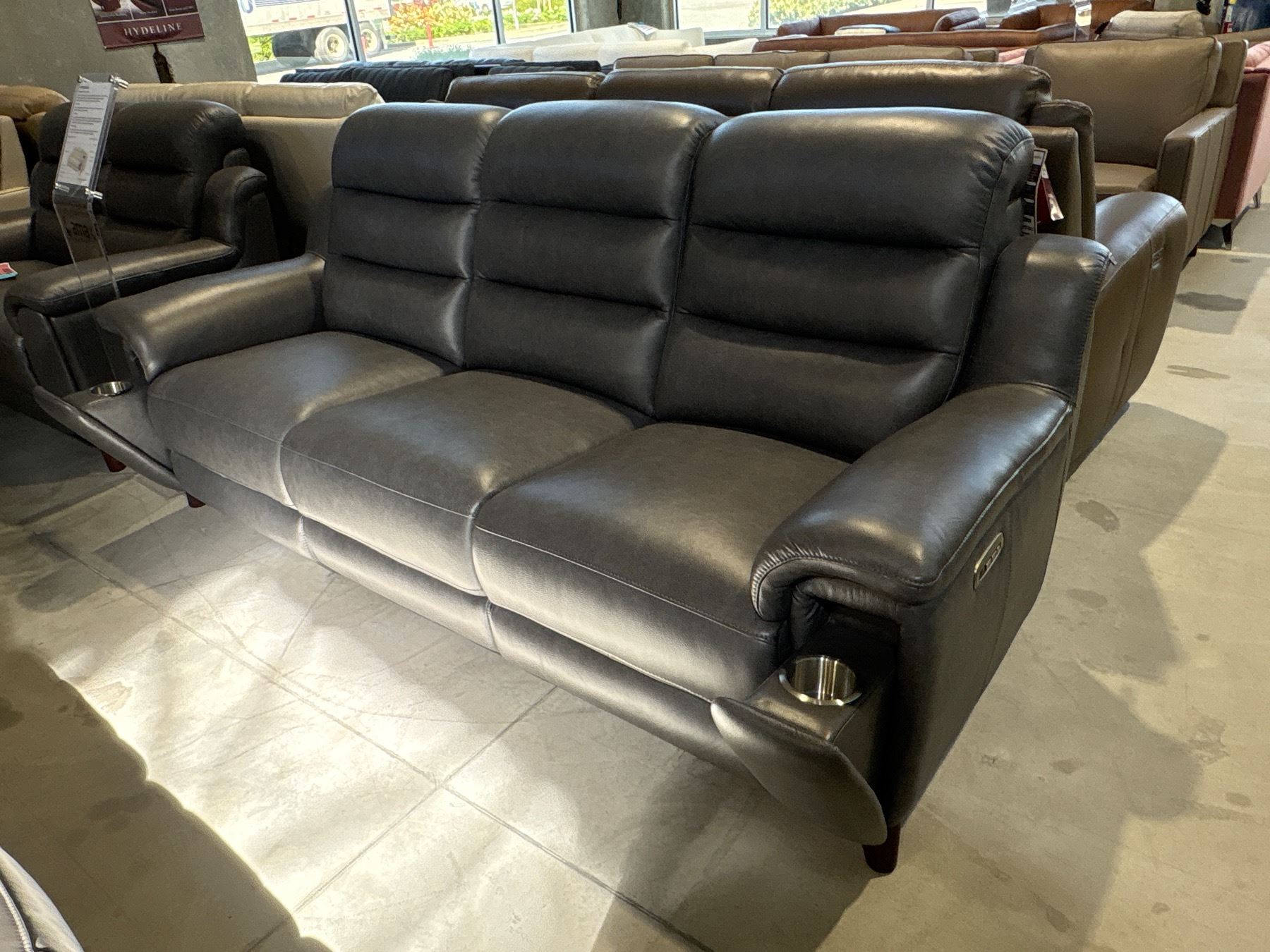 New – Power Reclining Sofa with Power Headrest, Hidden Cupholders, Leggett & Platt Mechanisms, Okin Silent Motors, High Density Memory Foam, and Down Feather – Retail Price: $3,699