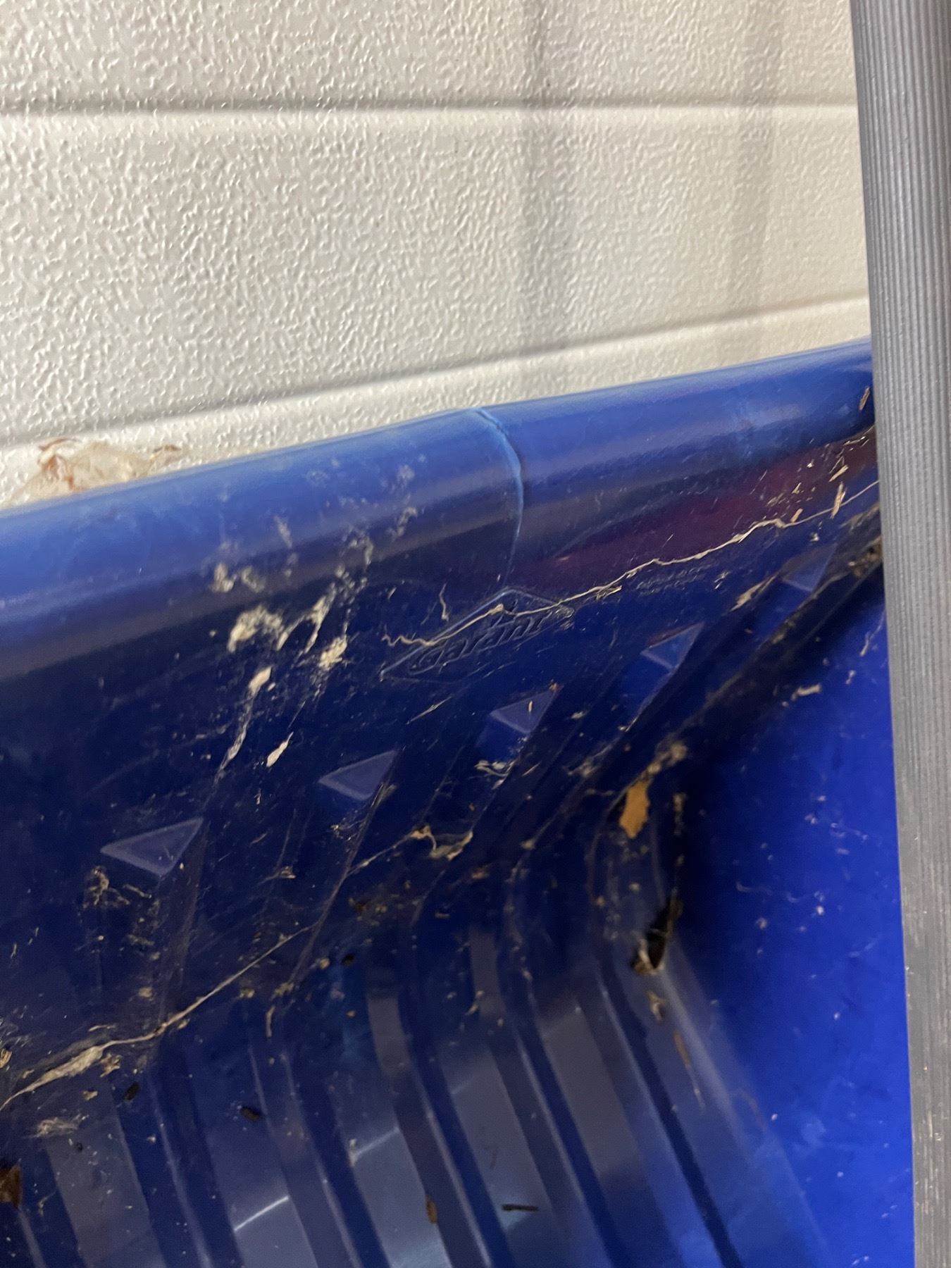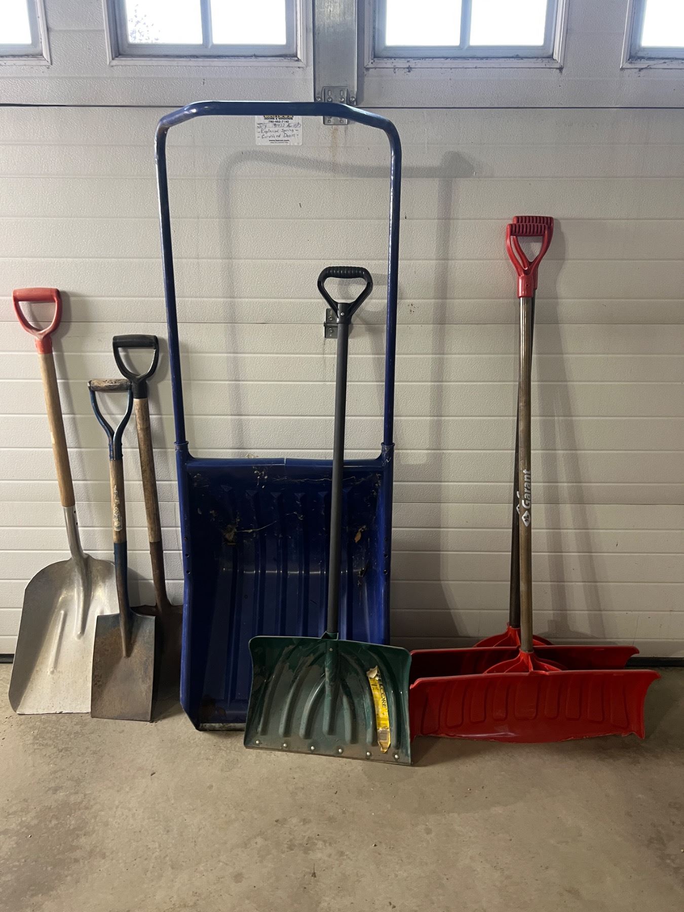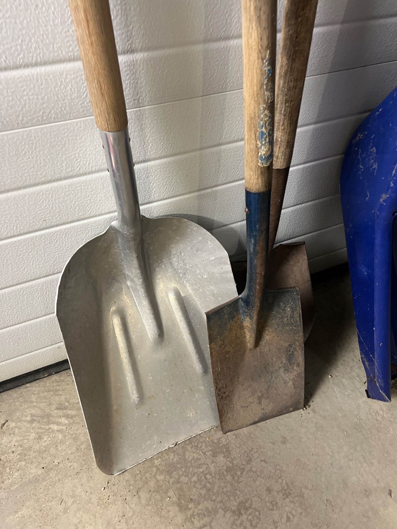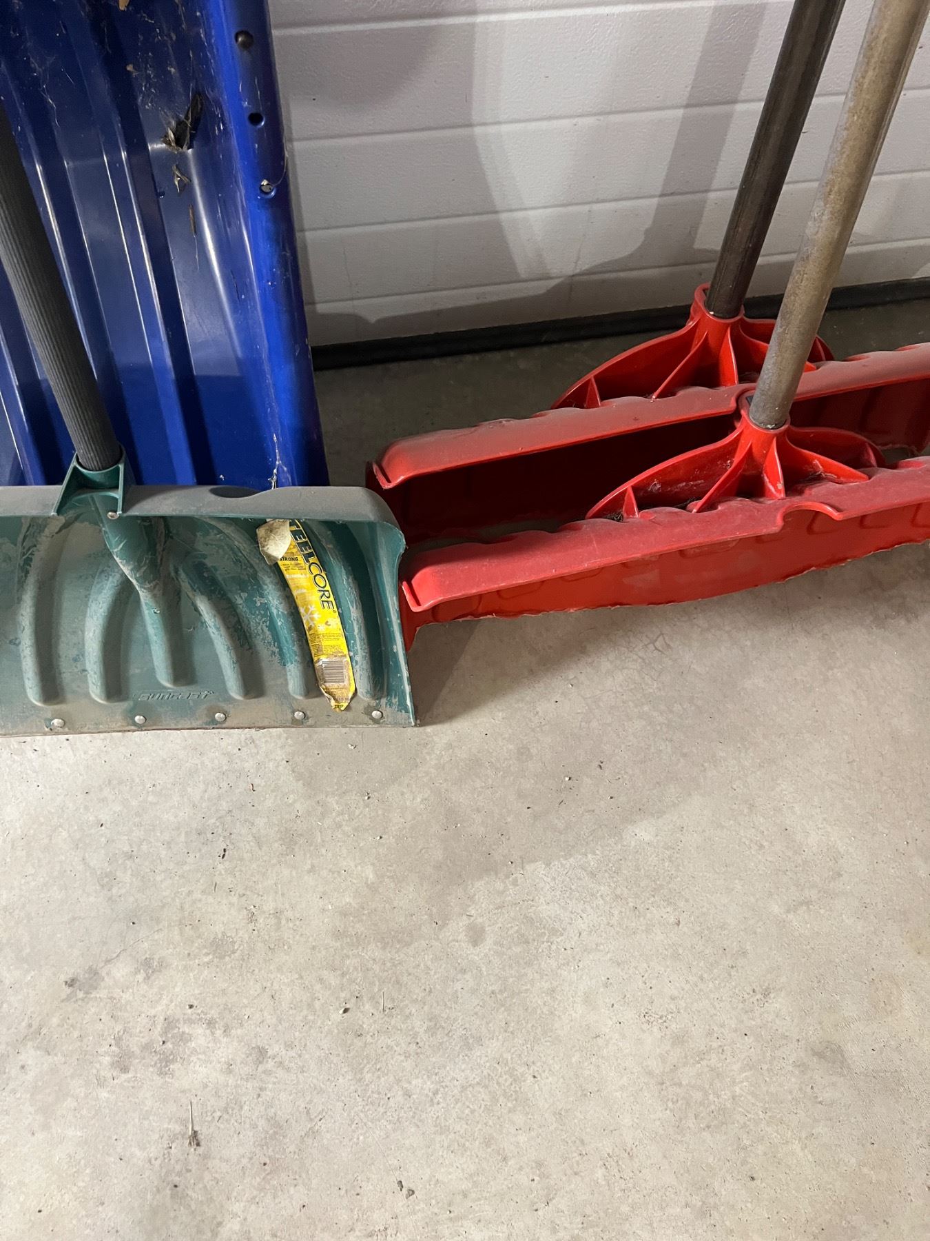 The blue Grant shovel has a crack in it, some wear and tear