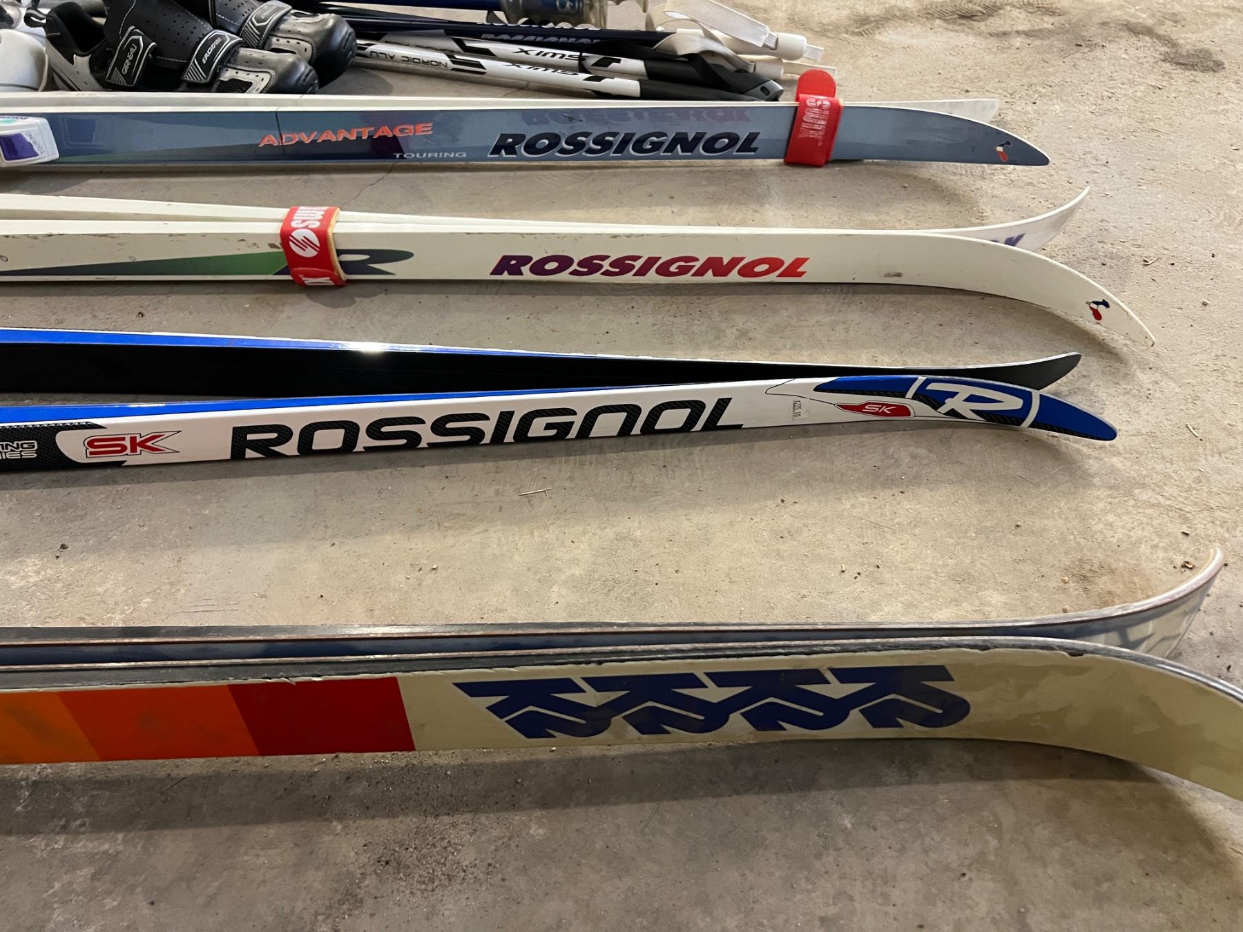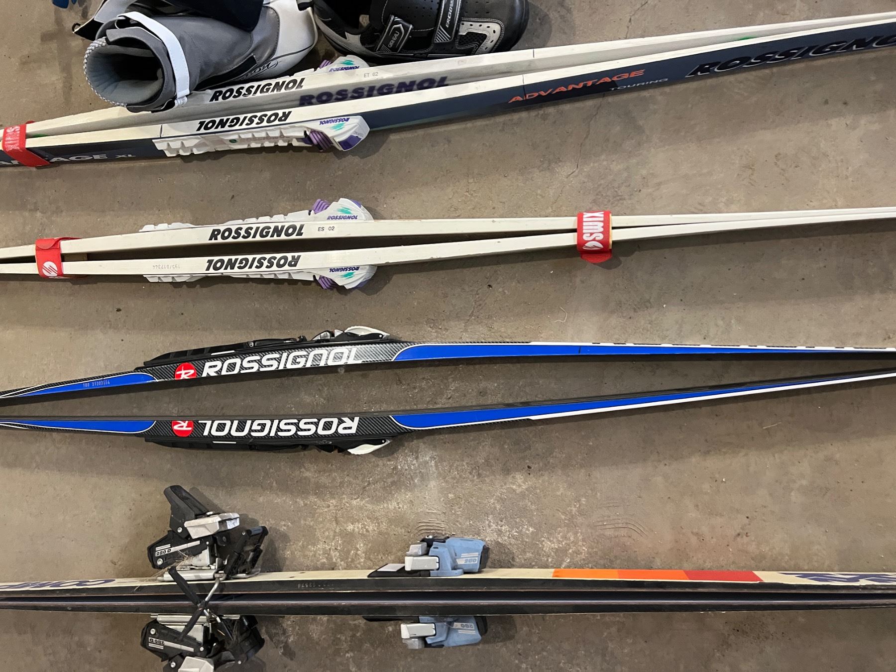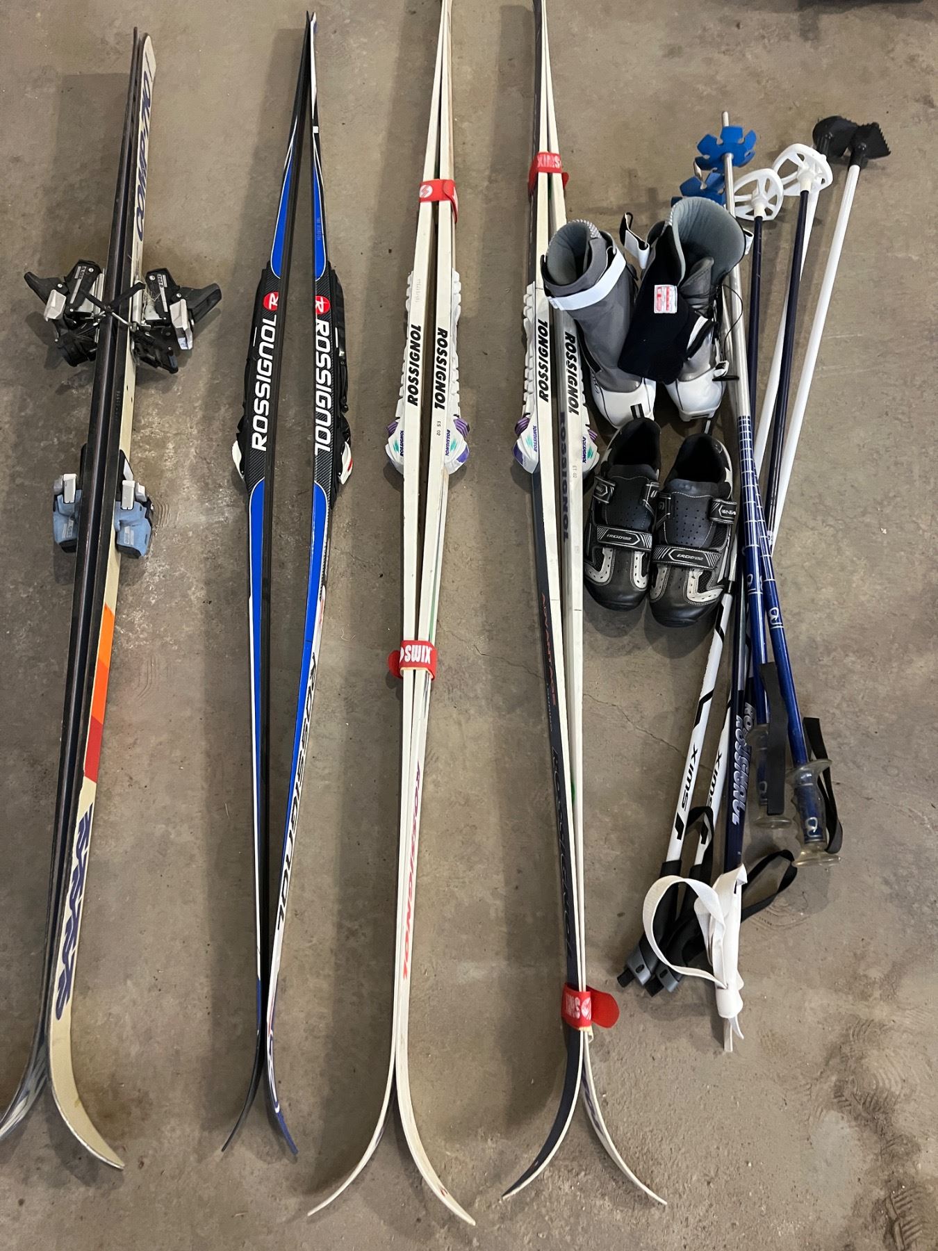 Includes a variety of skins and poles, two pairs of ski boots size 7 and 44, longest set of skis is 76"L