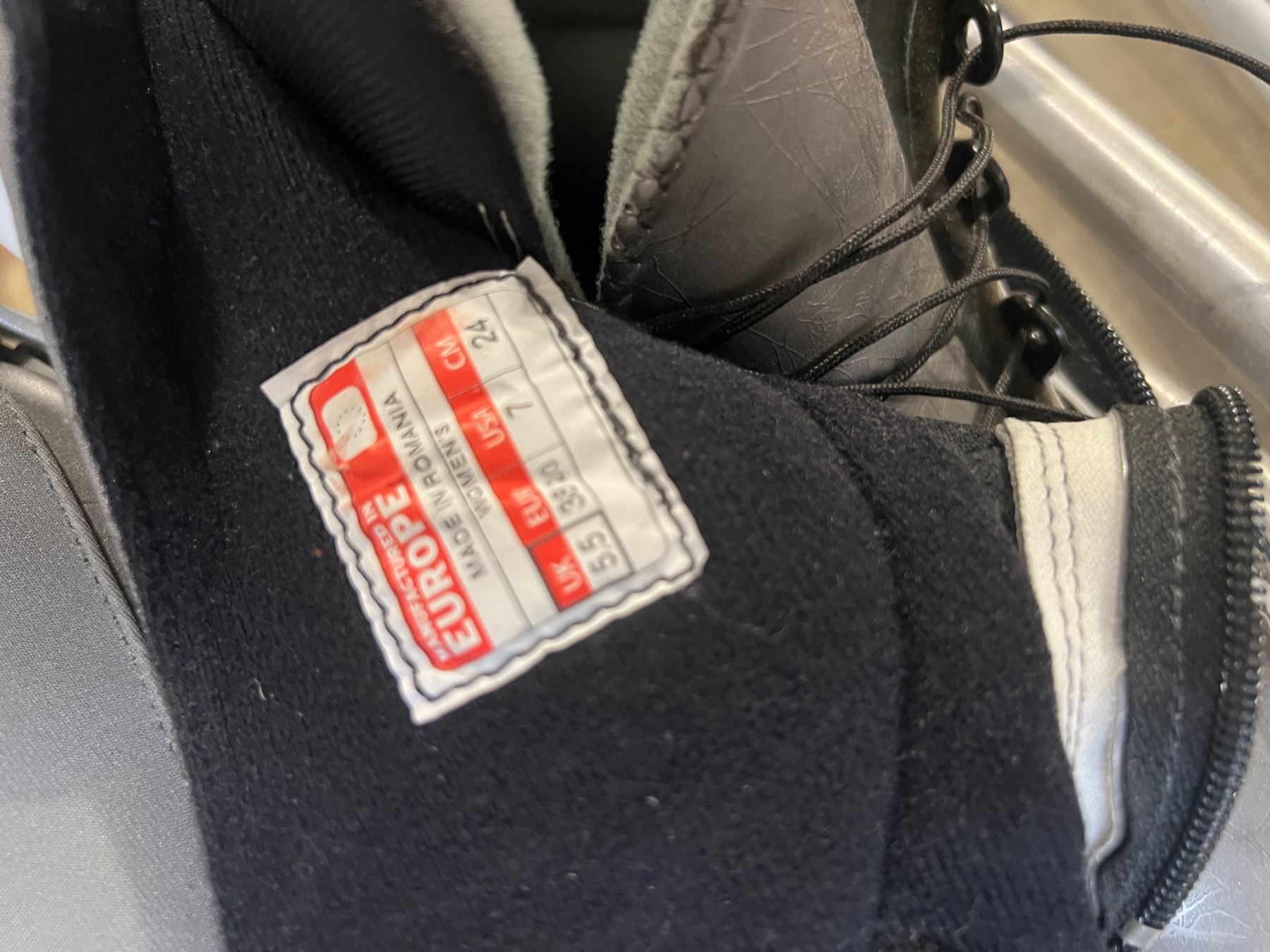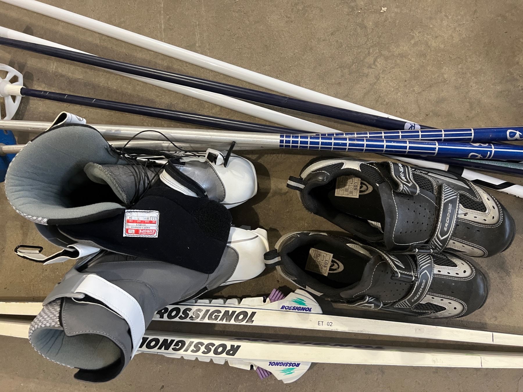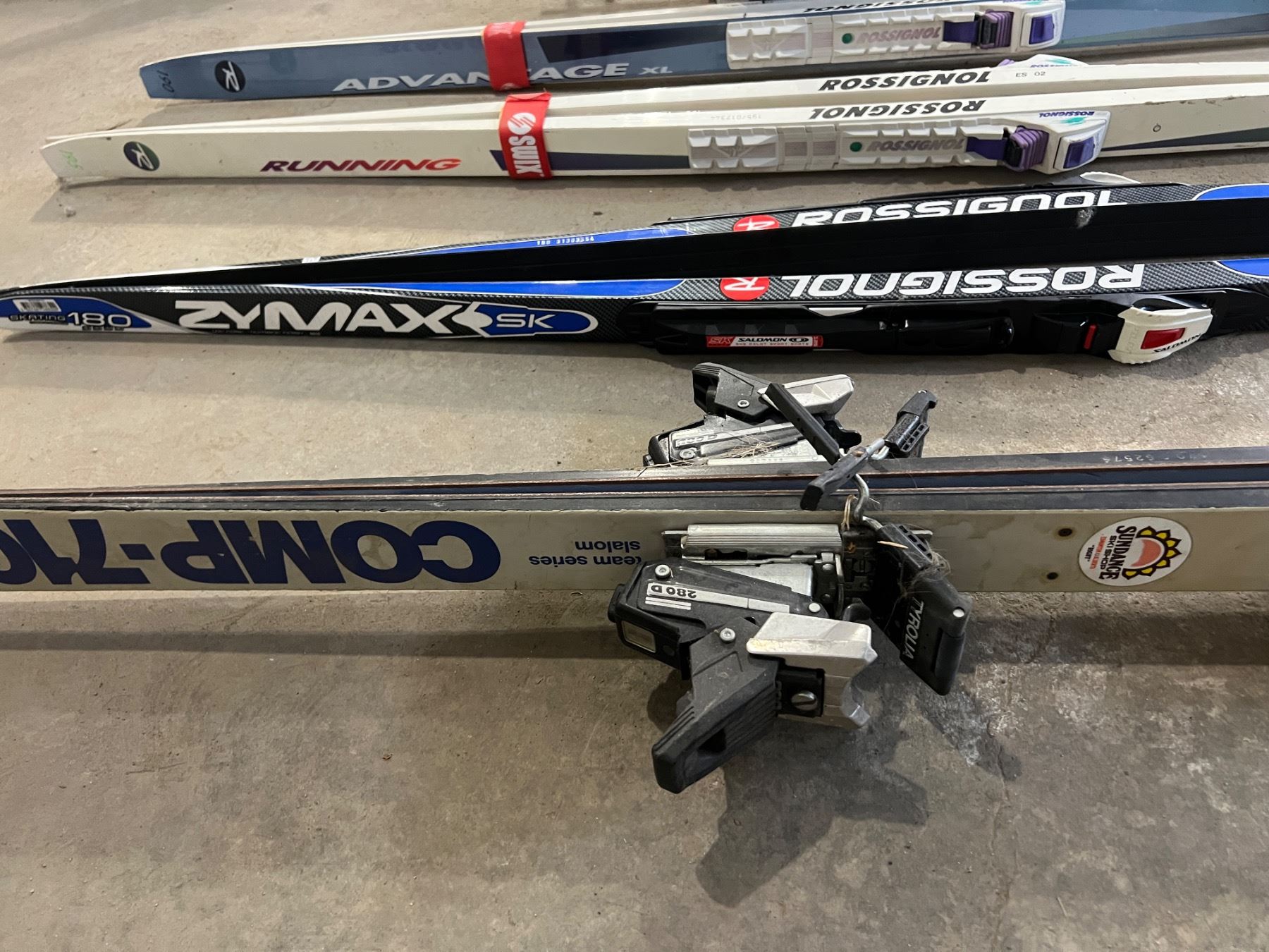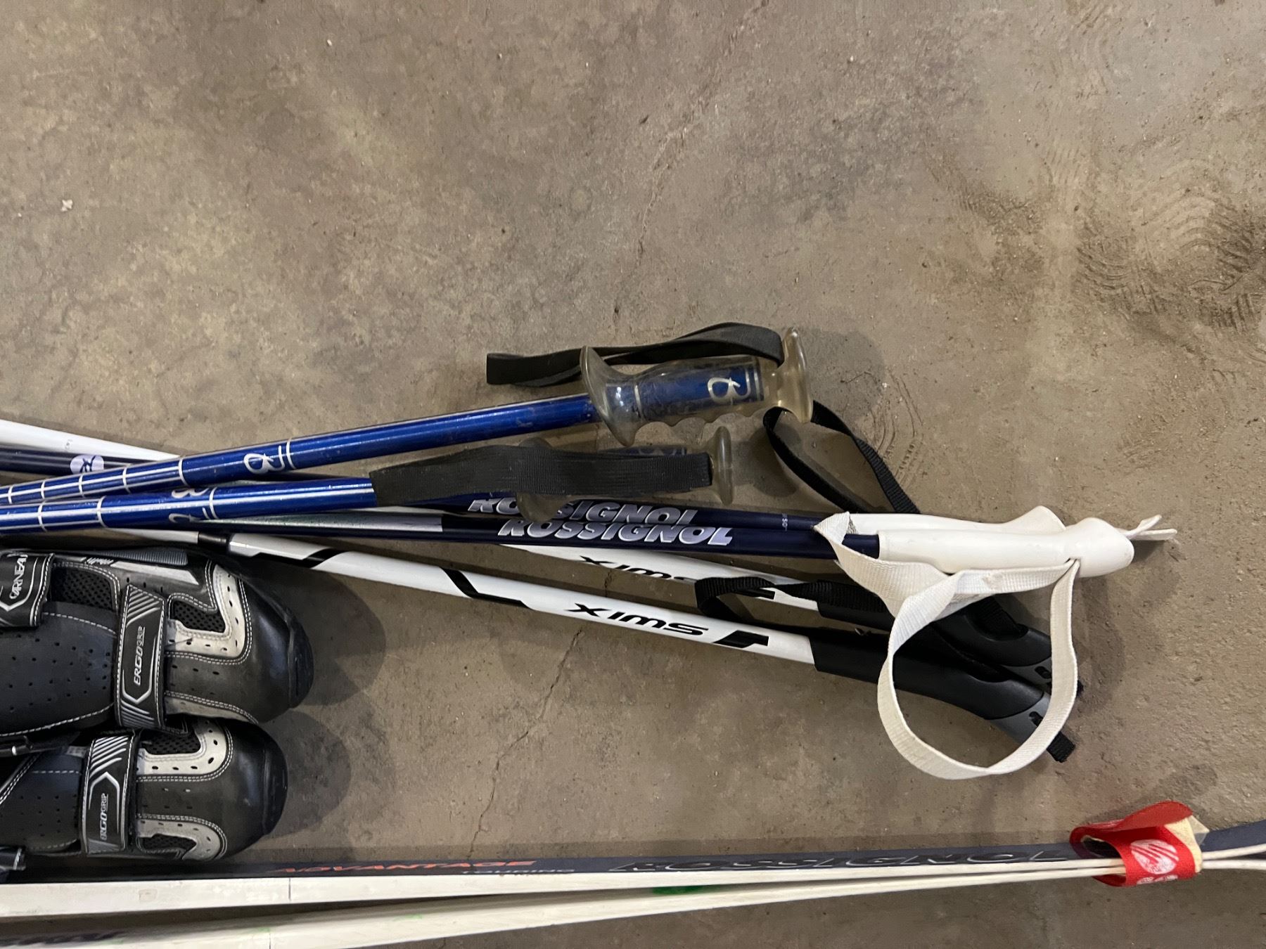 Includes a variety of skins and poles, two pairs of ski boots size 7 and 44, longest set of skis is 76"L