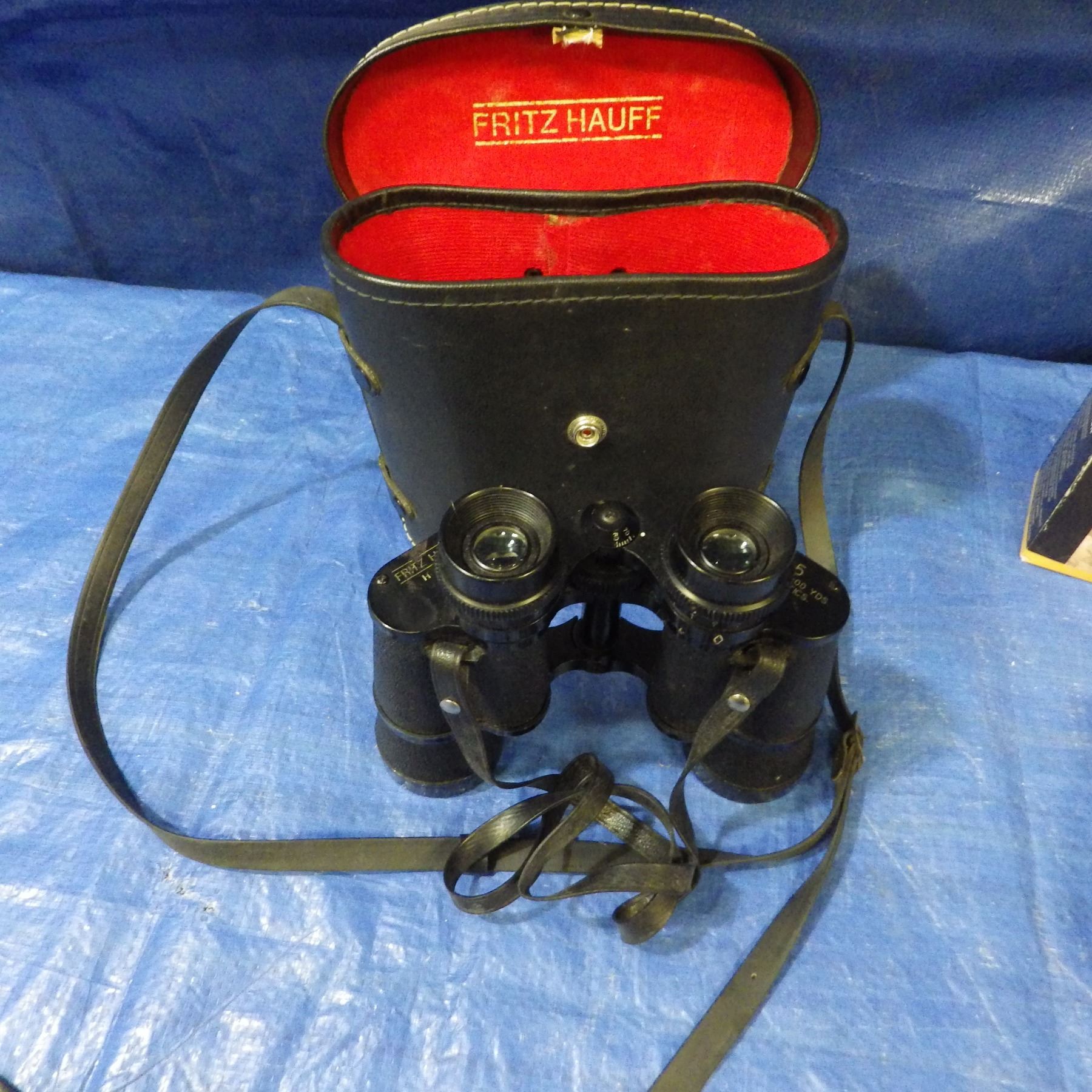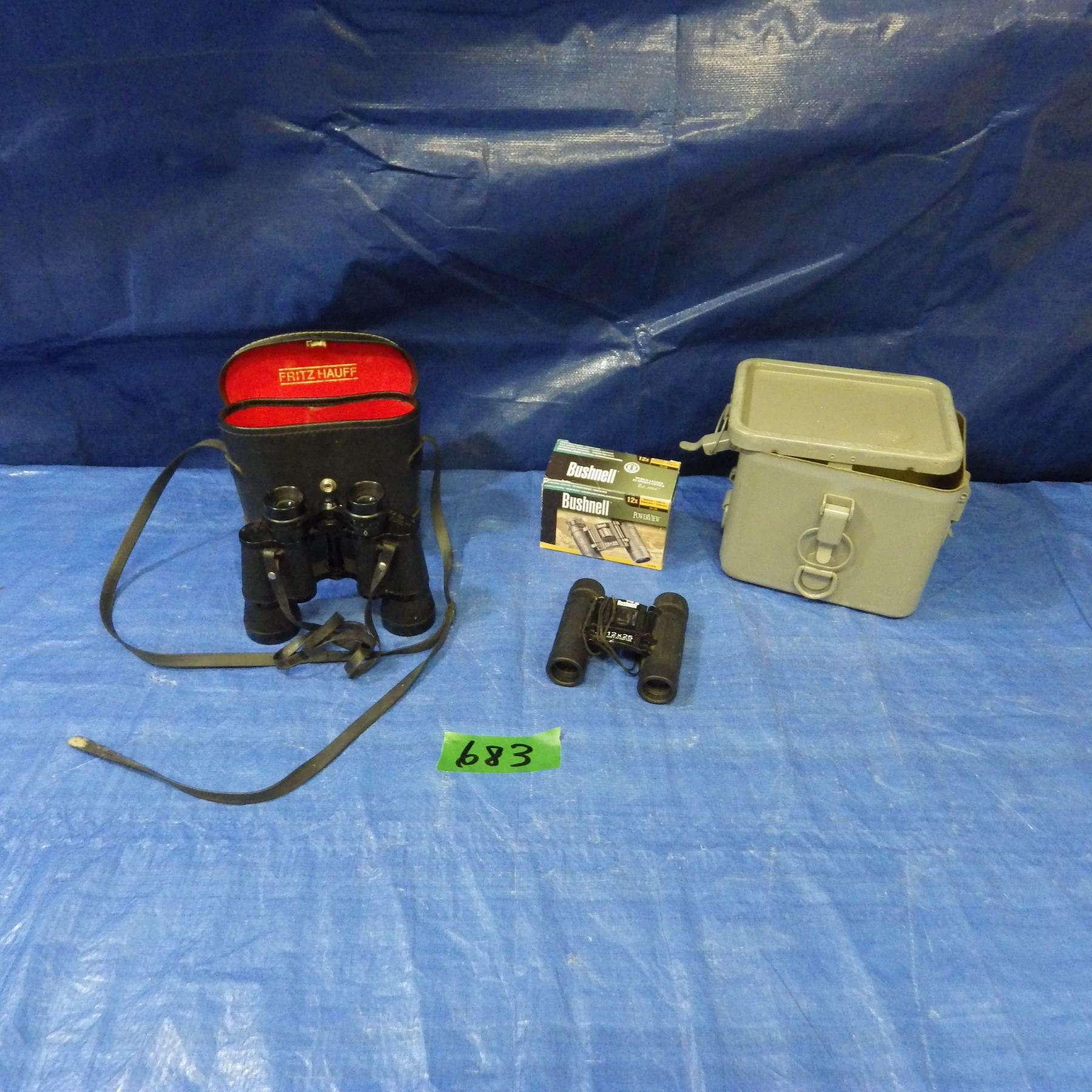 Lot 683 BINOCULARS AND METAL CONTAINER