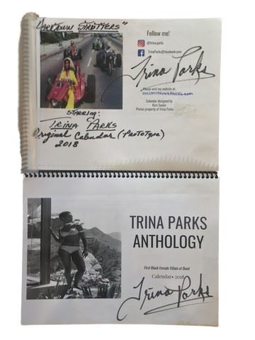 Trina Parks signed 2018 calendar and original prototype calendar with photos. Trina Parks was the first African American singer and dancer featured in the Palm Springs Follies for 6 years from 2002-2008. Features photos of her singing "Jip-Jam-Jive". Trina Parks received President Obama's Lifetime Achievement Award in 2016. She has been featured in Essence Magazine in the article "Black Women of Bond" Tribute photo shoot.